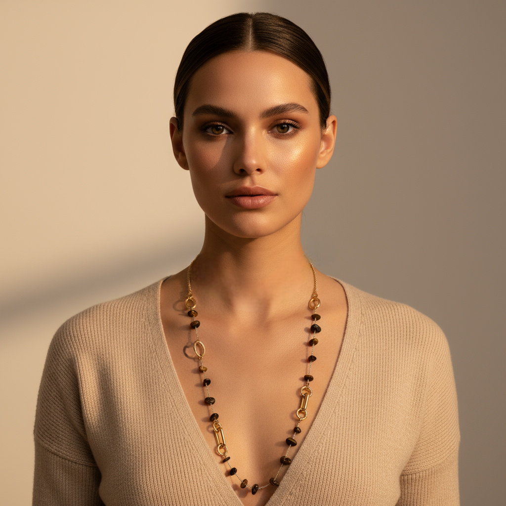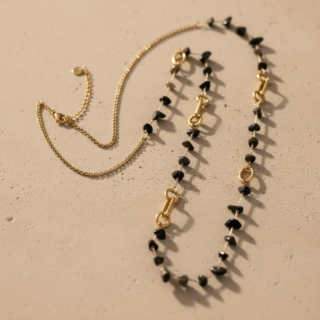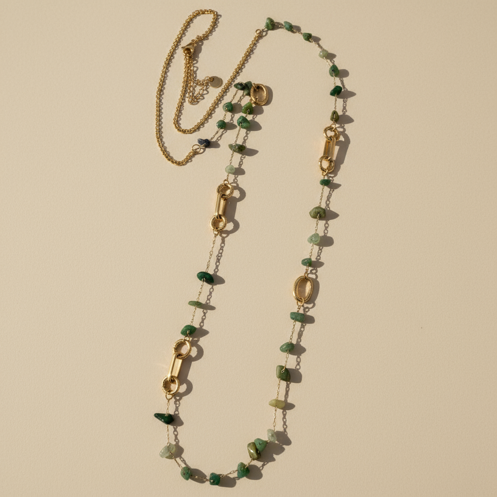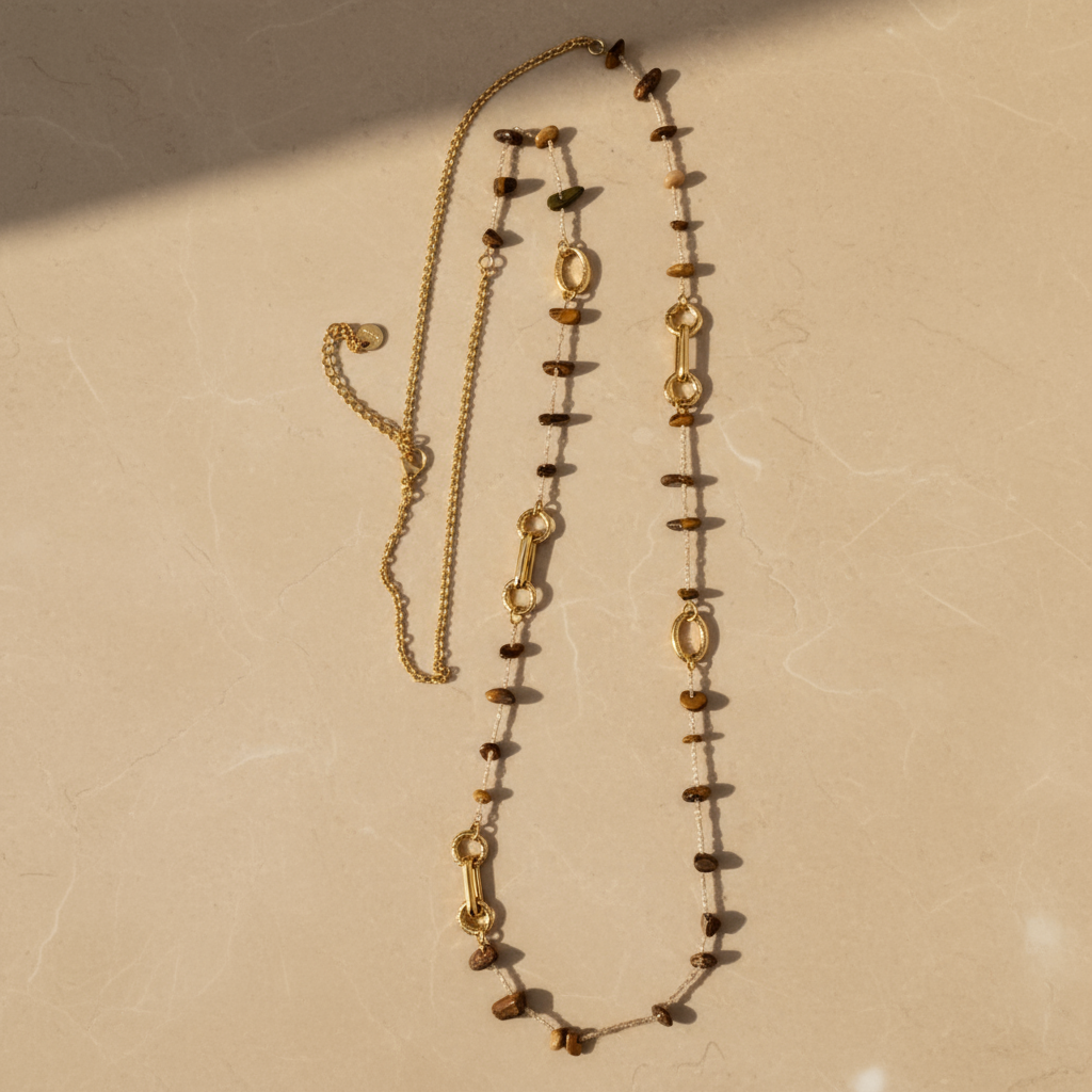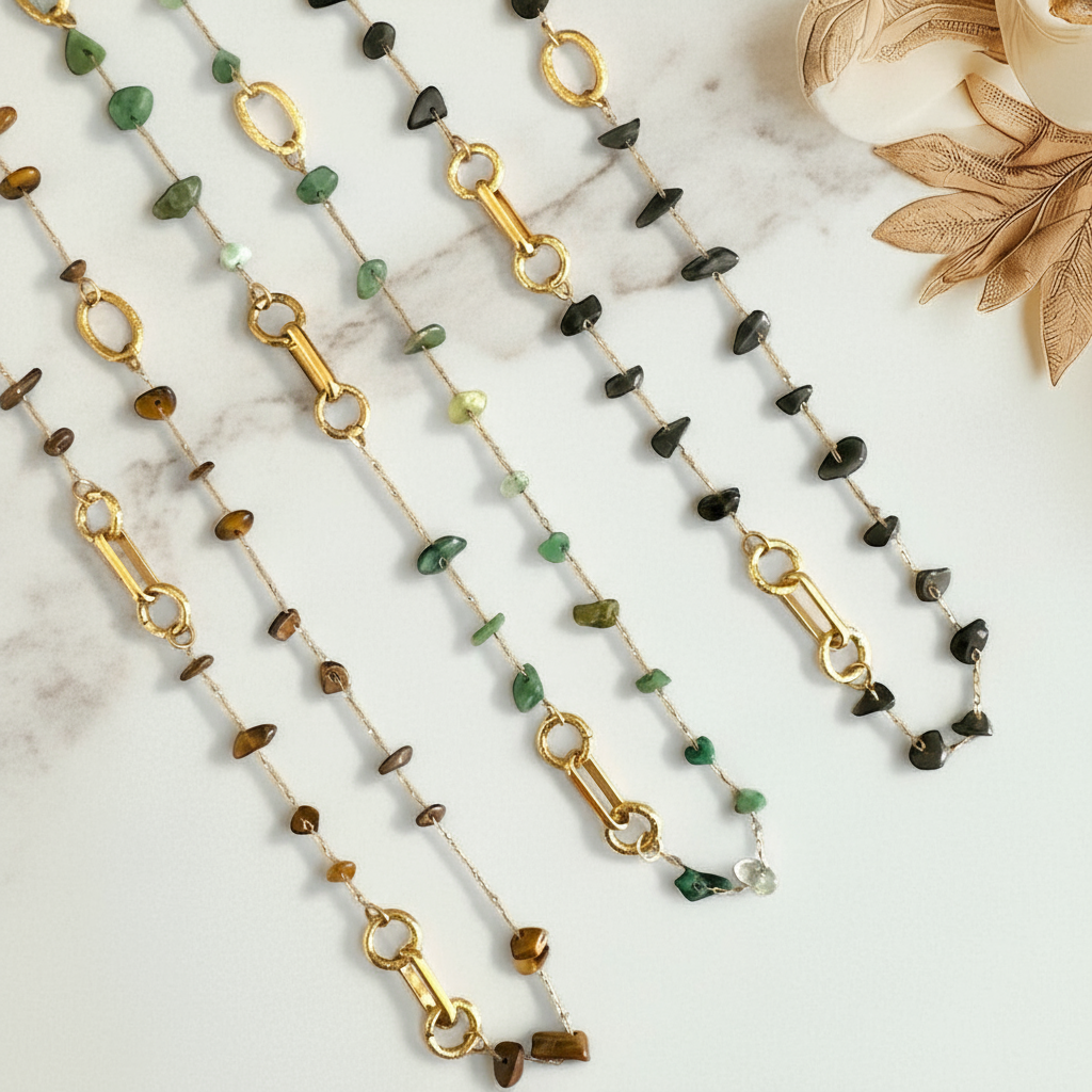 🌟 Semi Precious Chips Necklace – Ημίμακρο Κολιέ με Ημιπολύτιμες Πέτρες & Ατσάλινα Στοιχεία