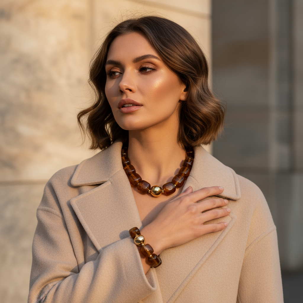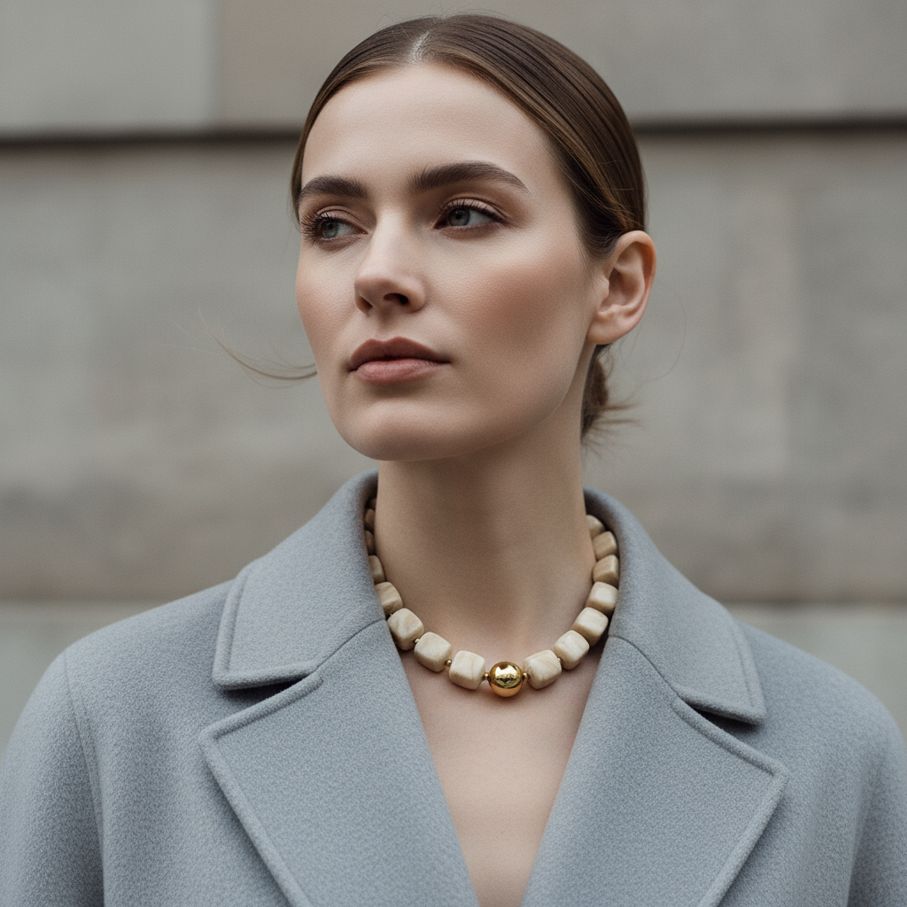 Το κολιέ αποτελείται από τετραγωνισμένες χάντρες σε γήινες αποχρώσεις μπεζ και καφέ, ενώ στο κέντρο του ξεχωρίζει η χρυσή στρογγυλή λεπτομέρεια που δίνει luxurious χαρακτήρα.