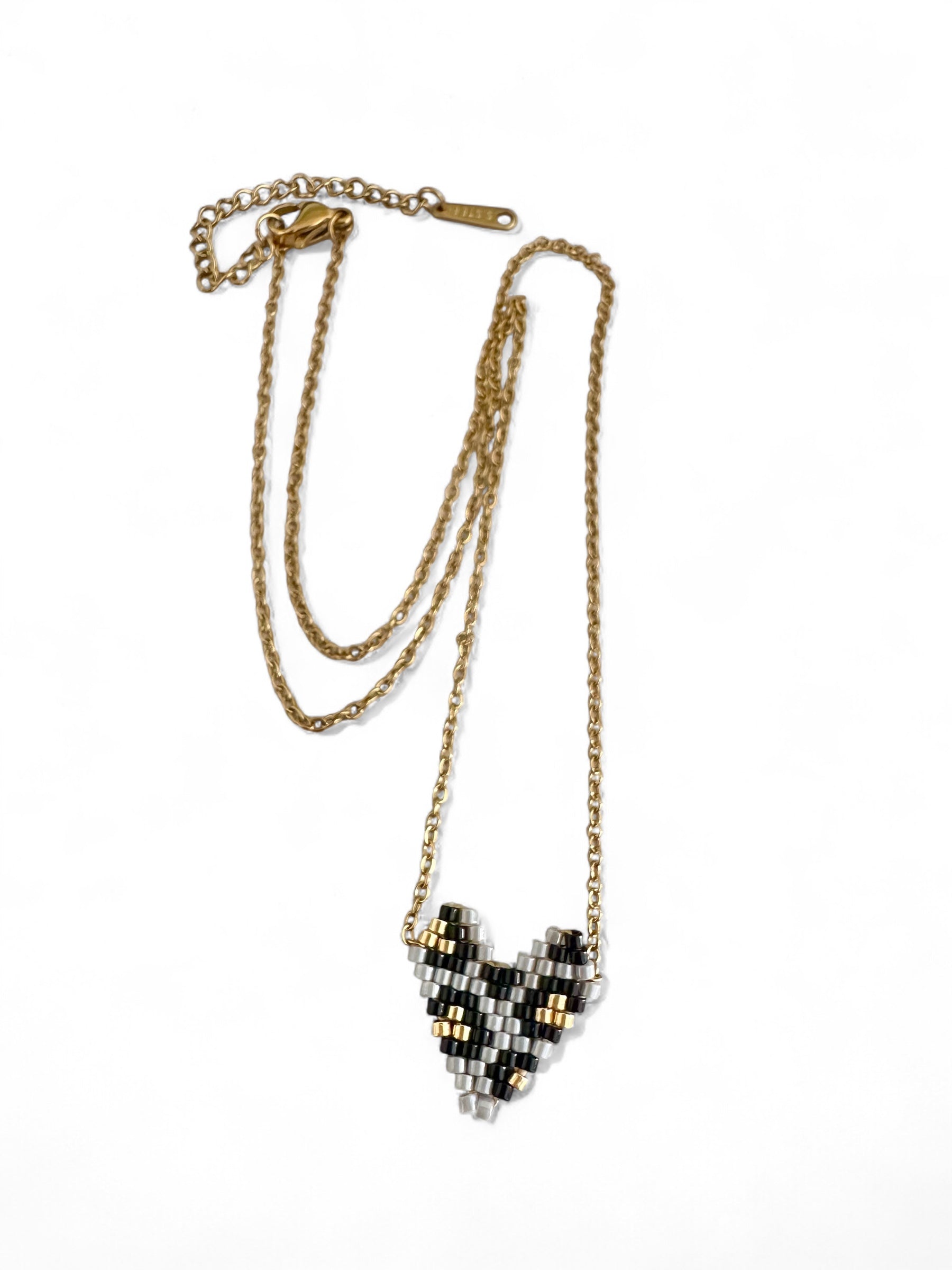 Το Wild Heart είναι το κολιέ που παντρεύει τη γοητεία της καρδιάς με την ένταση του animal print. Το μοτίφ καρδιά είναι φτιαγμένο από χάντρες Miyuki σε γήινες και μεταλλικές αποχρώσεις, που θυμίζουν leopard & zebra patterns, κρεμασμένο σε ατσάλινη αλυσίδα. Ένα fashion statement κόσμημα που δίνει στο look σου τολμηρό αλλά και κομψό χαρακτήρα.