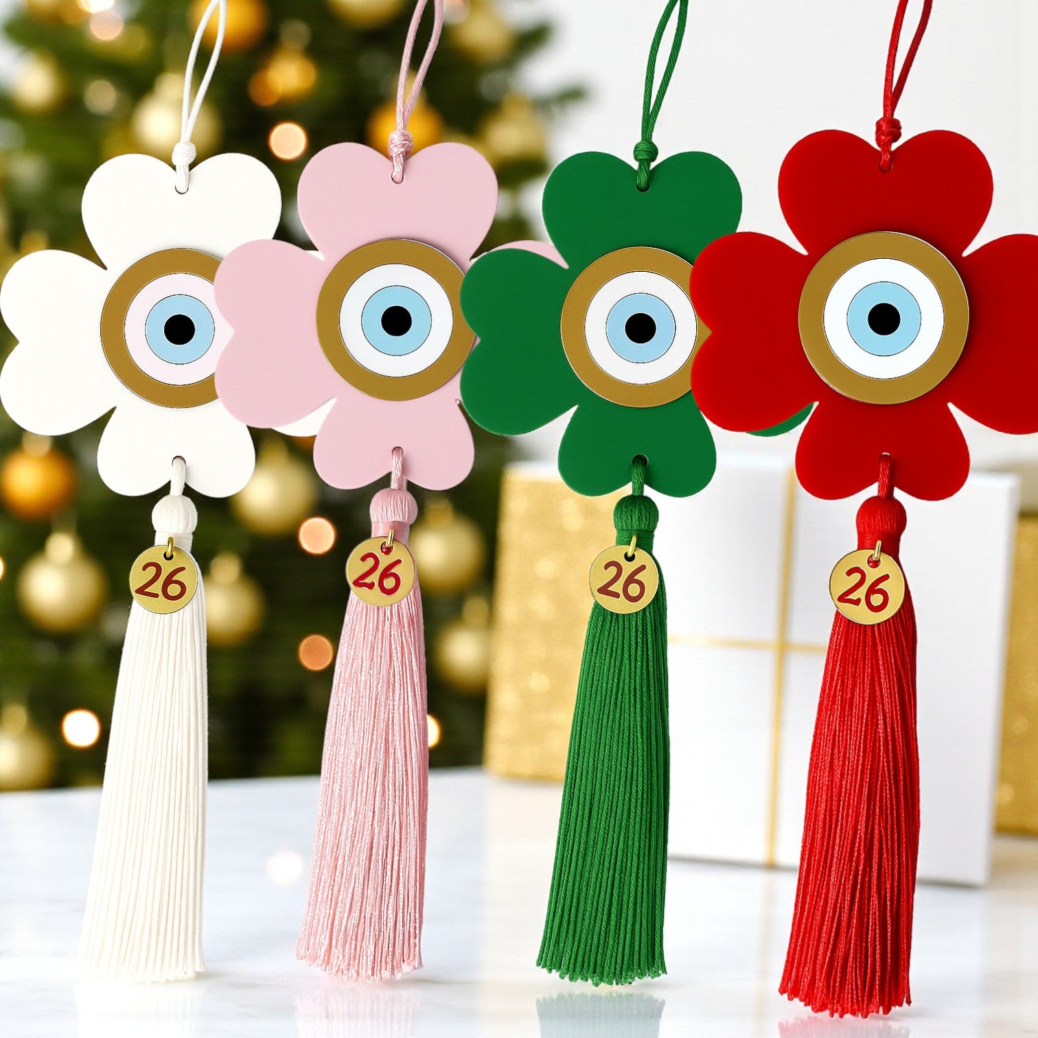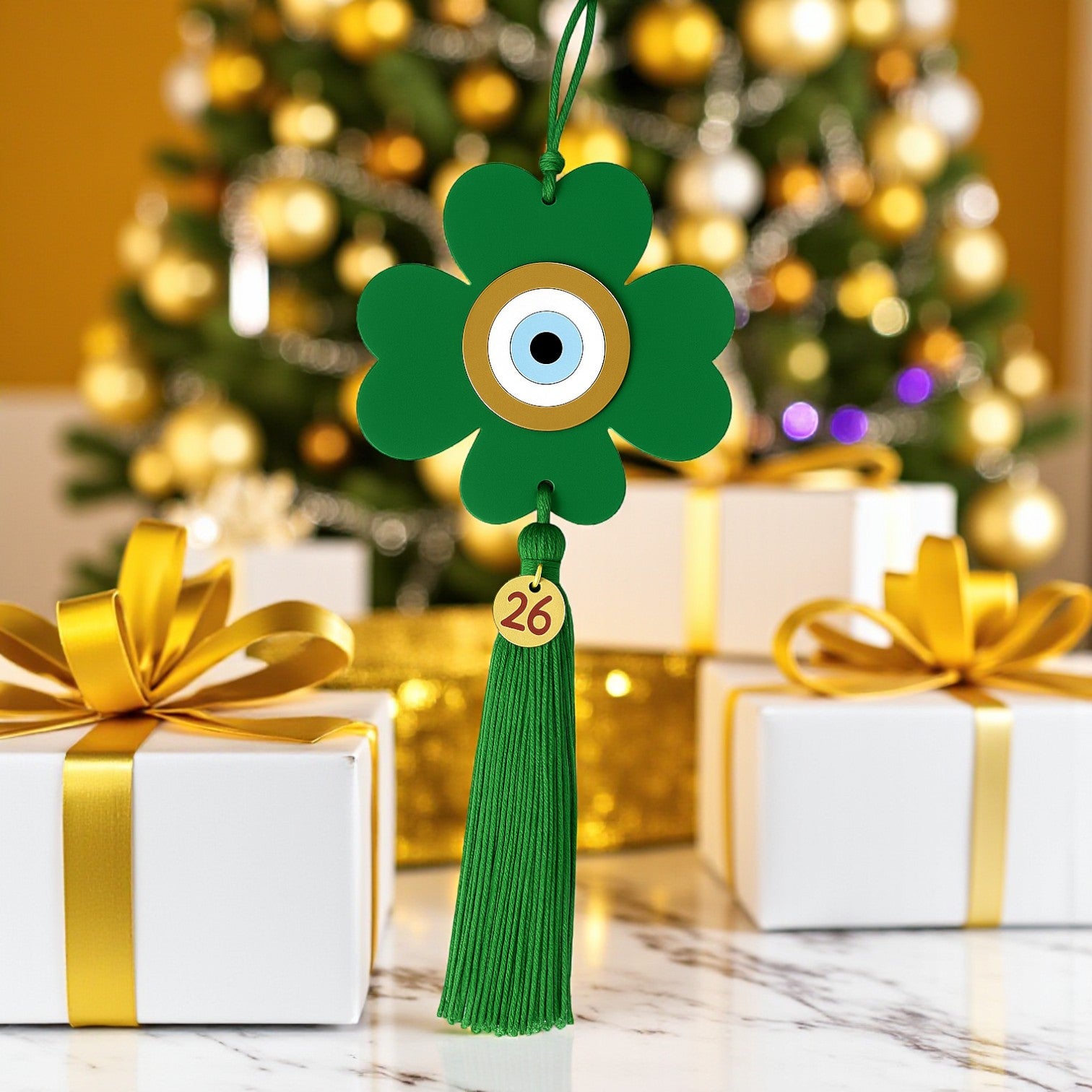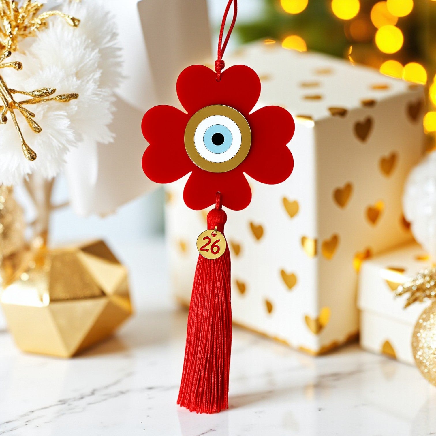 Γούρι 2026 Τετράφυλλο με Μάτι & Φούντα | Χειροποίητο Κρεμαστό Plexiglass