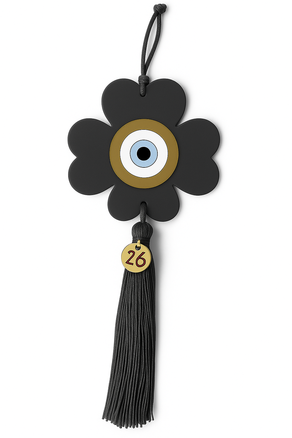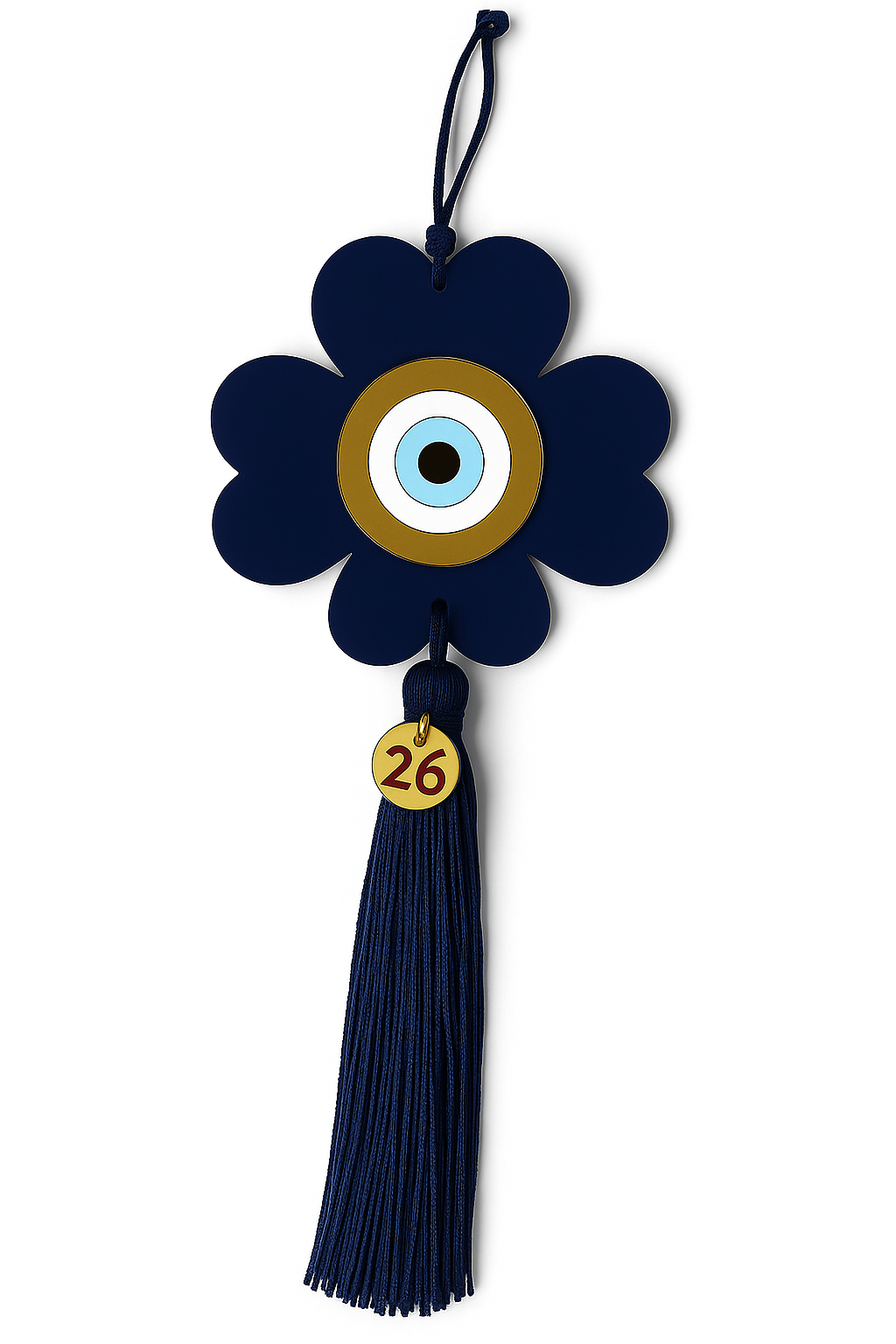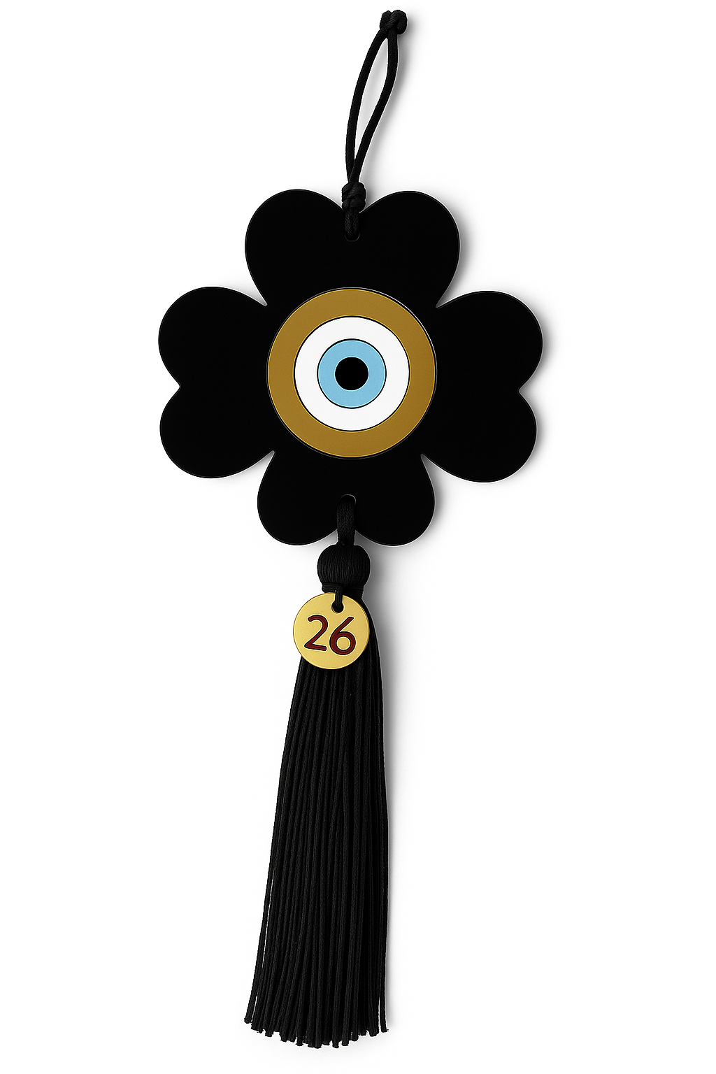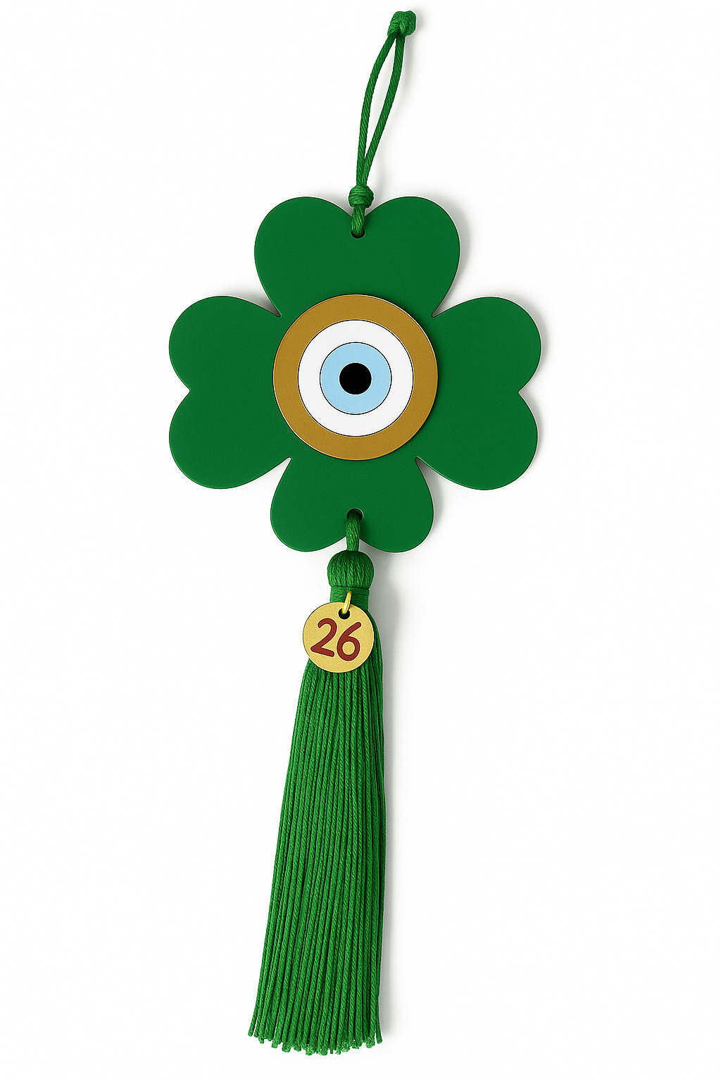 Φέρε τύχη και θετική ενέργεια στη νέα χρονιά με το χειροποίητο γούρι 2026 σε σχήμα τετράφυλλου με μάτι. Κατασκευασμένο από πολυτελές plexiglass 3mm με απλικέ μάτι από καθρέφτη, στολίζεται με εντυπωσιακή φούντα μήκους 8 εκ. και κρεμαστό tag “26” από χρυσό καθρέφτη. Ένα δυναμικό φυλαχτό που συνδυάζει την προστασία του ματιού με το συμβολισμό του τετράφυλλου τριφυλλιού.