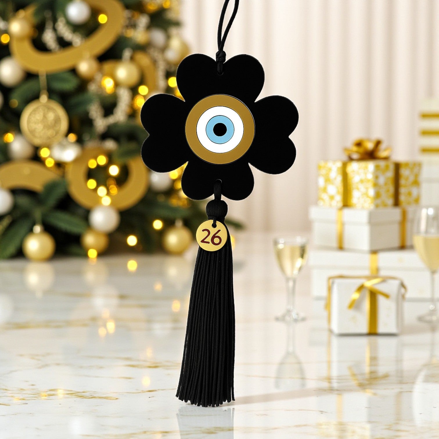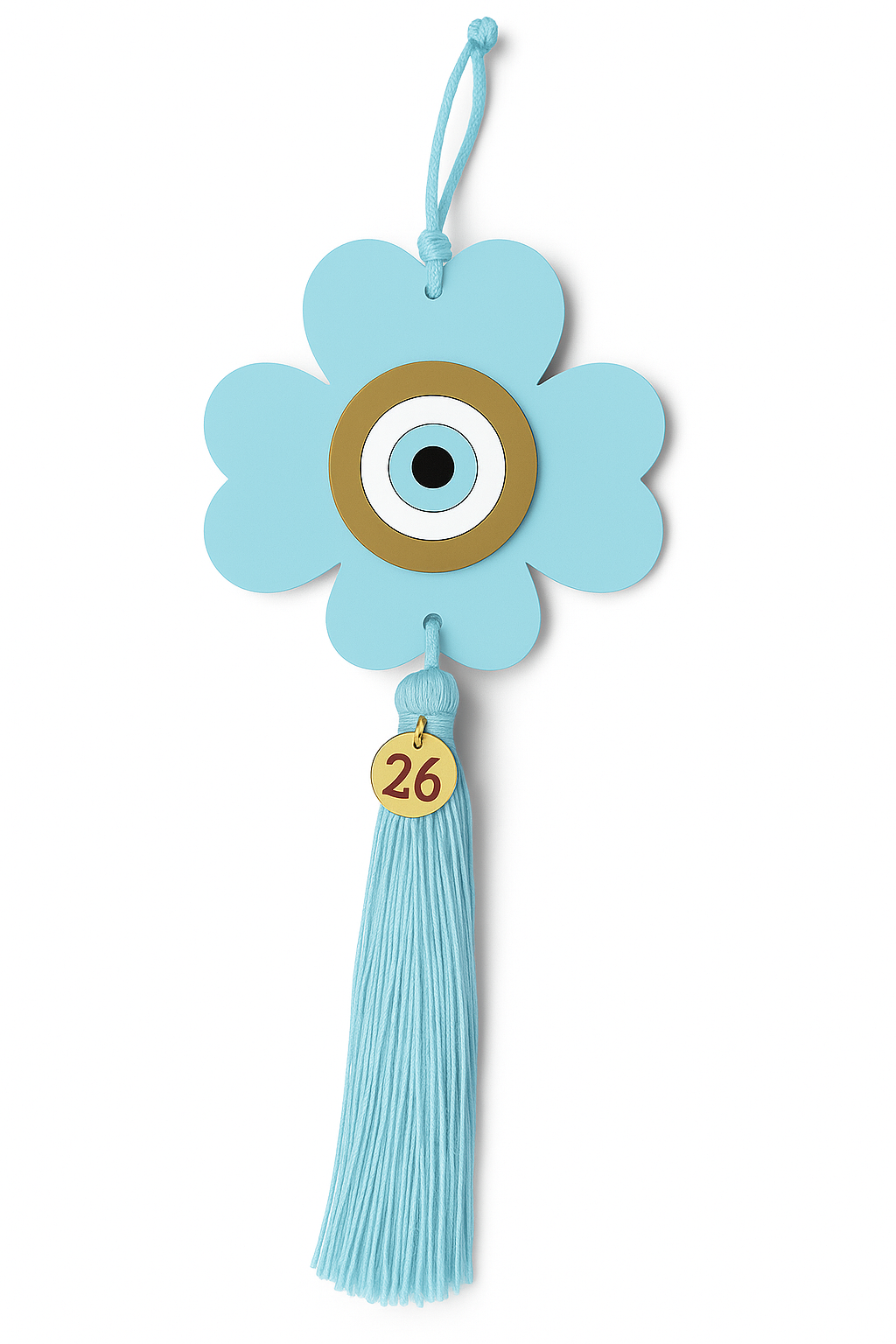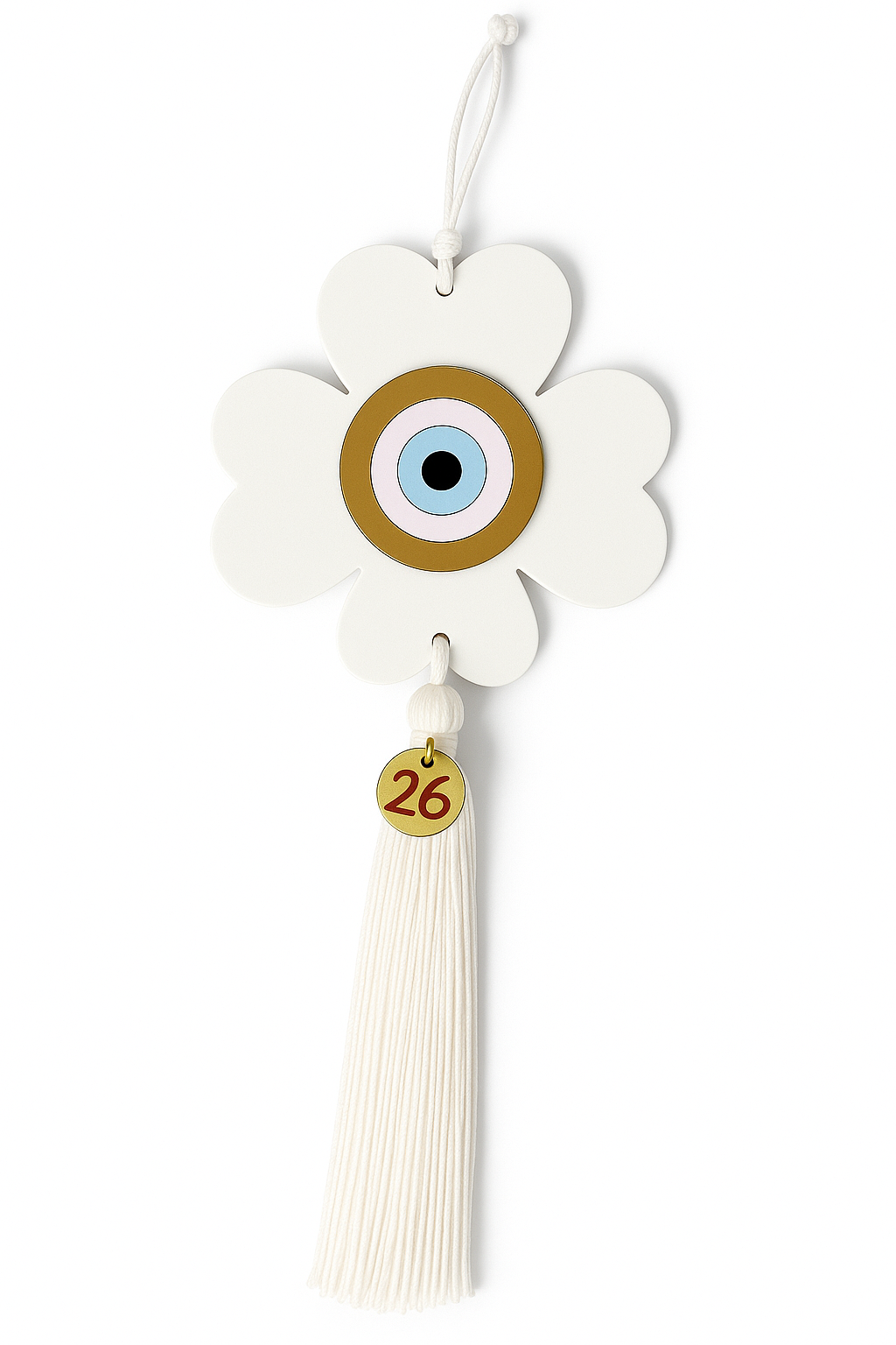 Φέρε τύχη και θετική ενέργεια στη νέα χρονιά με το χειροποίητο γούρι 2026 σε σχήμα τετράφυλλου με μάτι. Κατασκευασμένο από πολυτελές plexiglass 3mm με απλικέ μάτι από καθρέφτη, στολίζεται με εντυπωσιακή φούντα μήκους 8 εκ. και κρεμαστό tag “26” από χρυσό καθρέφτη. Ένα δυναμικό φυλαχτό που συνδυάζει την προστασία του ματιού με το συμβολισμό του τετράφυλλου τριφυλλιού.