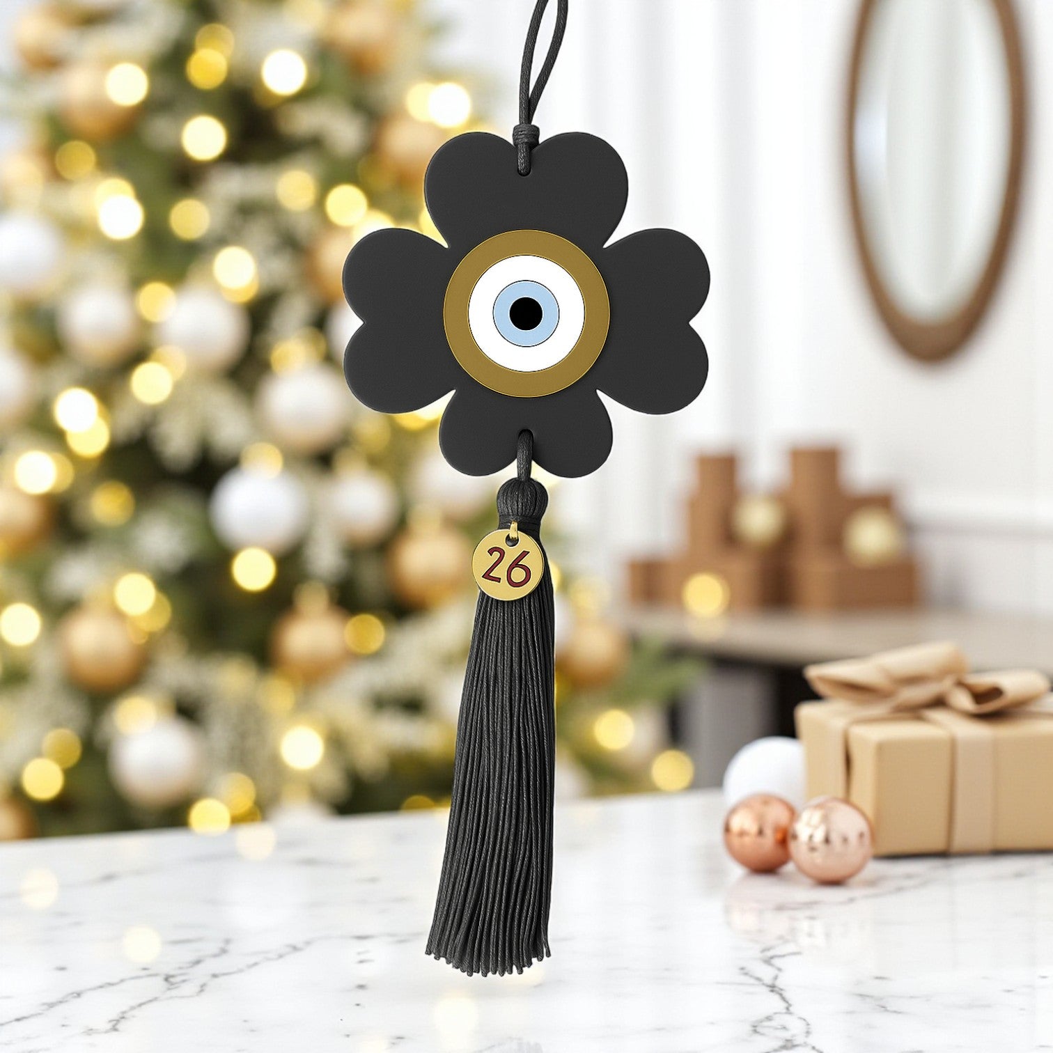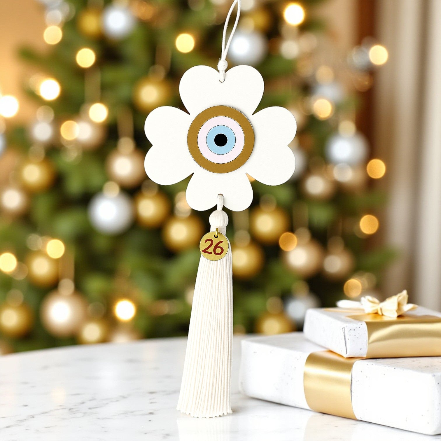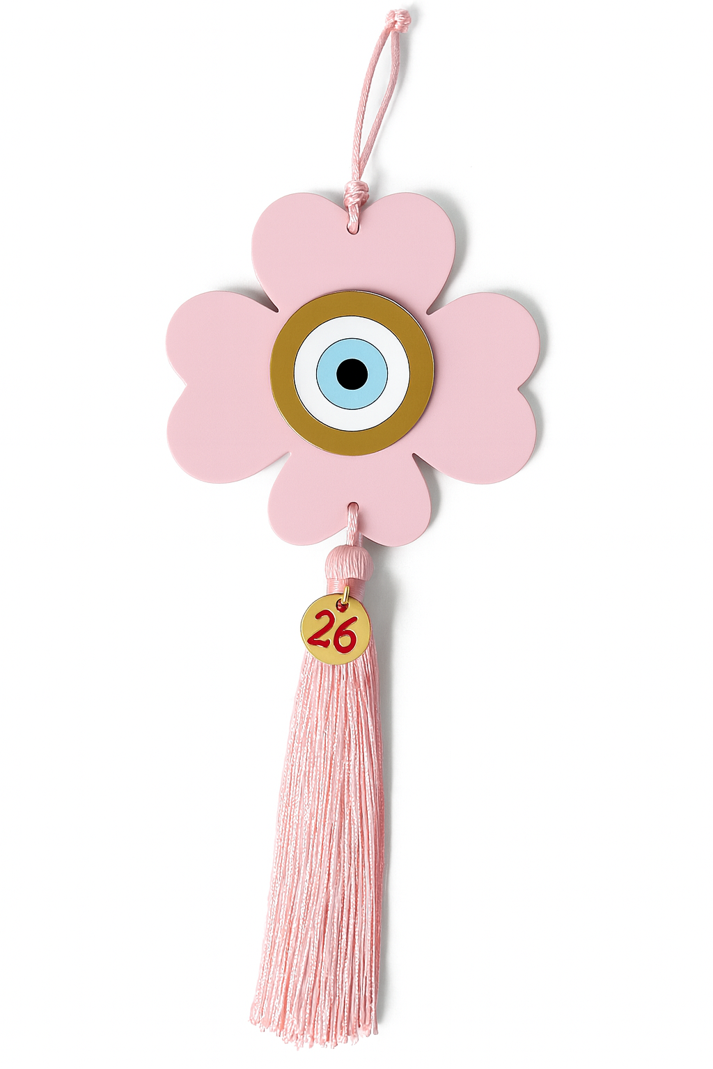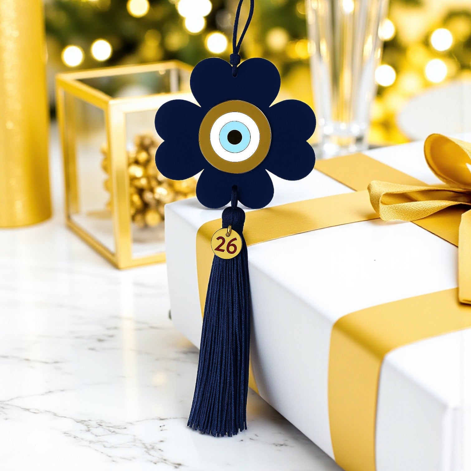 Φέρε τύχη και θετική ενέργεια στη νέα χρονιά με το χειροποίητο γούρι 2026 σε σχήμα τετράφυλλου με μάτι. Κατασκευασμένο από πολυτελές plexiglass 3mm με απλικέ μάτι από καθρέφτη, στολίζεται με εντυπωσιακή φούντα μήκους 8 εκ. και κρεμαστό tag “26” από χρυσό καθρέφτη. Ένα δυναμικό φυλαχτό που συνδυάζει την προστασία του ματιού με το συμβολισμό του τετράφυλλου τριφυλλιού.