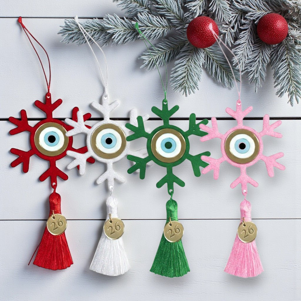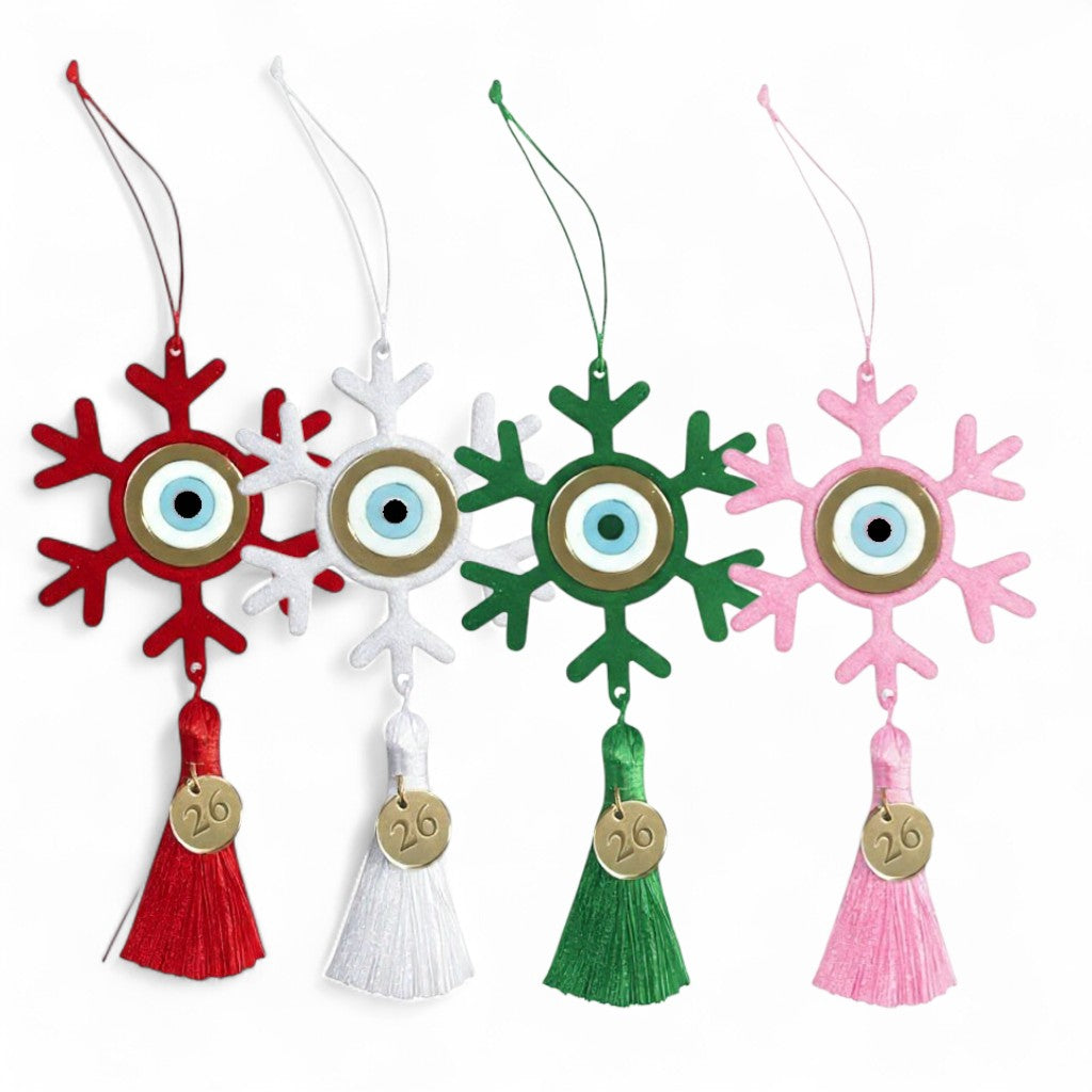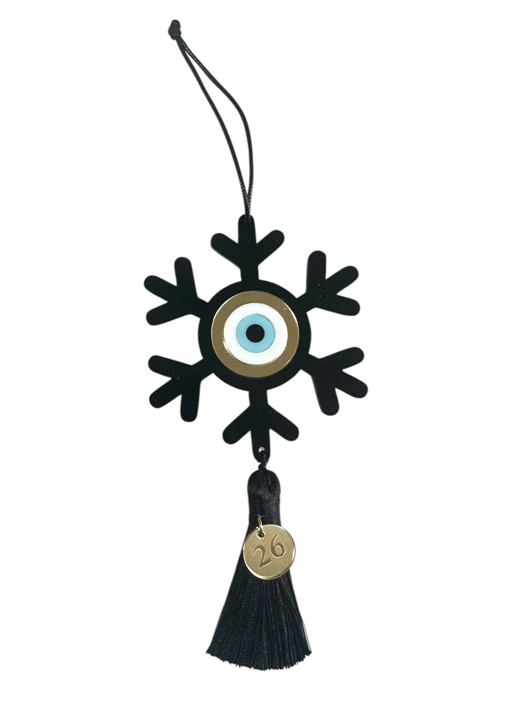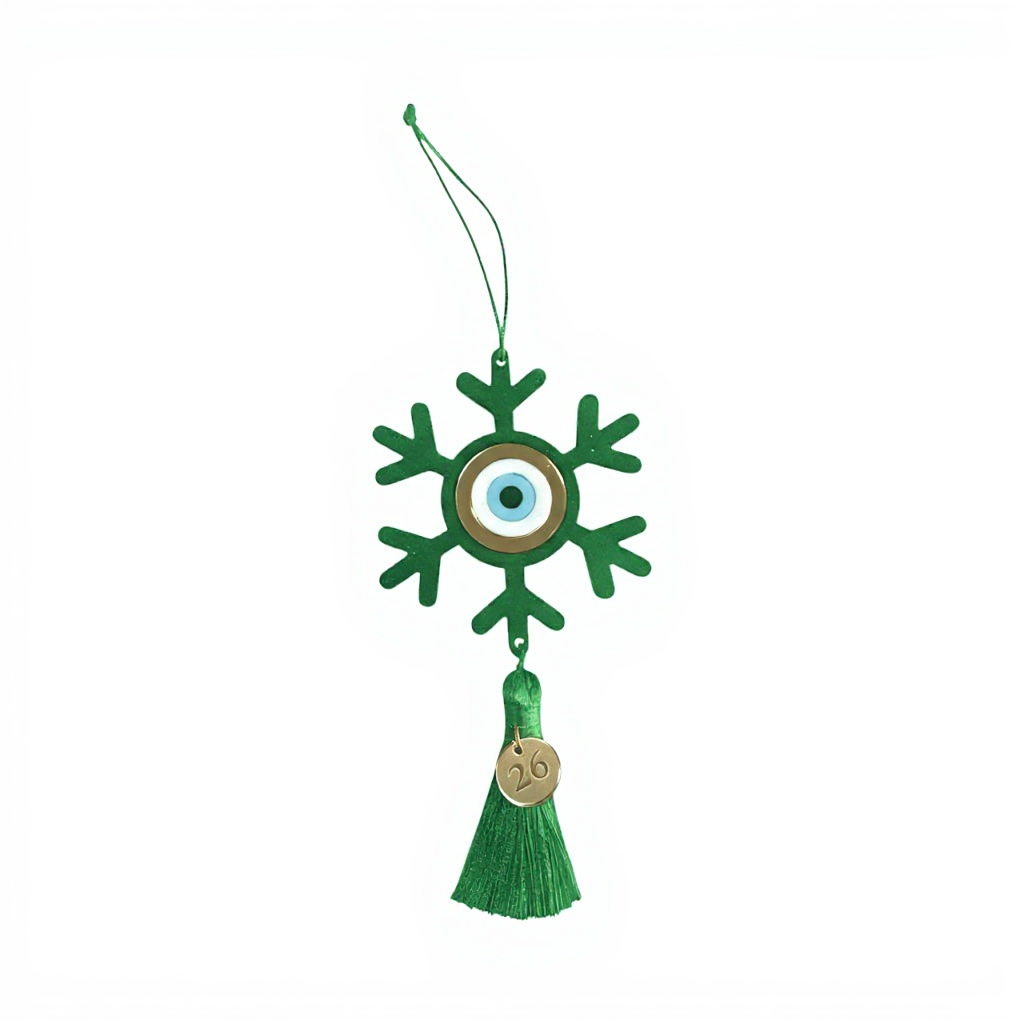 Χειροποίητο κρεμαστό γούρι 2026 σε σχήμα νιφάδας, με κεντρικό στοιχείο μάτι προστασίας και πολυτελή φούντα. Κατασκευασμένο από plexiglass υψηλής ποιότητας, διαθέσιμο σε πολλαπλά χρώματα (γκρι, μαύρο, λευκό, κόκκινο, πράσινο, ροζ, γαλάζιο και σκούρο μπλε). Το κρεμαστό μοτίφ "26" από χρυσό plexiglass καθρέφτη ολοκληρώνει την εορταστική αισθητική.