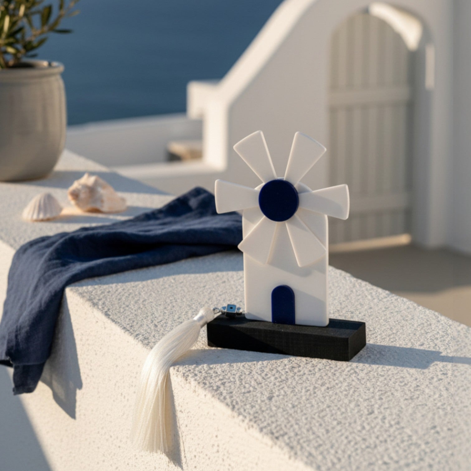 Το επιτραπέζιο γούρι Anemomylo της συλλογής MORPHES από το So Cute by Dimi είναι εμπνευσμένο από την παραδοσιακή αρχιτεκτονική των Κυκλάδων. Ο λευκός ανεμόμυλος με τις χαρακτηριστικές φτερωτές αποπνέει νησιωτική καθαρότητα, ενώ η διακοσμητική λευκή φούντα και ο μεταλλικός κύβος με ματάκι προσθέτουν σύγχρονο χαρακτήρα και προστατευτικό συμβολισμό.