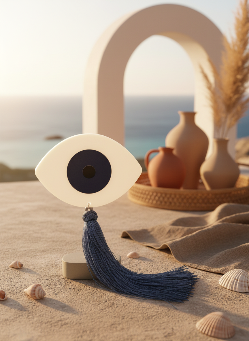 Το επιτραπέζιο γούρι Ofthalmos από τη συλλογή MORPHES του So Cute by Dimi συνδυάζει την απλότητα του design με την παραδοσιακή δύναμη του ματιού. Φτιαγμένο από διπλό πλεξιγκλάς και τοποθετημένο σε ξύλινη βάση, διακοσμείται με μια εντυπωσιακή, μακριά φούντα που ενισχύει τον χαρακτήρα του. Ένα κομψό διακοσμητικό που αποπνέει αρμονία και προστασία.
