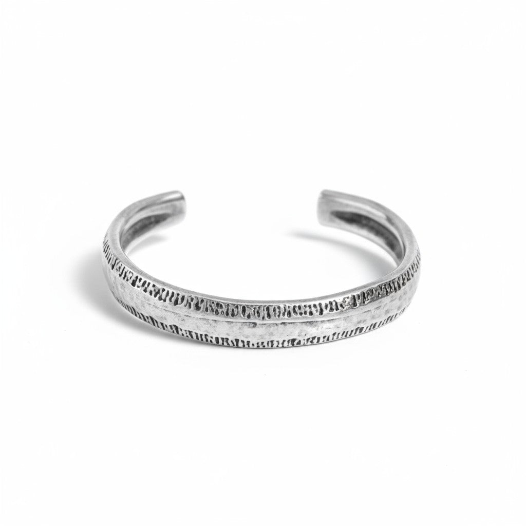 Ένα ανδρικό βραχιόλι από κασσίτερο, με ανάγλυφη υφή και αντικέ φινίρισμα που θυμίζει χειροποίητο σφυρήλατο μέταλλο.