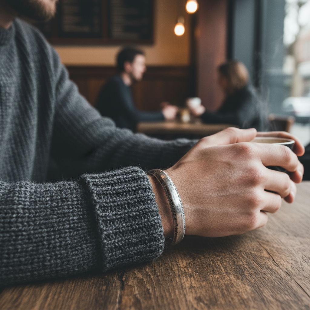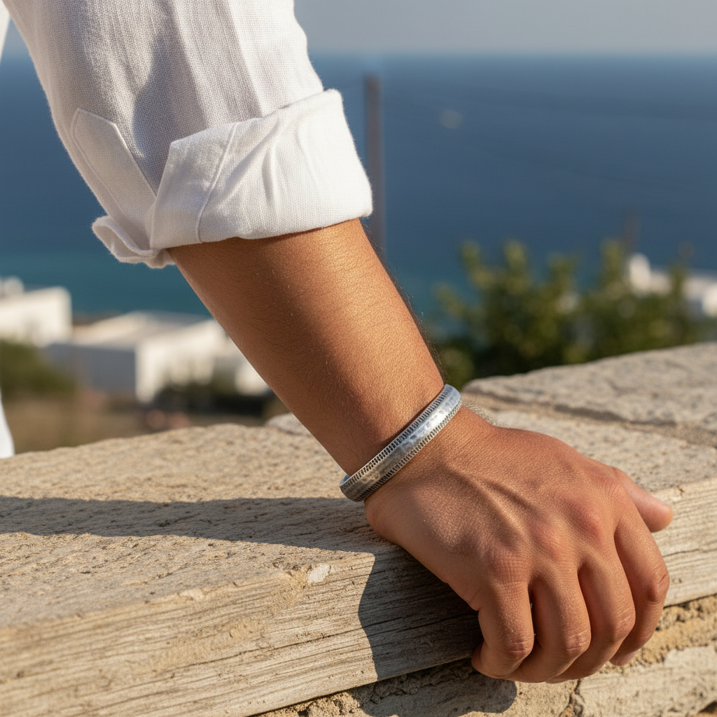 Φόρεσέ το μόνο του ή δίπλα σε δερμάτινο βραχιόλι για urban layering. Ταιριάζει απόλυτα με λινό πουκάμισο, πλεκτό ή overshirt.