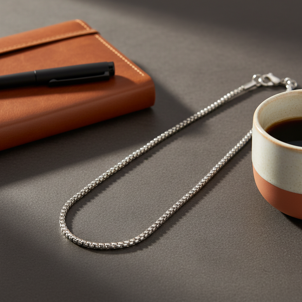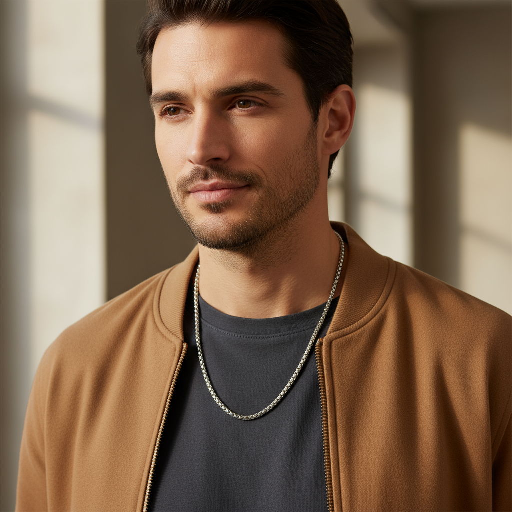 Μια καθαρή, minimal ατσάλινη ανδρική αλυσίδα μήκους 60cm που φοριέται εύκολα με όλα τα καθημερινά outfits. Η κλασική box chain δίνει μια διακριτική αλλά στιβαρή μεταλλική λεπτομέρεια που αναβαθμίζει το look χωρίς υπερβολές.