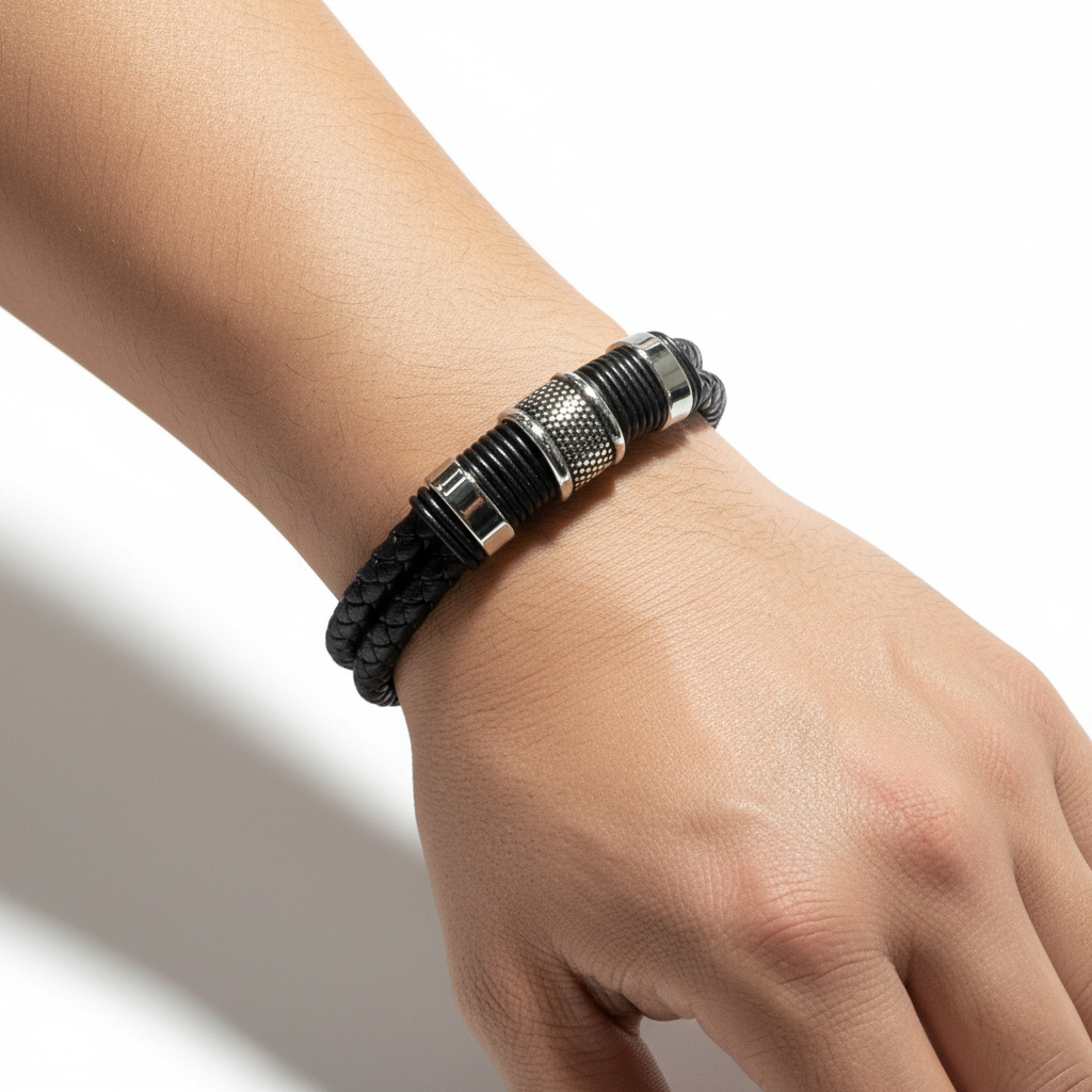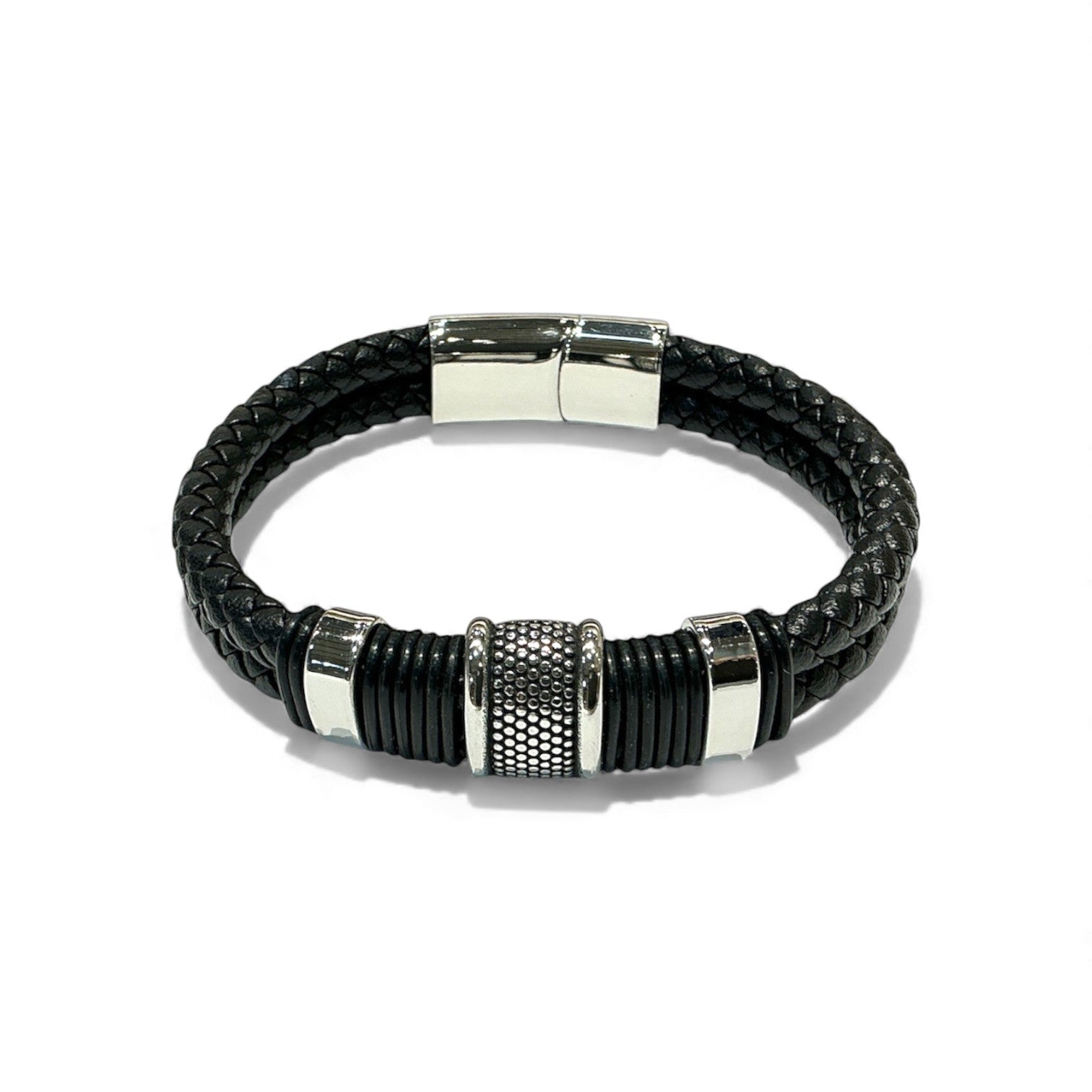 Ανδρικό βραχιόλι με διπλό πλεκτό λουρί σε μαύρο ματ φινίρισμα και εντυπωσιακό κεντρικό στοιχείο από ατσάλι.