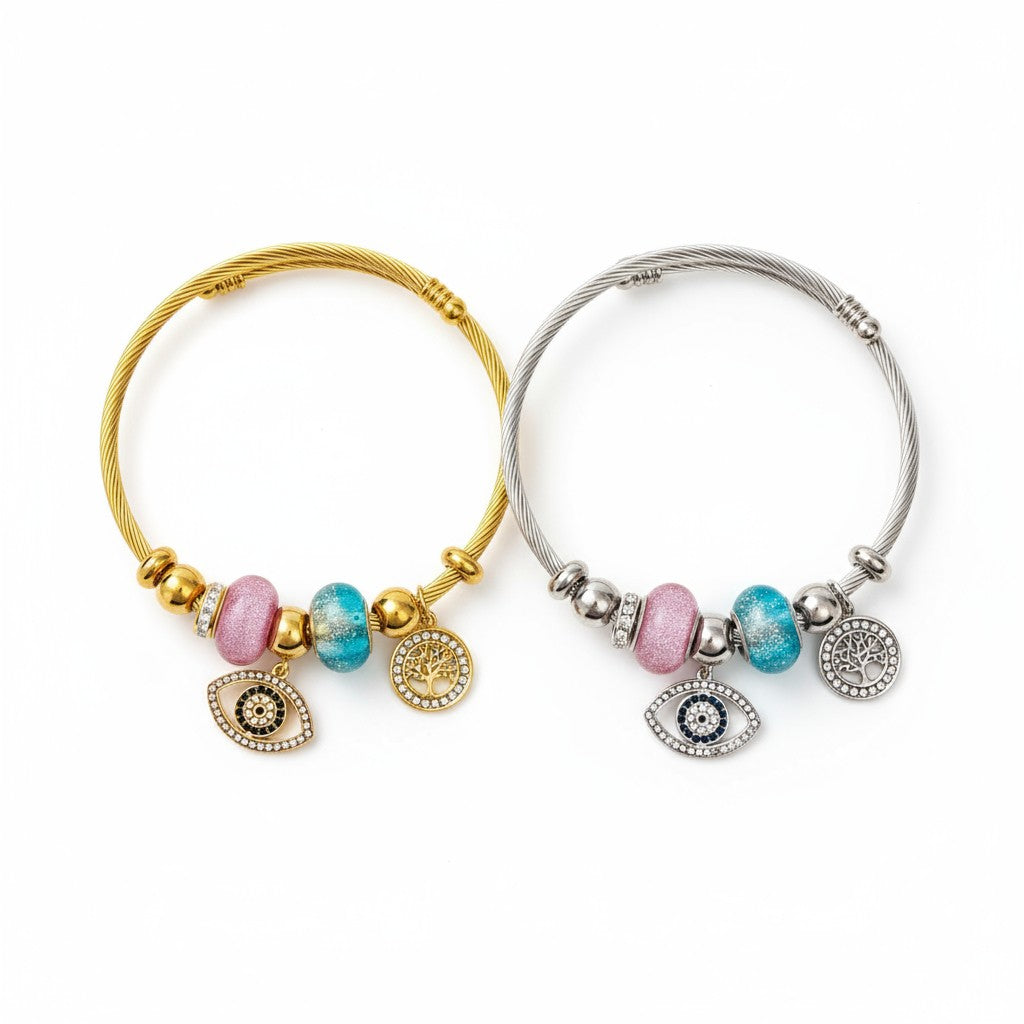 Το Tree of Life & Eye είναι ατσάλινο βραχιόλι σε twisted σχέδιο με λαμπερές χάντρες σε ροζ και γαλάζιο glitter. Διακοσμείται με δύο συμβολικά charms: μάτι με στρας για προστασία και δέντρο ζωής που εκφράζει δύναμη, ανάπτυξη και ισορροπία. Διατίθεται σε δύο εκδοχές: χρυσό και ασημί.