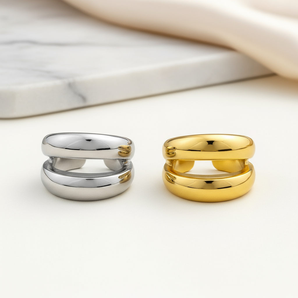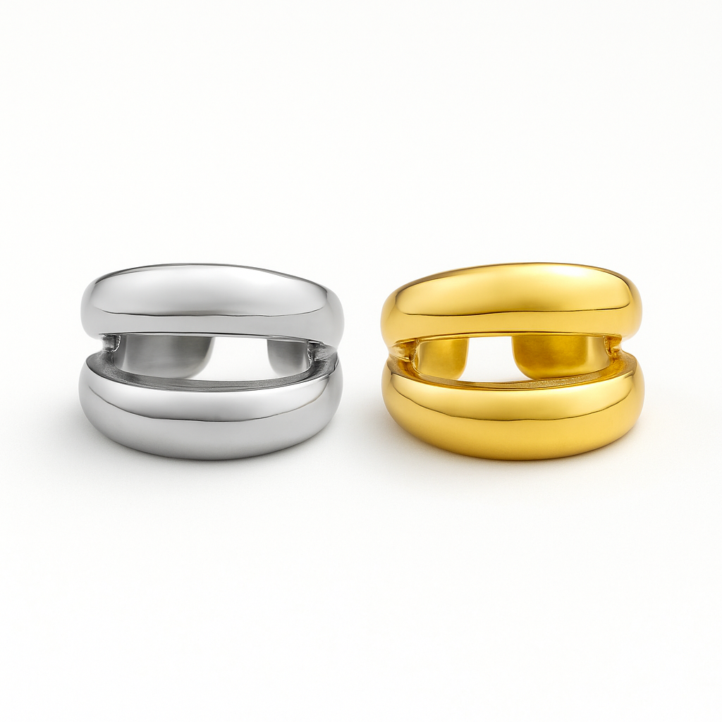 Ατσάλινο δαχτυλίδι με διπλή, φαρδιά μπάρα που αποπνέει καθαρό modern chic χαρακτήρα.