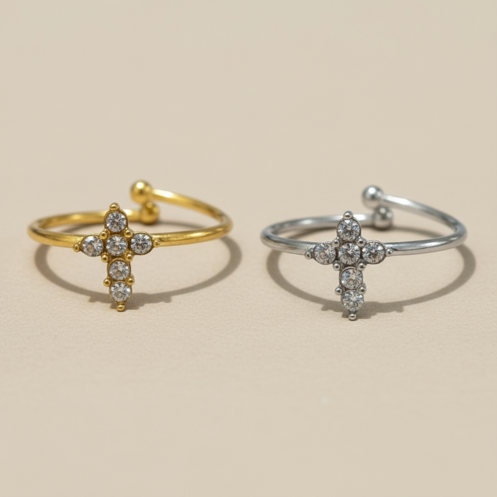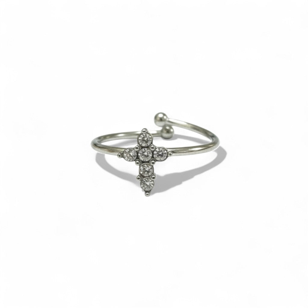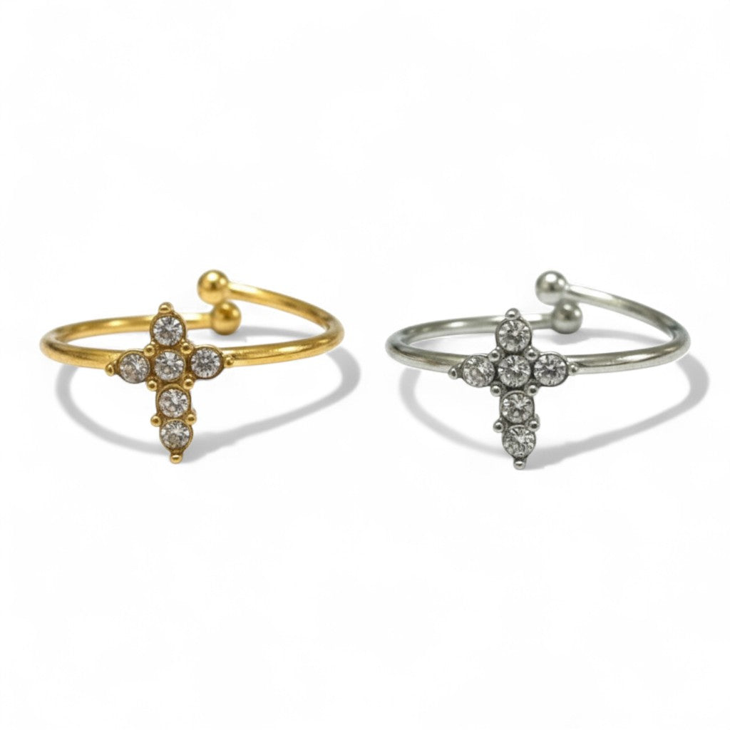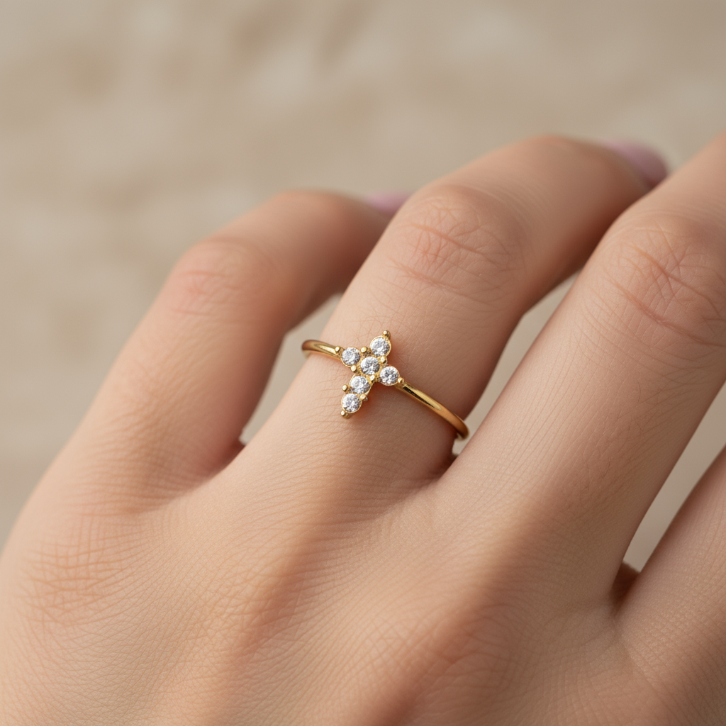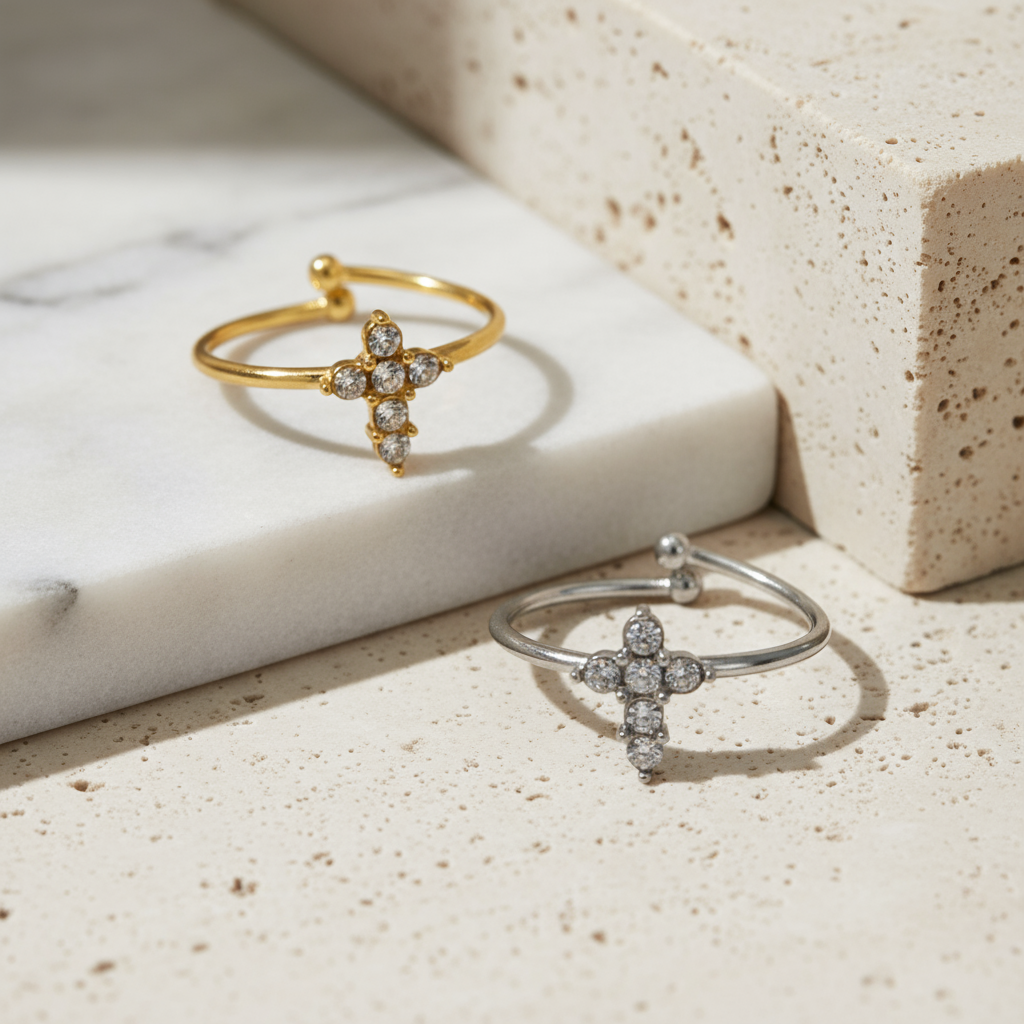 Το Cross Glow Ring είναι το λεπτό ατσάλινο δαχτυλίδι που δίνει cool sparkle vibes. Ο μικρός σταυρός με ζιργκόν κάνει statement χωρίς υπερβολή — perfect για mix & match με άλλα rings ή για solo minimal glam.