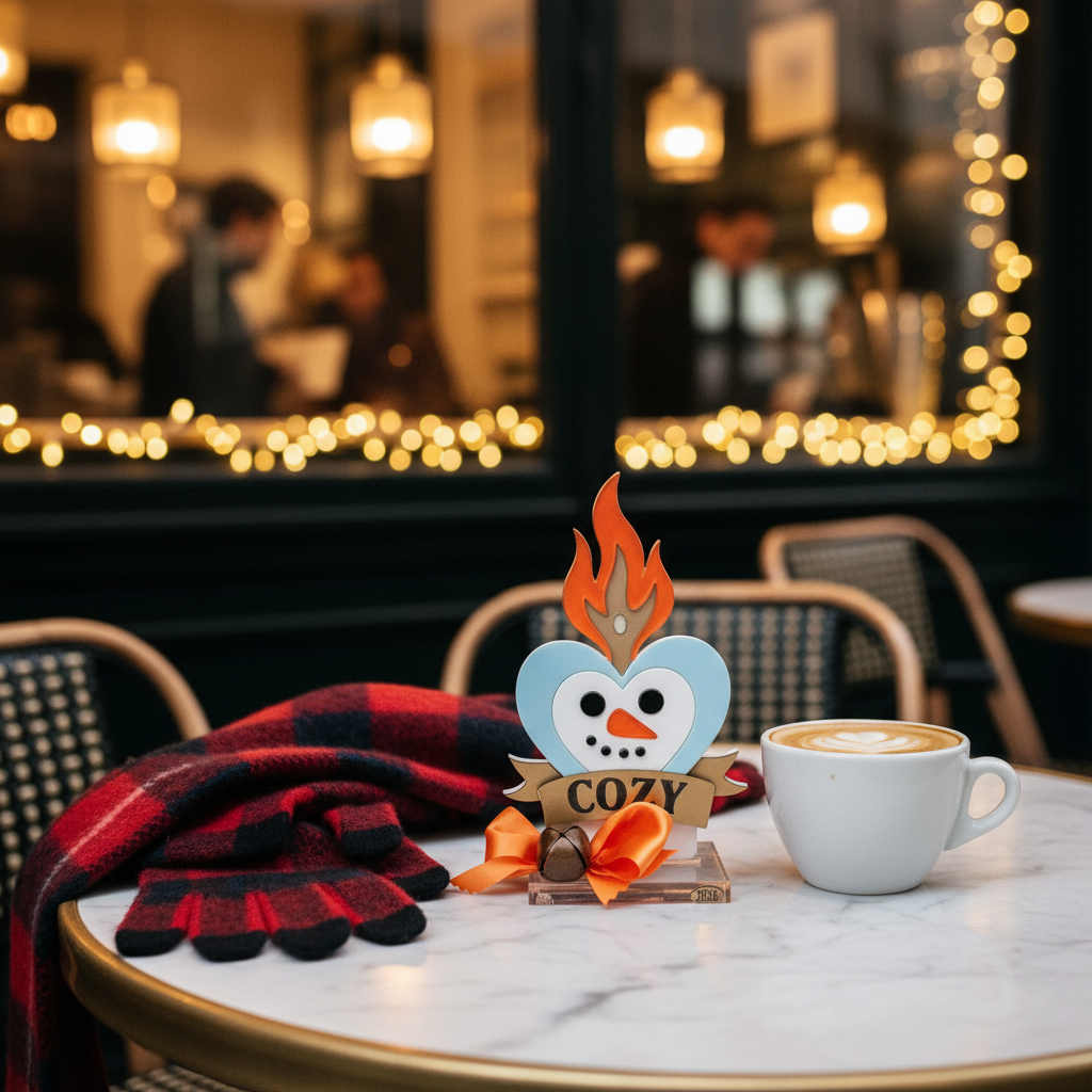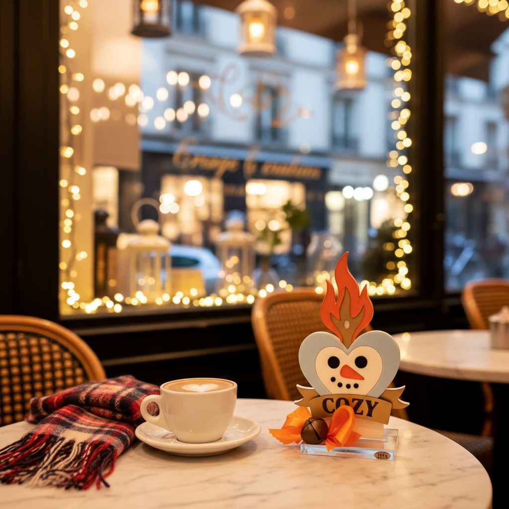 Ένα επιτραπέζιο γούρι από plexiglass σε συλλεκτικό design, διακοσμημένο με σατέν φιόγκο, παλαιωμένο κουδουνάκι και banner με τη λέξη Cozy.
