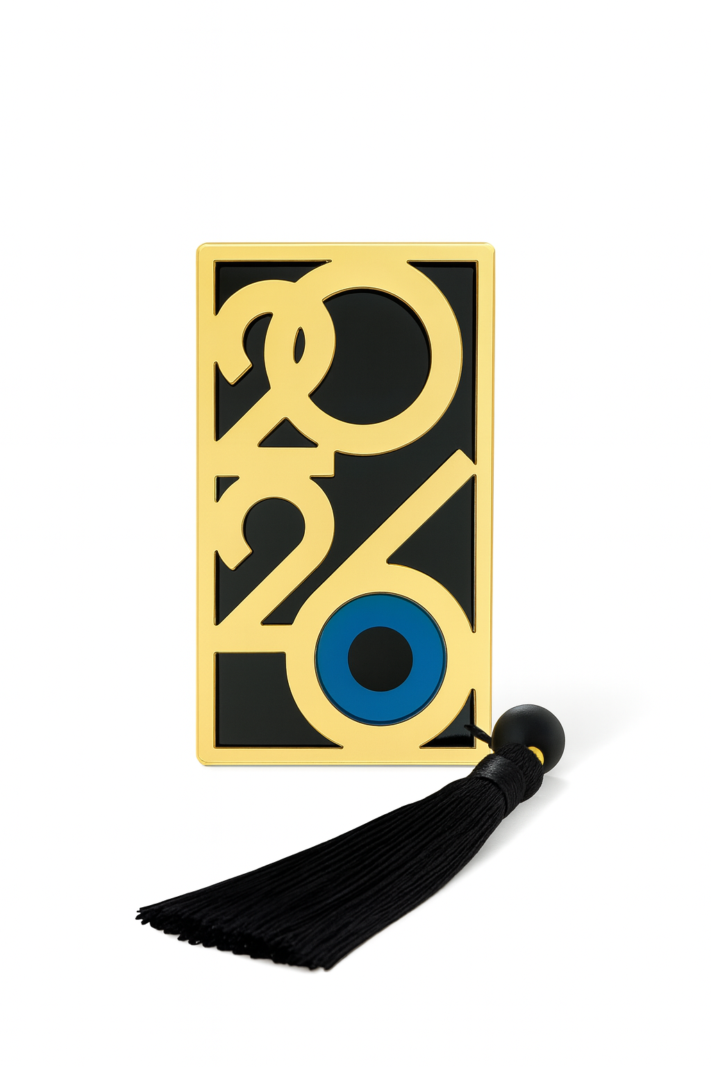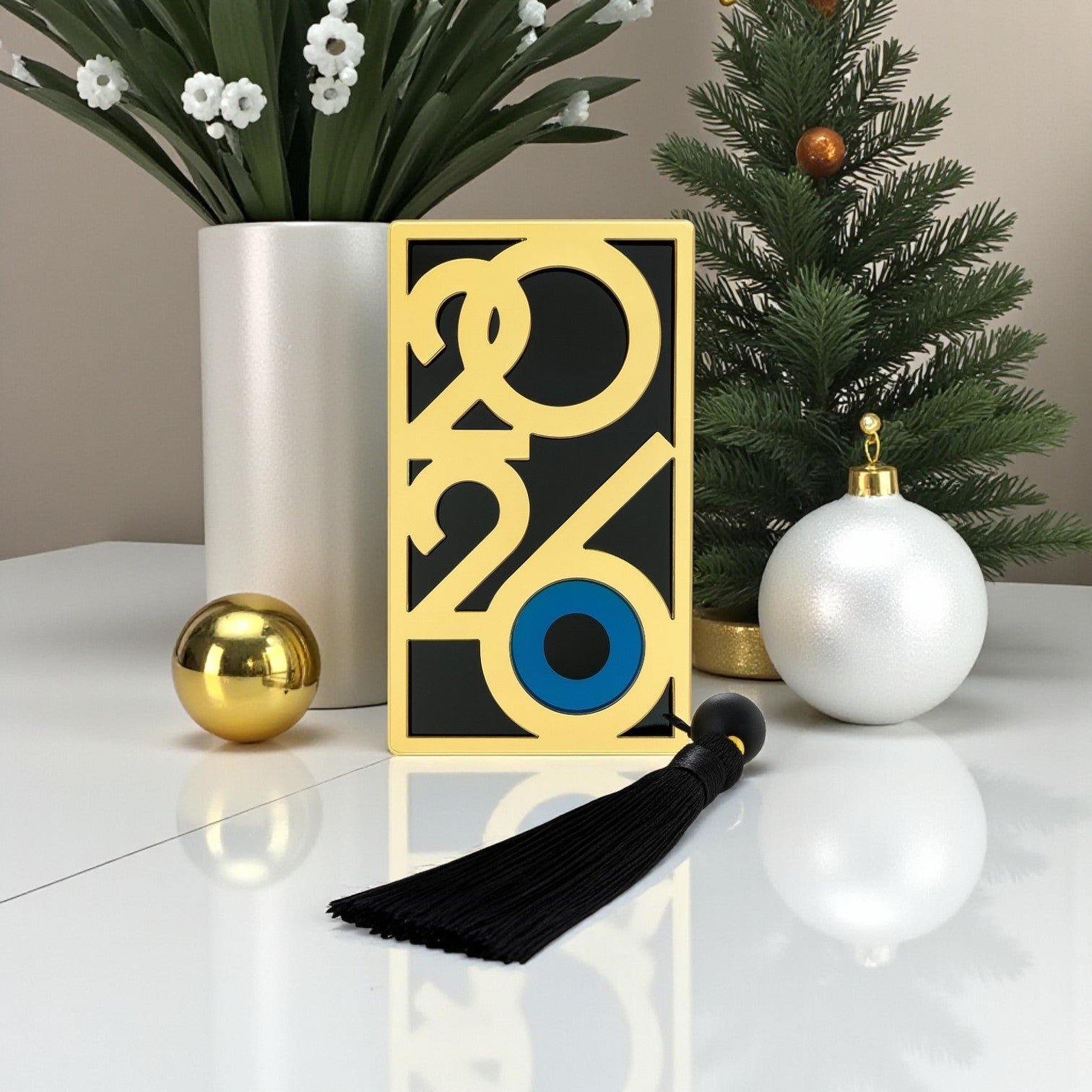 Το 2026 αποτυπώνεται σε επιτραπέζιο plexiglass με χρυσό καθρέφτη και κεντρικό μάτι σε μπλε τόνους, ολοκληρωμένο με πολυτελή φούντα και χάντρες. Ένα μοντέρνο γούρι που εντυπωσιάζει με τον συμβολισμό και την αισθητική του.