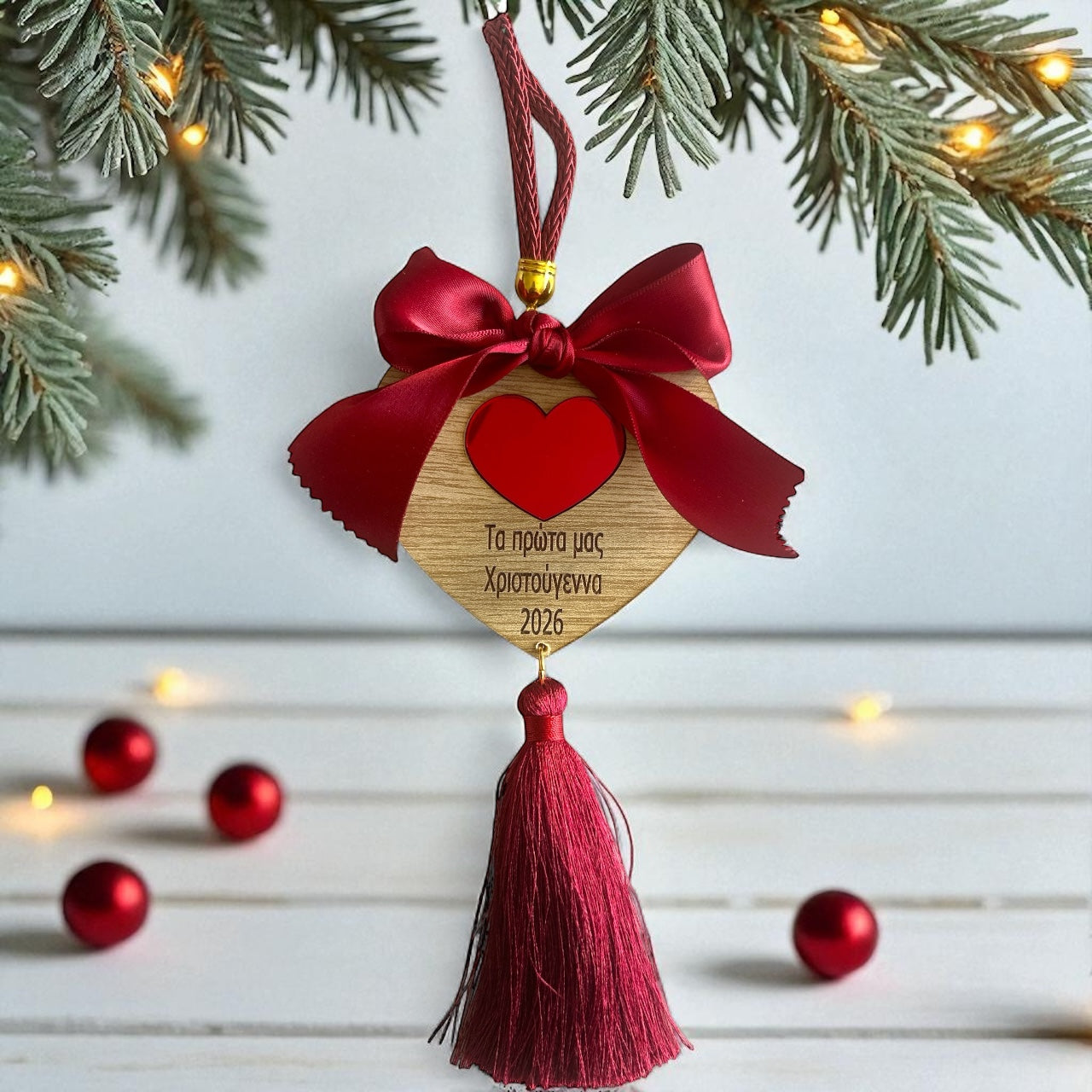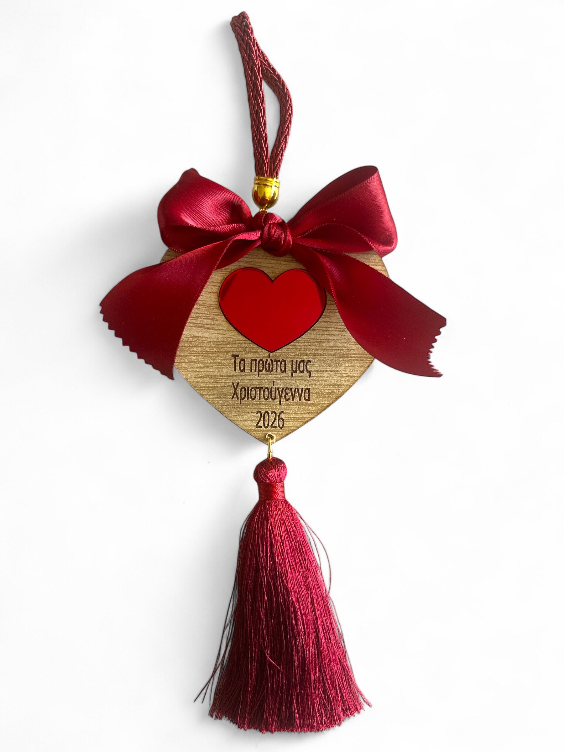Χειροποίητη καρδιά από ξύλο με κόκκινη απλικέ καρδιά από plexiglass, χαραγμένο μήνυμα «Τα πρώτα μας Χριστούγεννα», διακοσμημένη με σατέν φιόγκο και εντυπωσιακή κόκκινη φούντα.