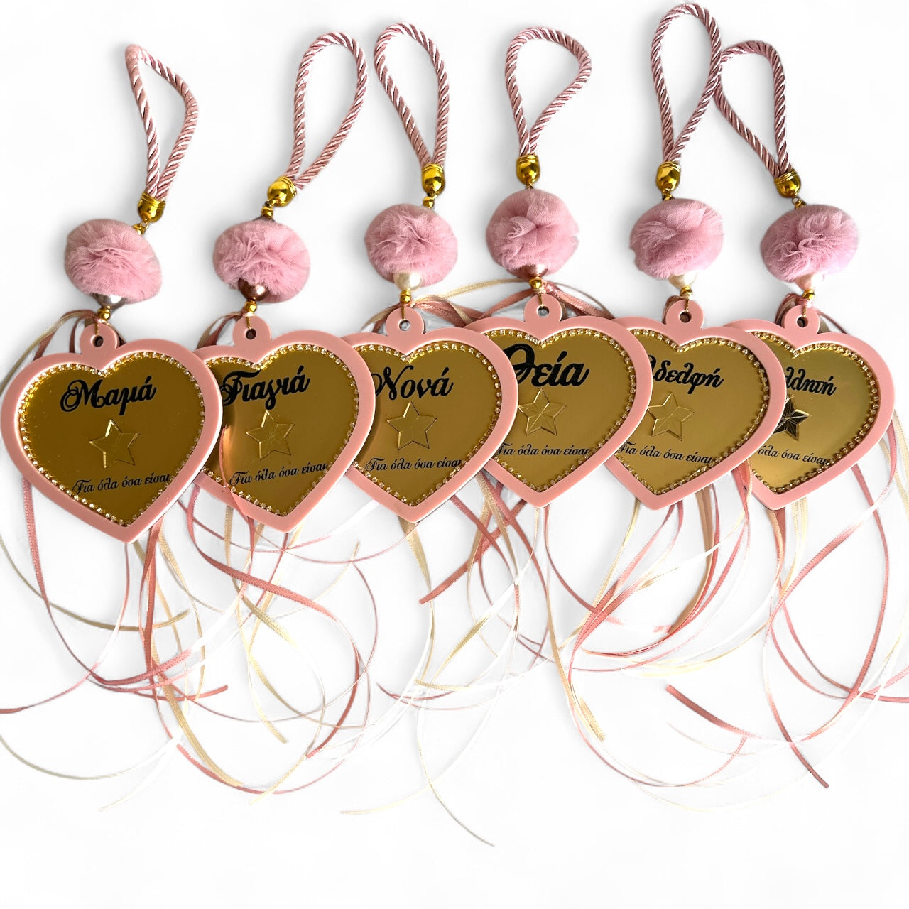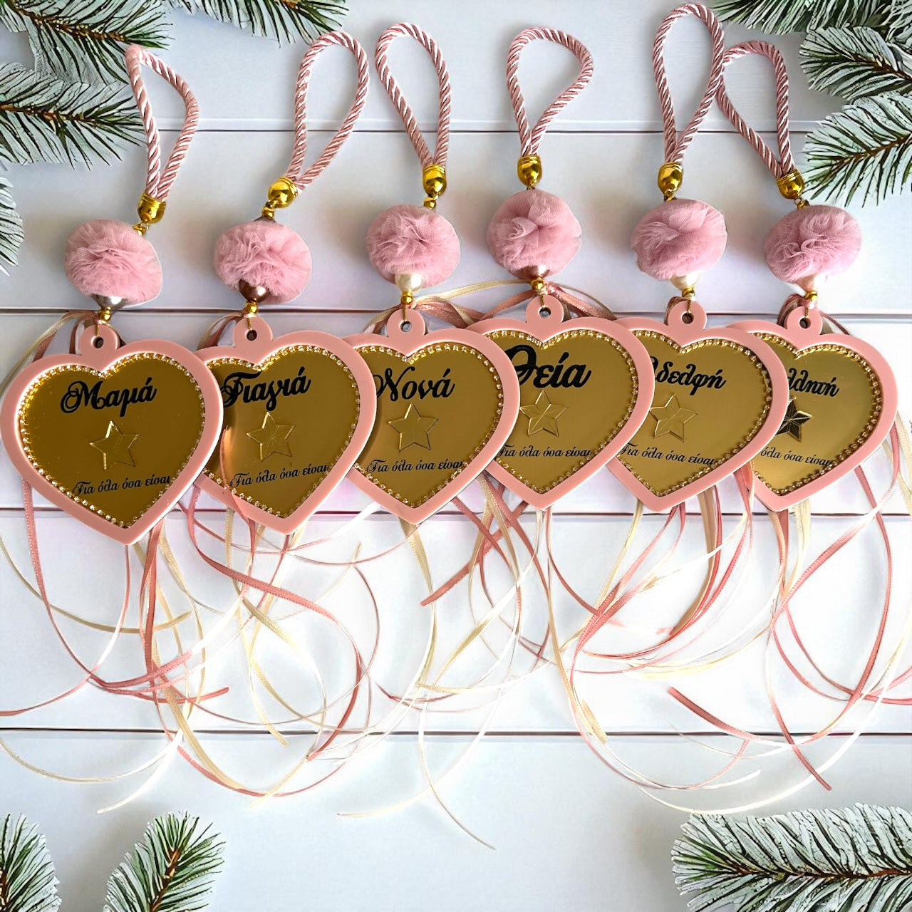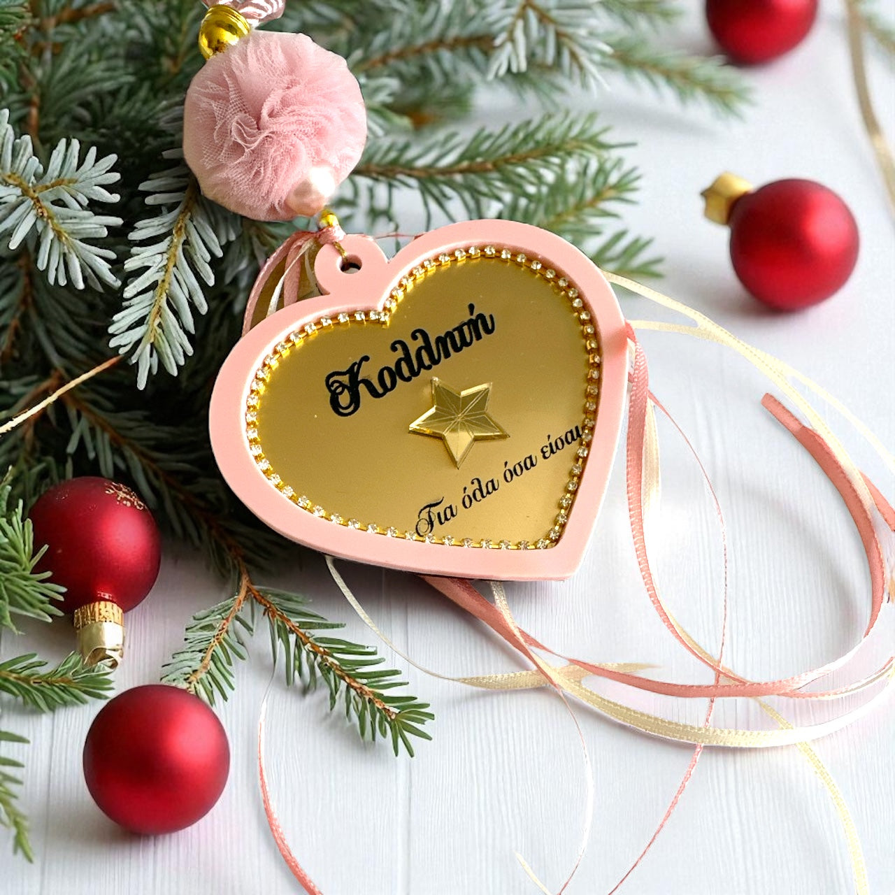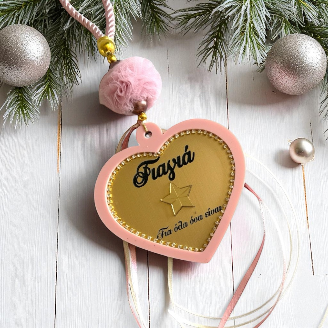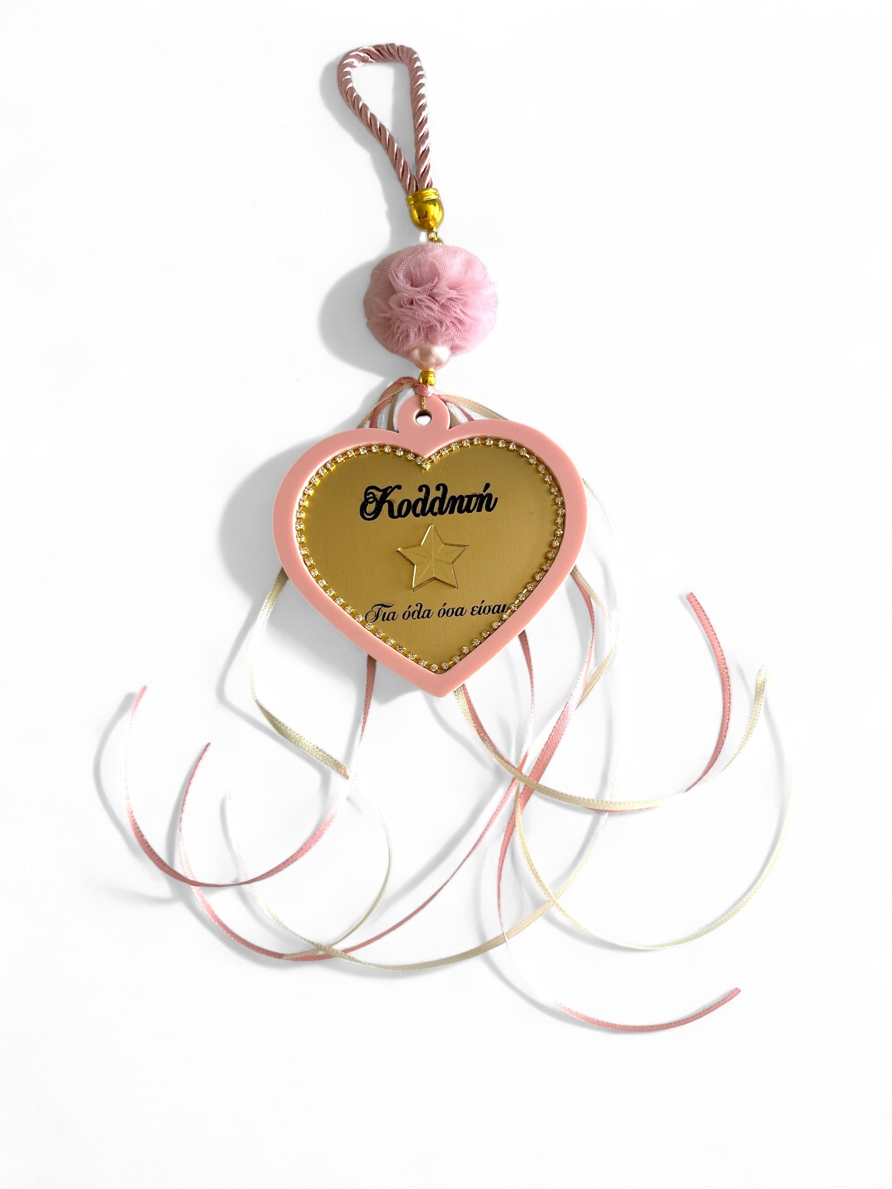 Η καρδιά από ματ καθρέφτη στολίζεται με τη φράση «Για όλα όσα είσαι», λαμπερό απλικέ αστέρι και κορνίζα από ροζ plexiglass με περιμετρικά στρας.