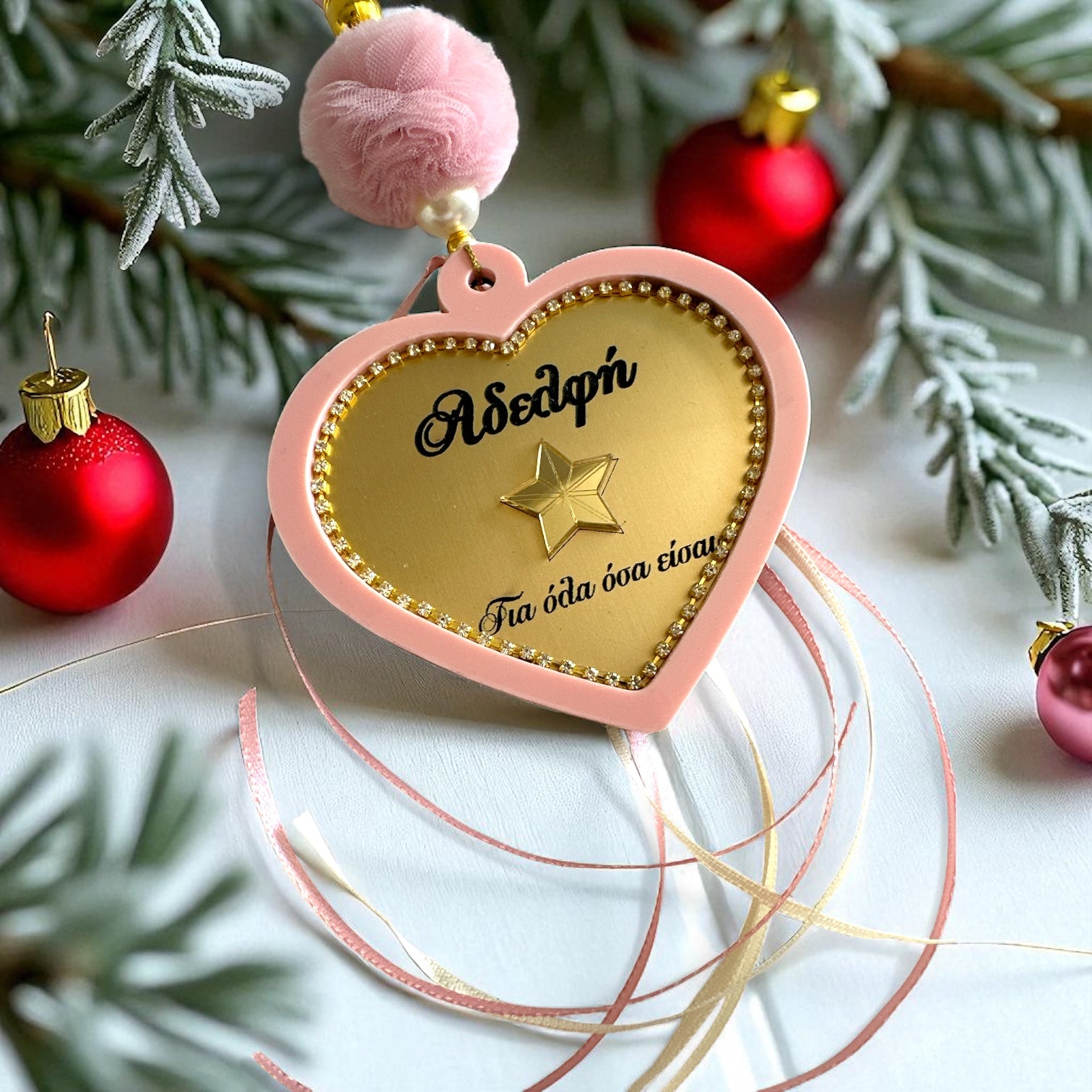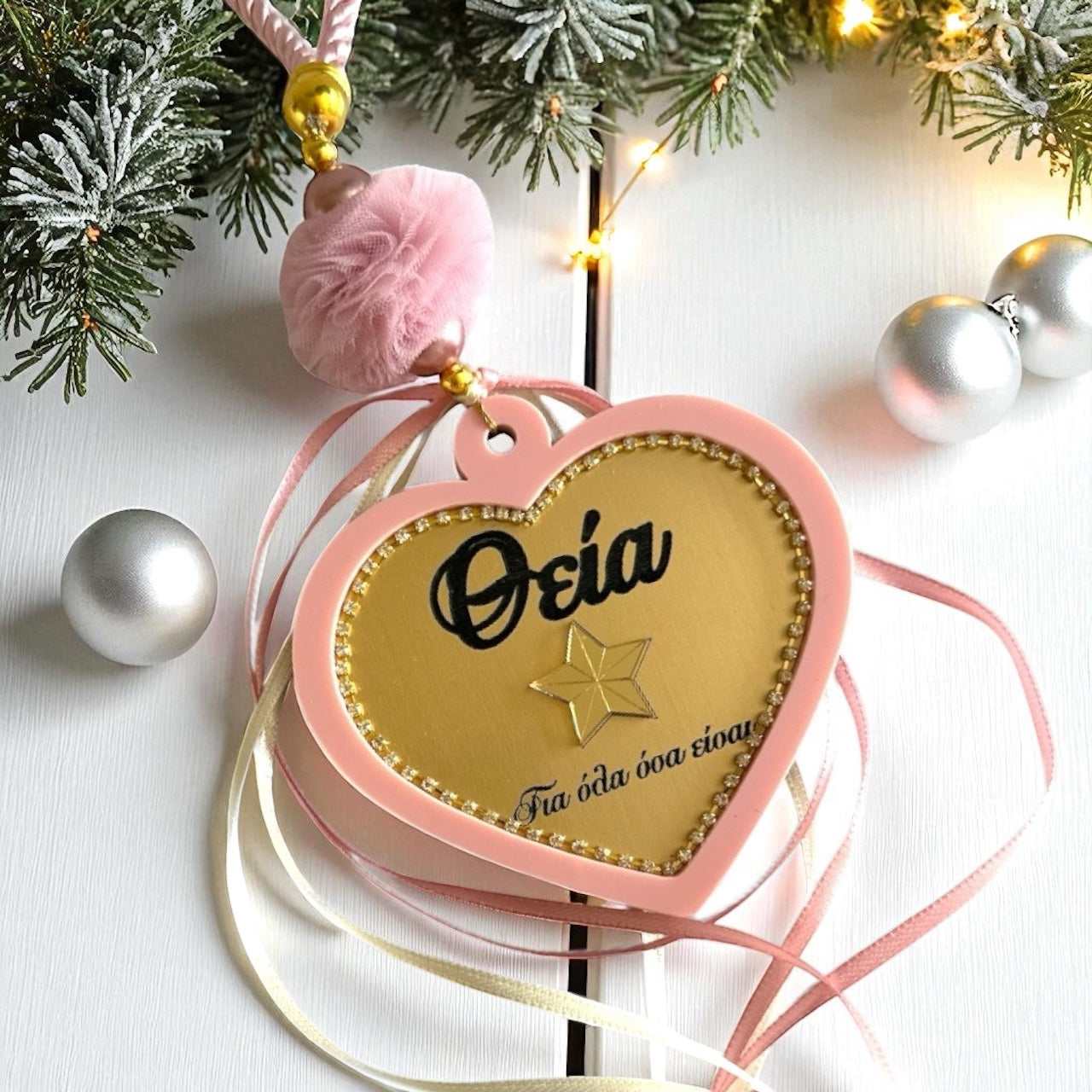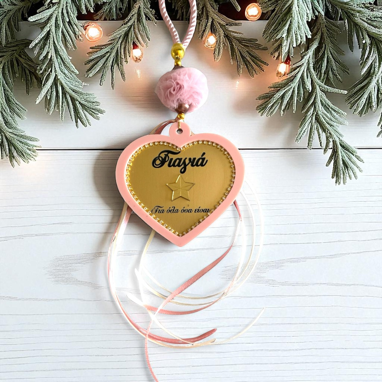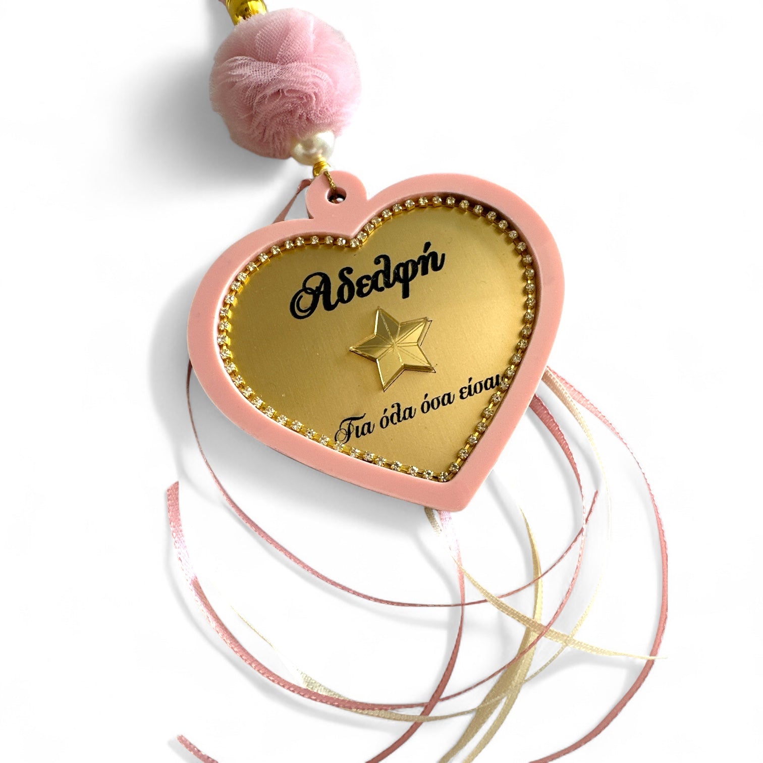 Η καρδιά από ματ καθρέφτη στολίζεται με τη φράση «Για όλα όσα είσαι», λαμπερό απλικέ αστέρι και κορνίζα από ροζ plexiglass με περιμετρικά στρας.
