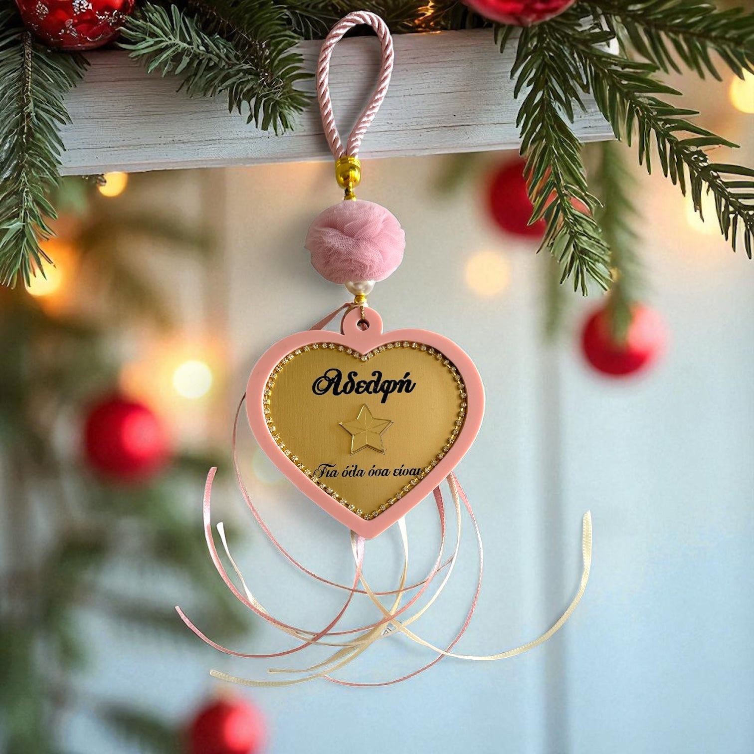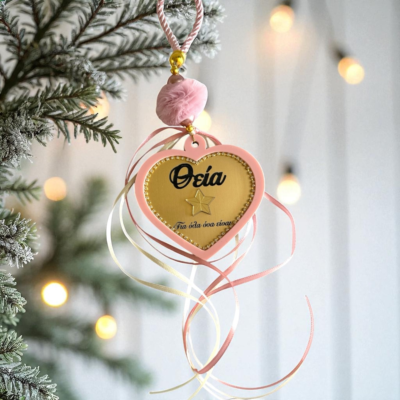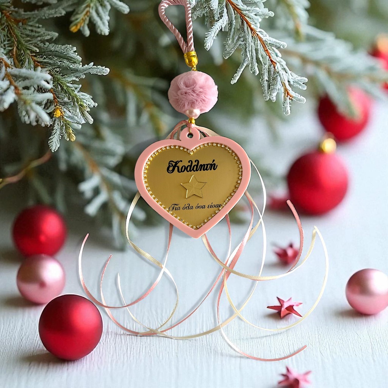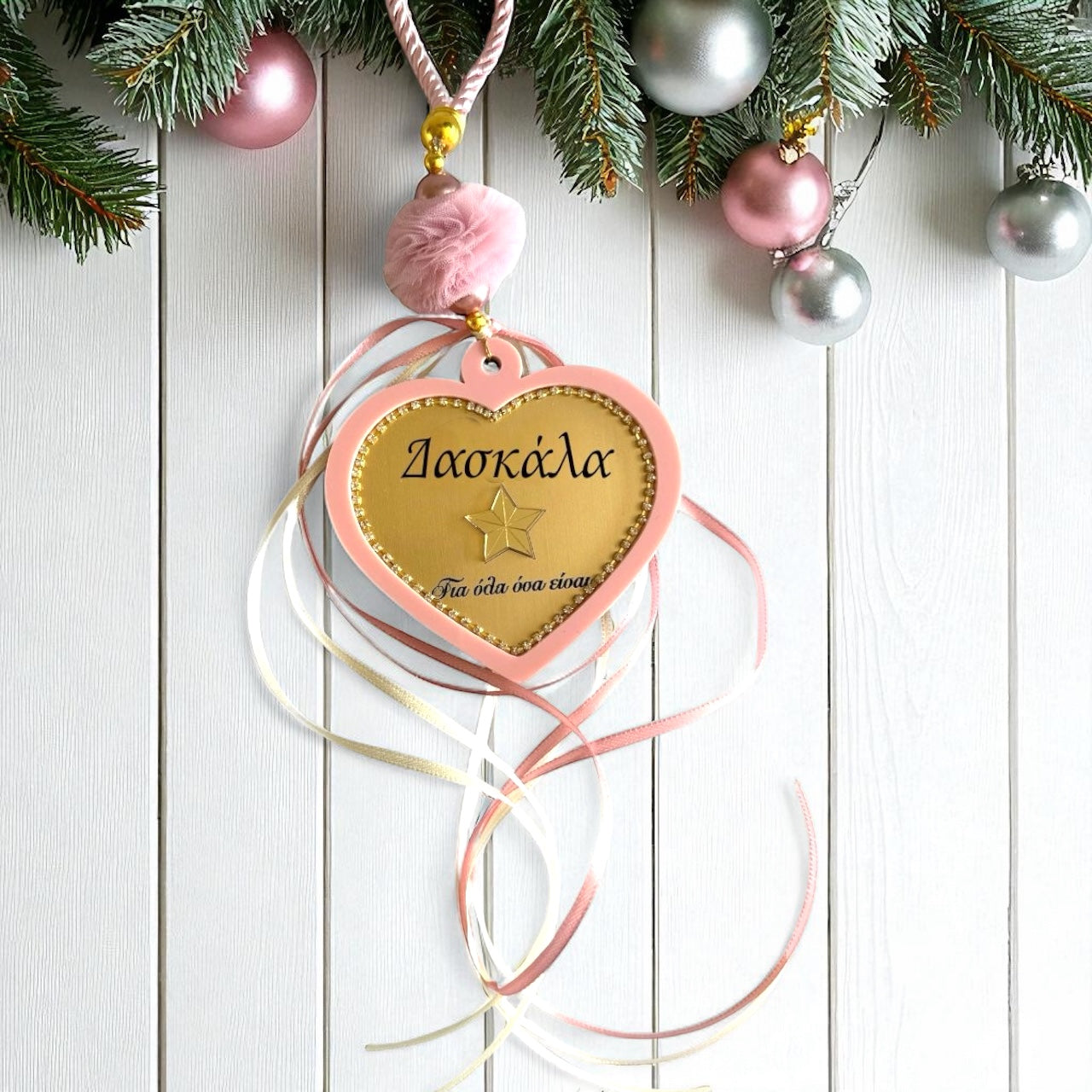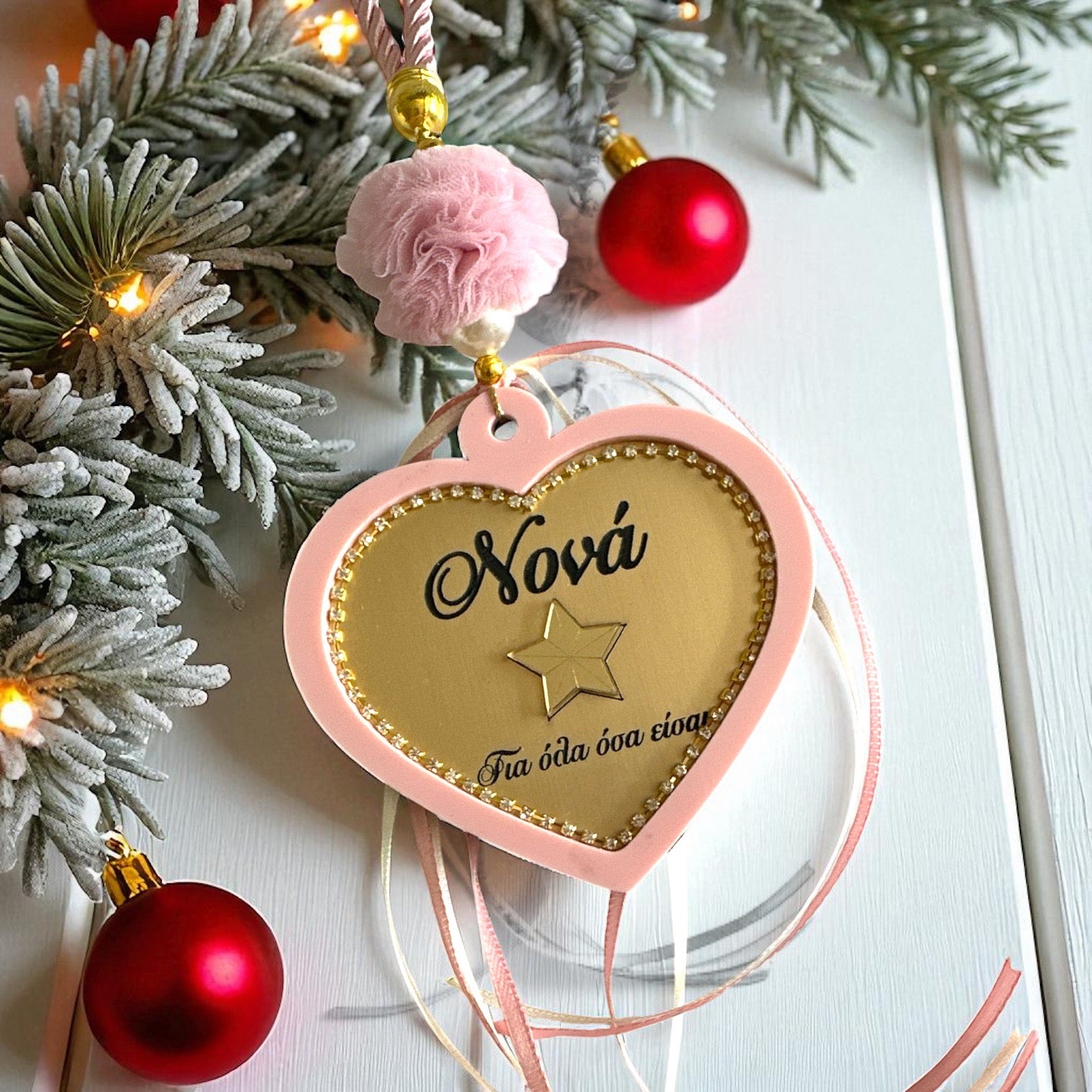 Η καρδιά από ματ καθρέφτη στολίζεται με τη φράση «Για όλα όσα είσαι», λαμπερό απλικέ αστέρι και κορνίζα από ροζ plexiglass με περιμετρικά στρας.