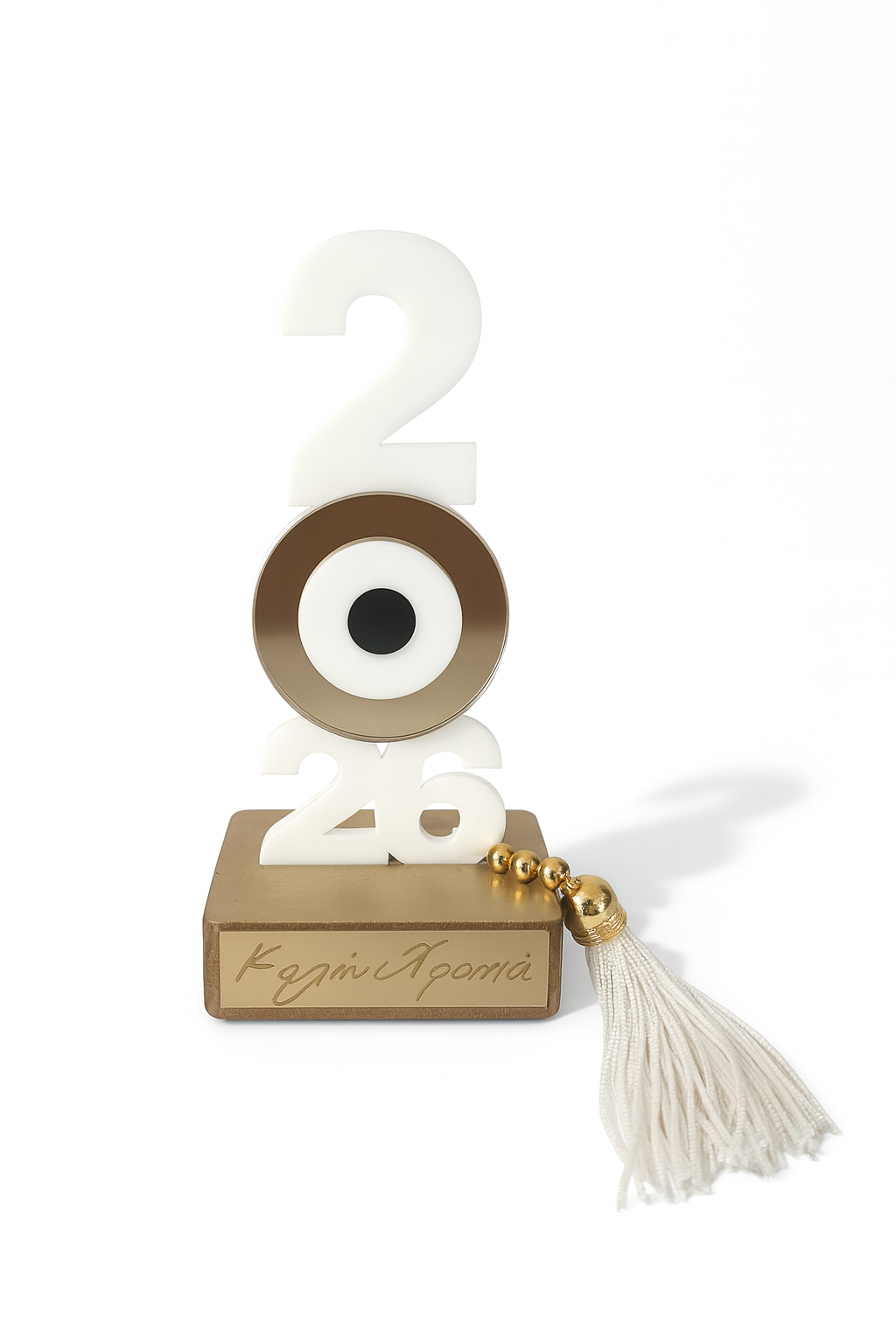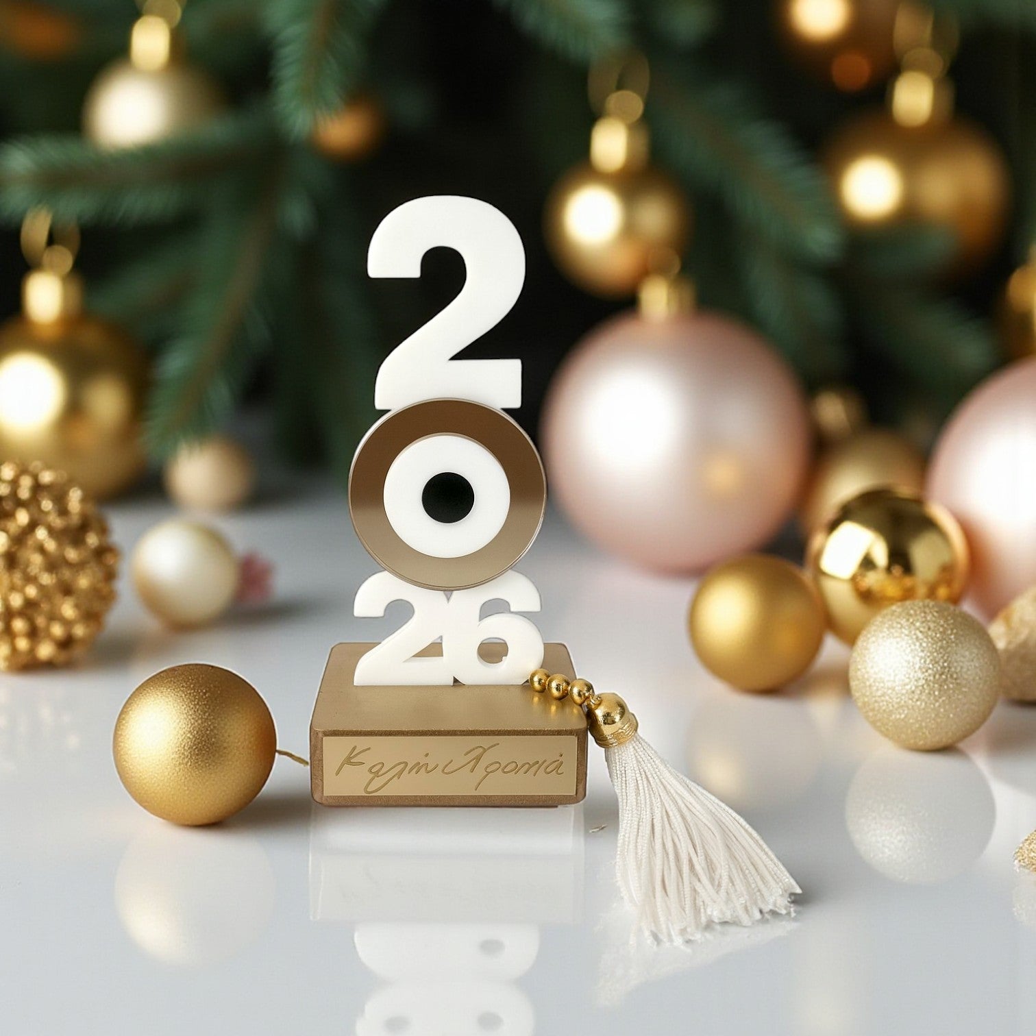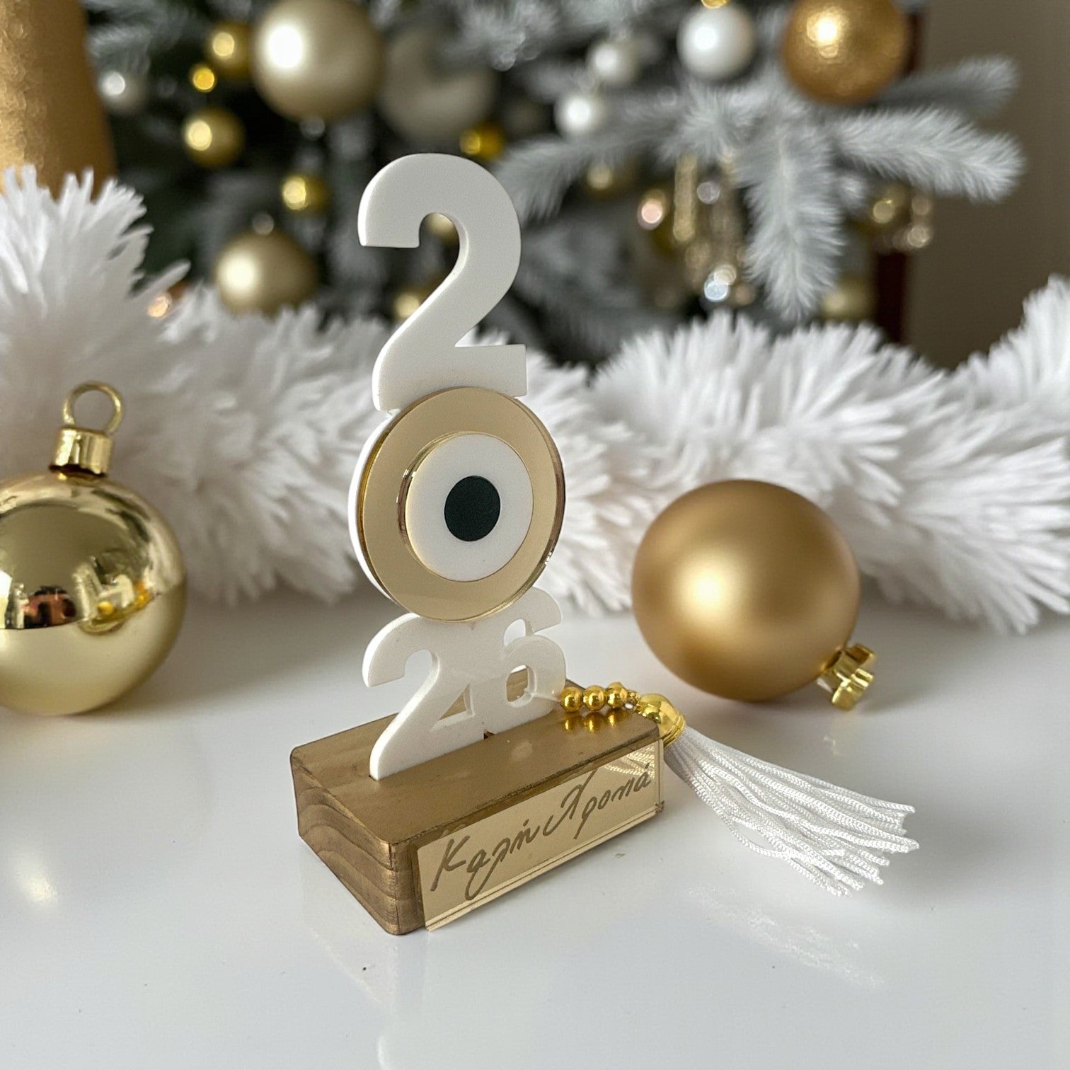 Το σχέδιο με το 2026 σε κάθετη διάταξη και κεντρικό μάτι από plexiglass με χρυσό mirror, στηρίζεται σε πολυτελή ξύλινη βάση με ταμπελάκι «Καλή Χρονιά». Ολοκληρώνεται με μεταλλικές χάντρες και διακοσμητική φούντα για μια extra festive πινελιά.