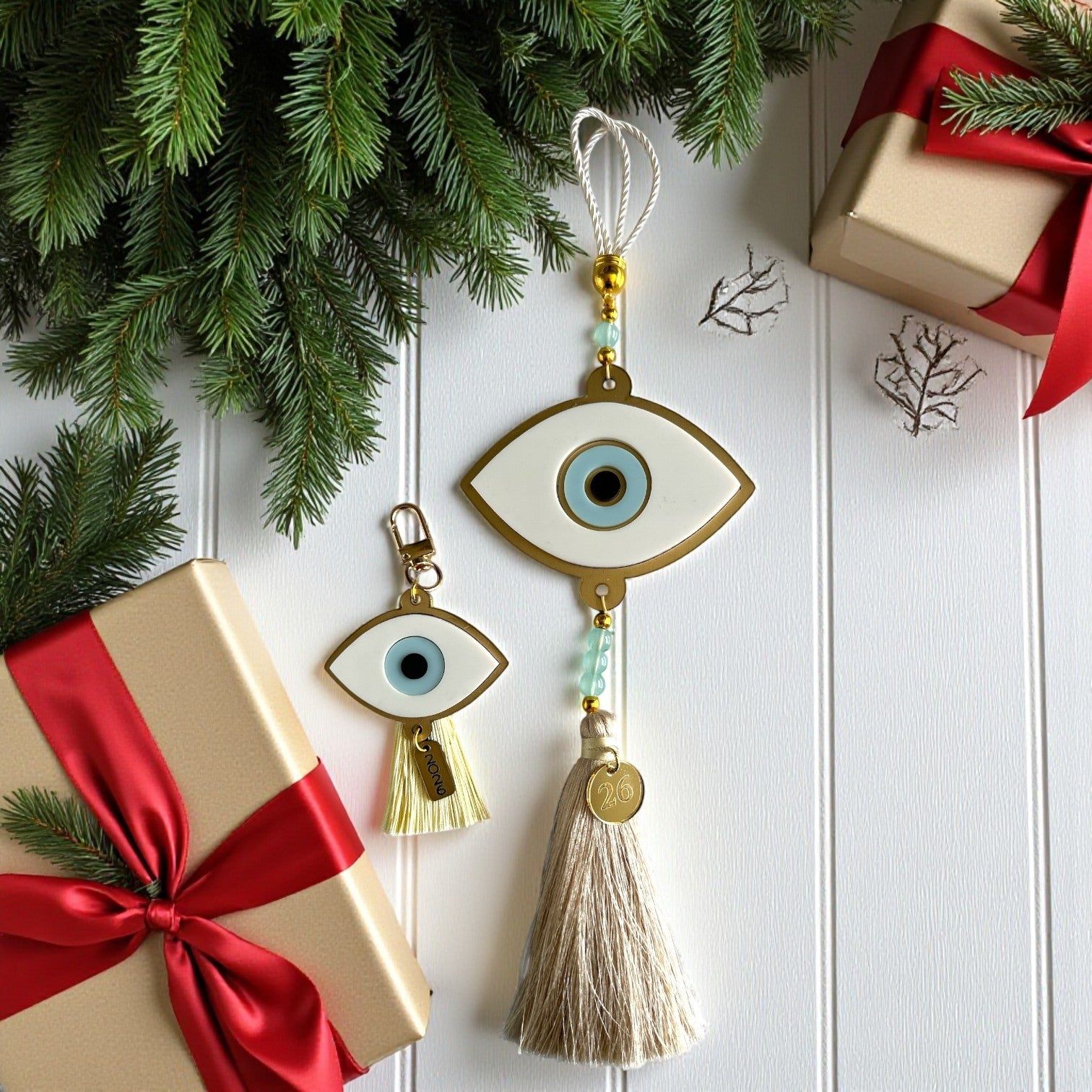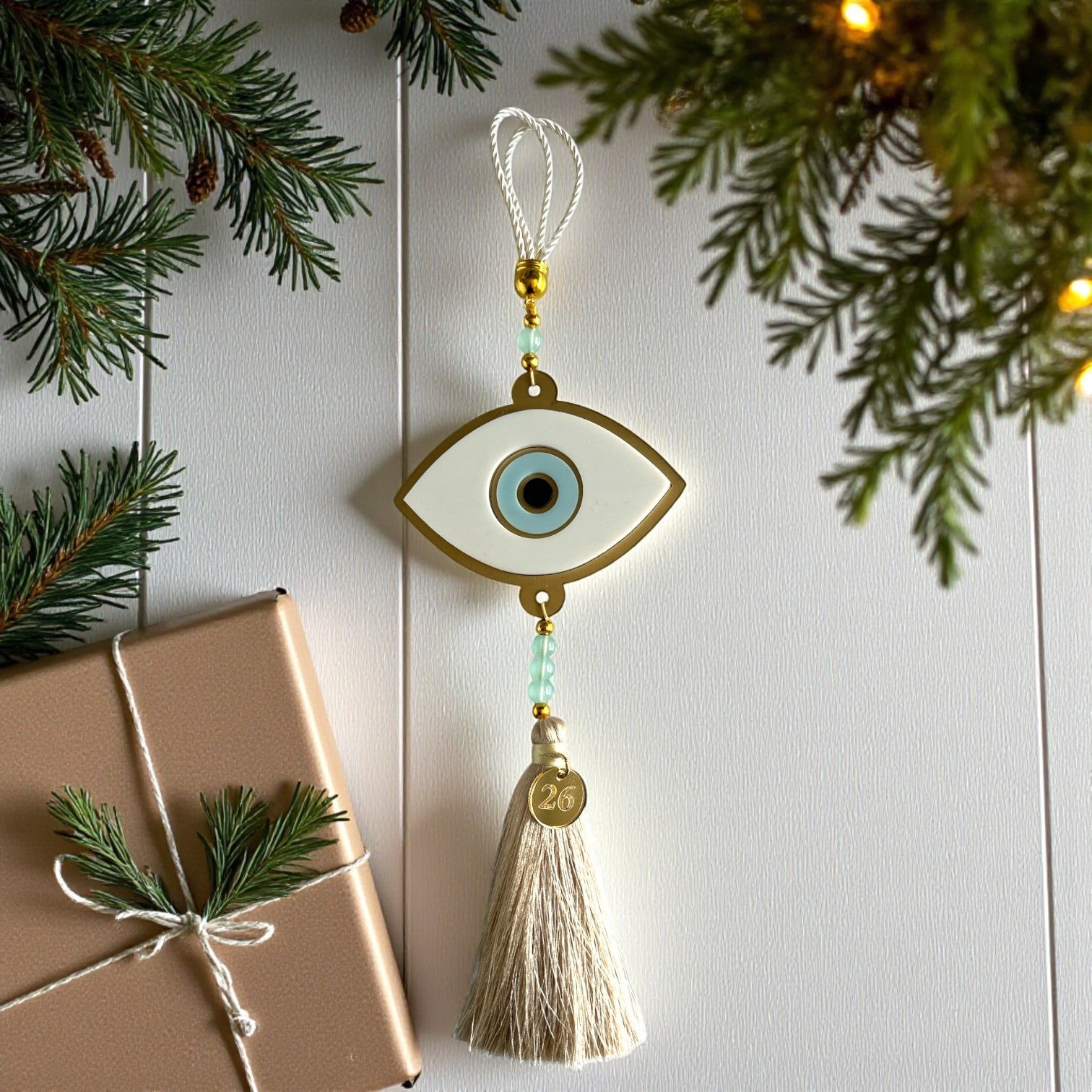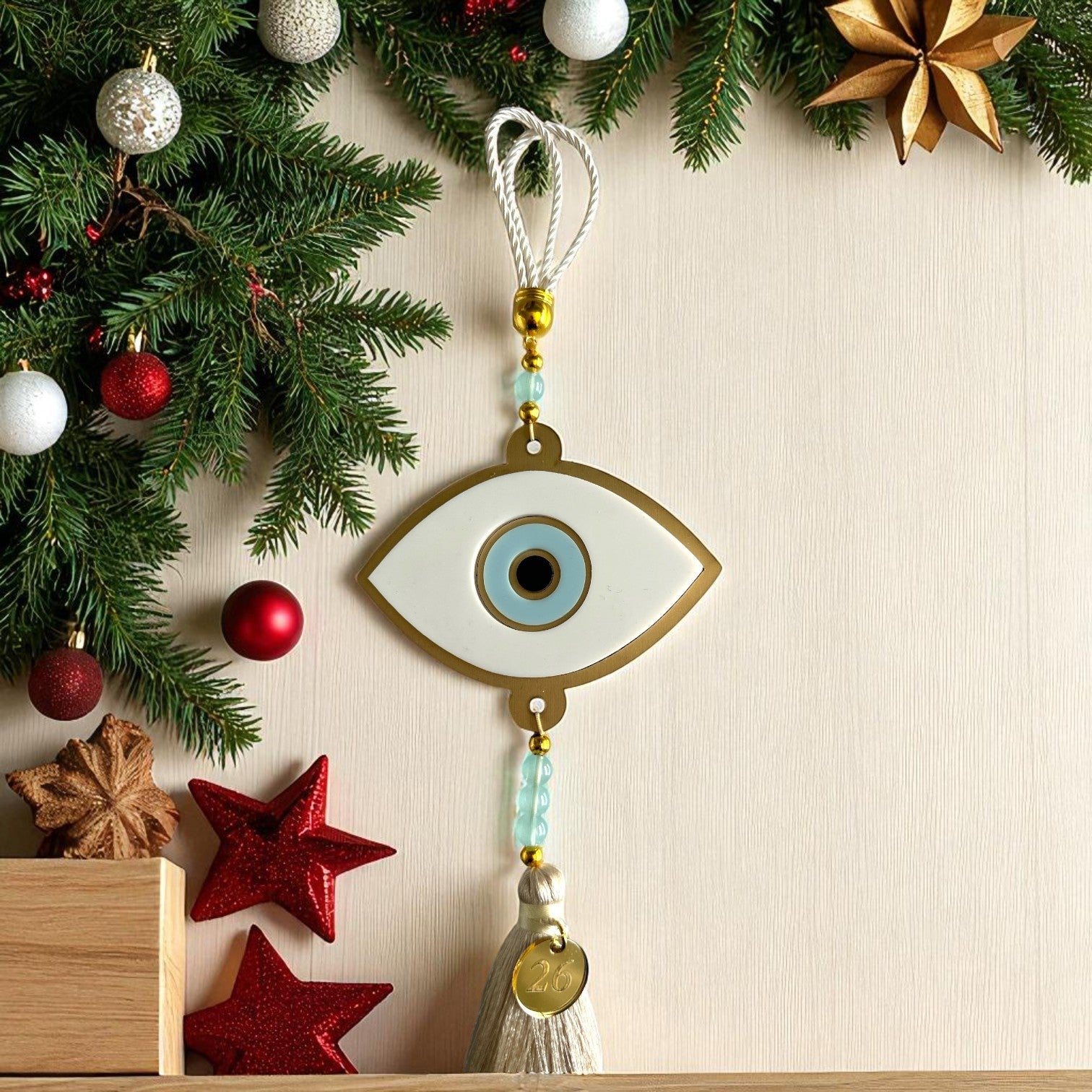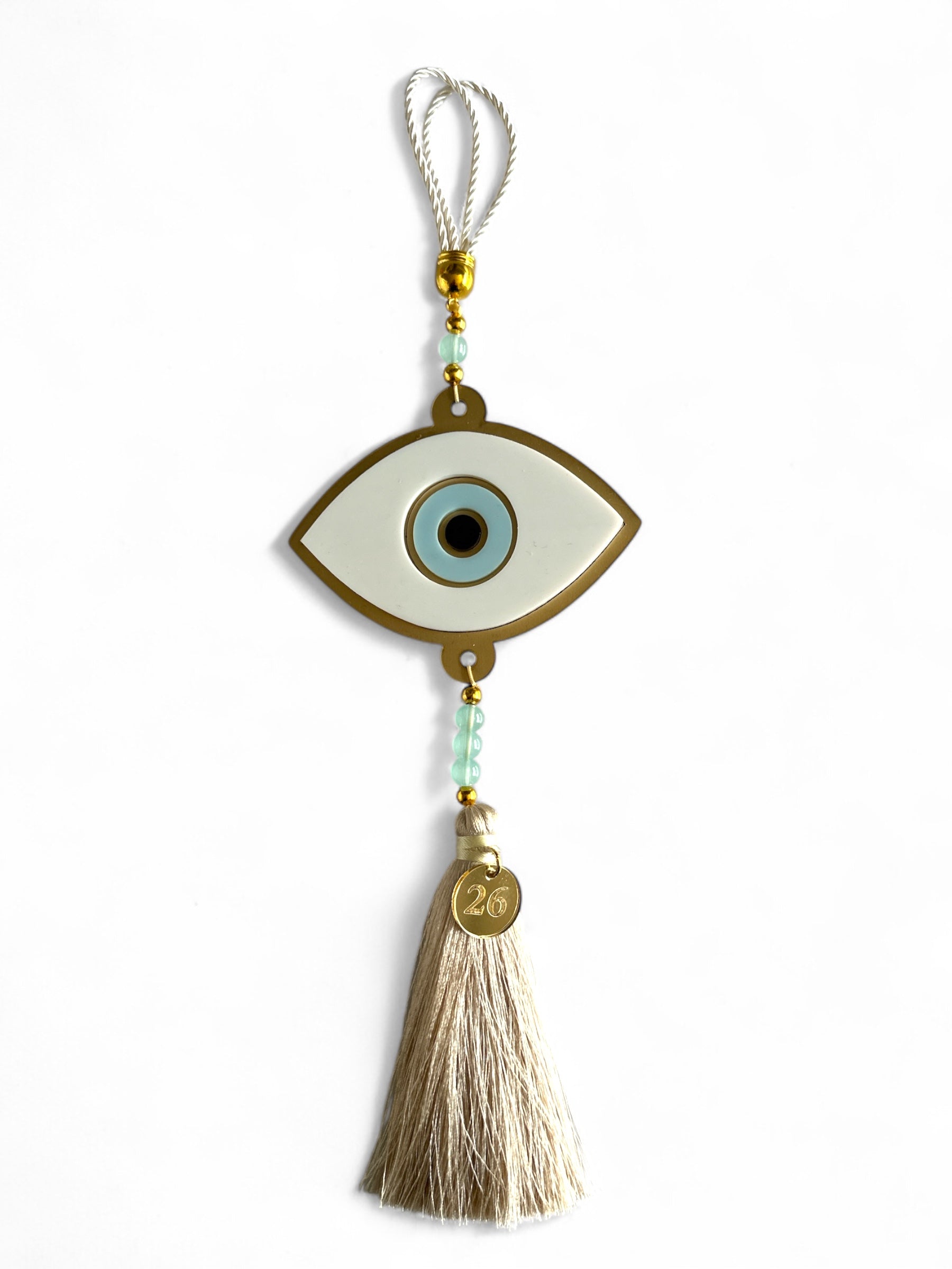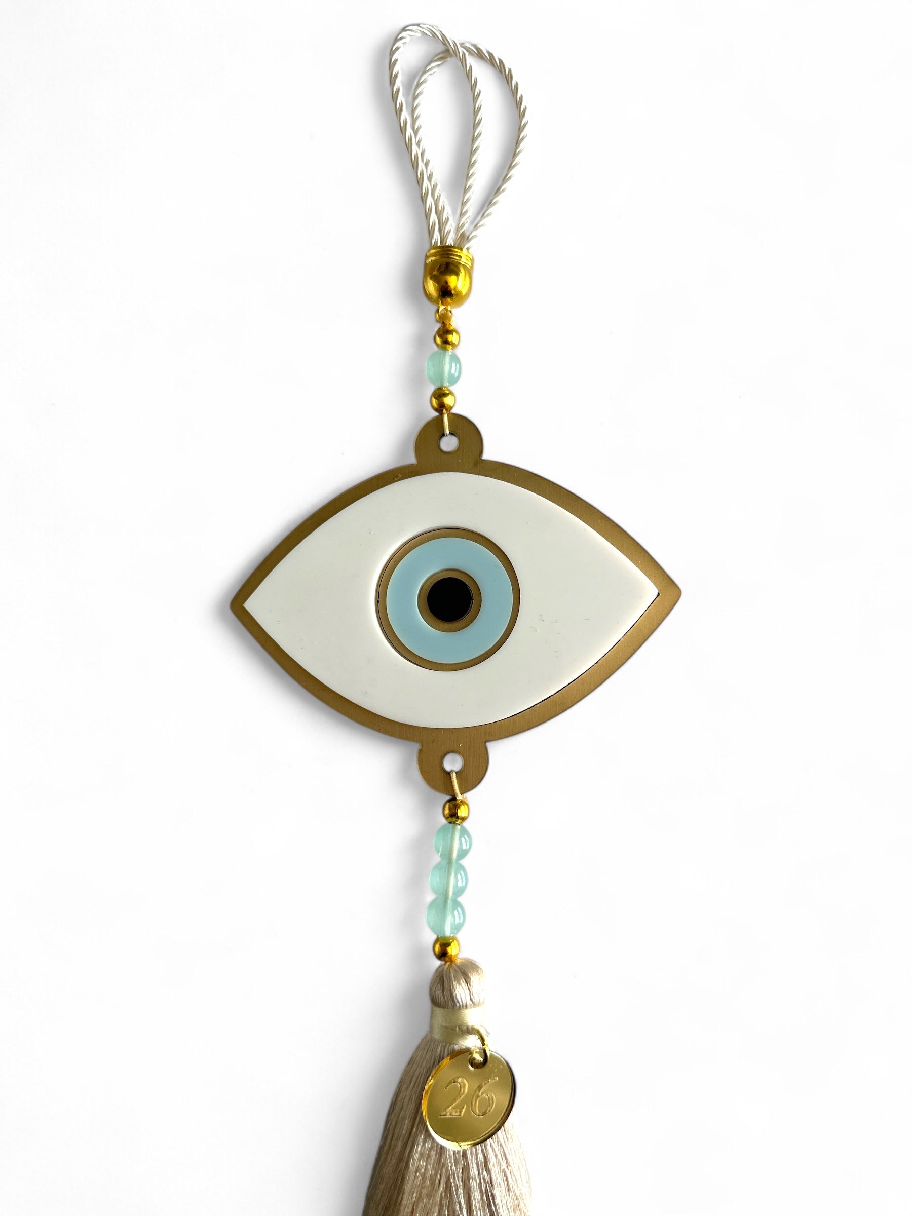 Ένα εντυπωσιακό χειροποίητο γούρι με minimal-luxury design, για να υποδεχθείς τη νέα χρονιά με στυλ και θετική ενέργεια. Το μάτι οβάλ με πλάτη από χρυσό ματ καθρέφτη, λευκά και γαλάζια plexiglass στοιχεία, στολίζεται με χάντρες και πολυτελή φούντα με μεταλλικό tag 2026.