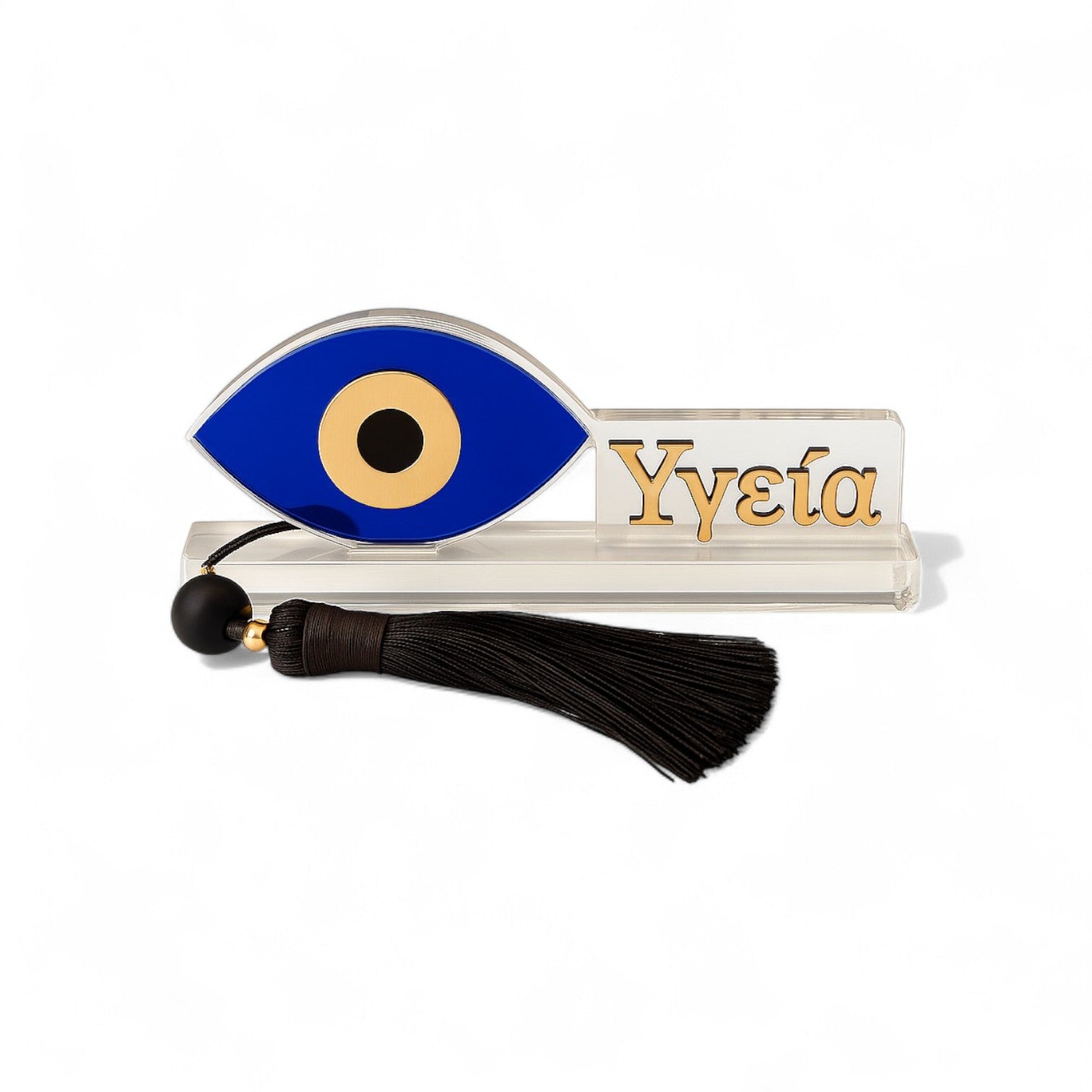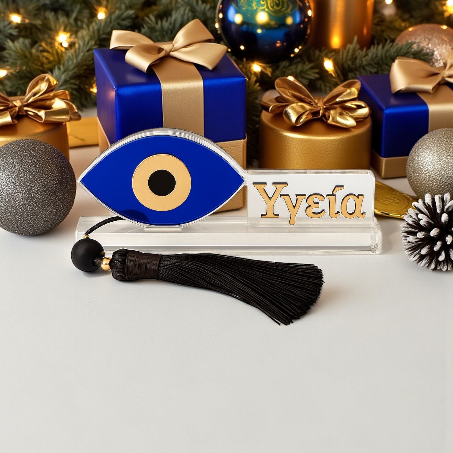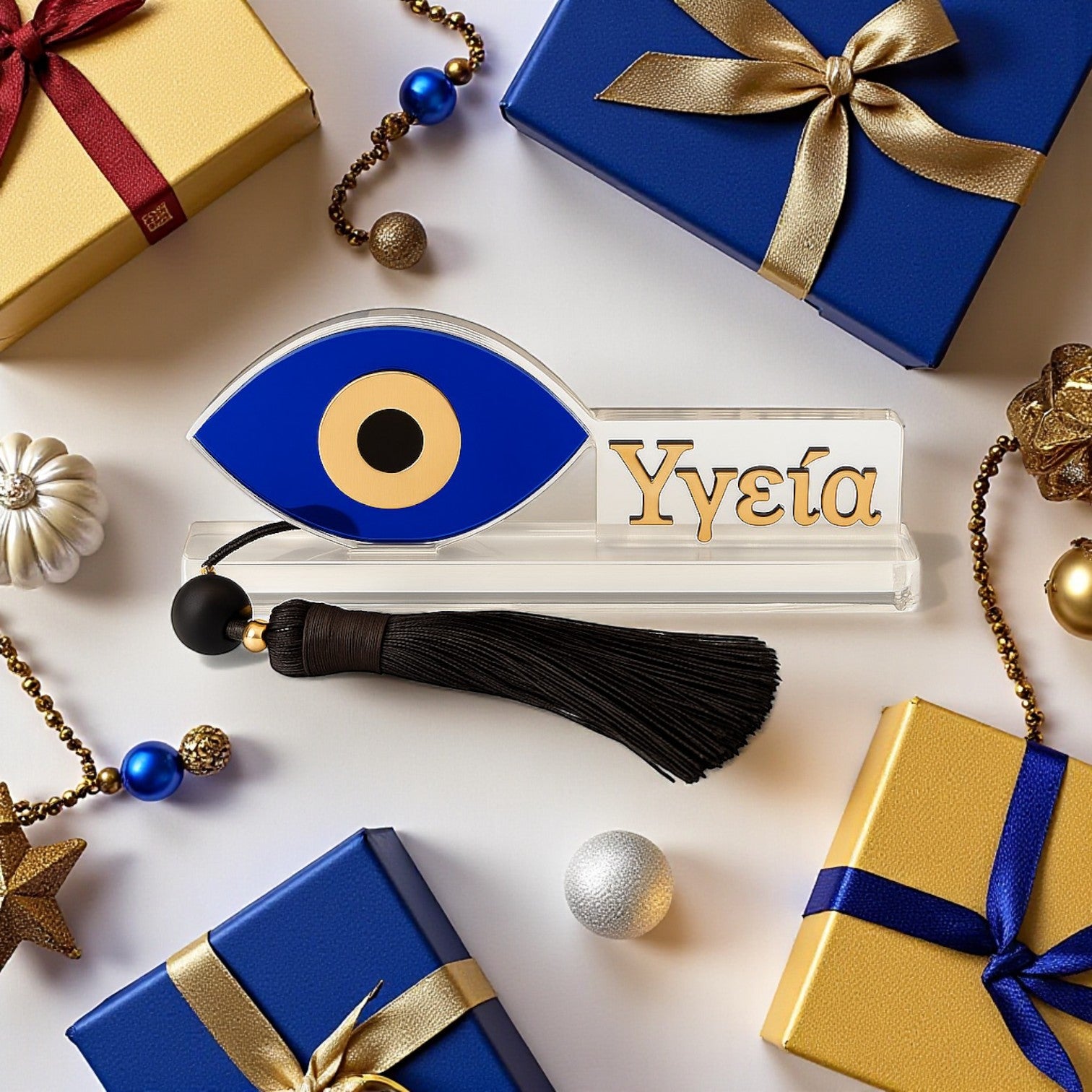 Το χειροποίητο επιτραπέζιο γούρι “Υγεία” από τη συλλογή Greek Wishes συνδυάζει το παραδοσιακό μάτι σε βαθύ μπλε plexiglass με την ευχή “Υγεία” σε χρυσό καθρέφτη. Στολισμένο με χάντρες και πολυτελή μαύρη φούντα, αποτελεί σύμβολο προστασίας και θετικής ενέργειας.