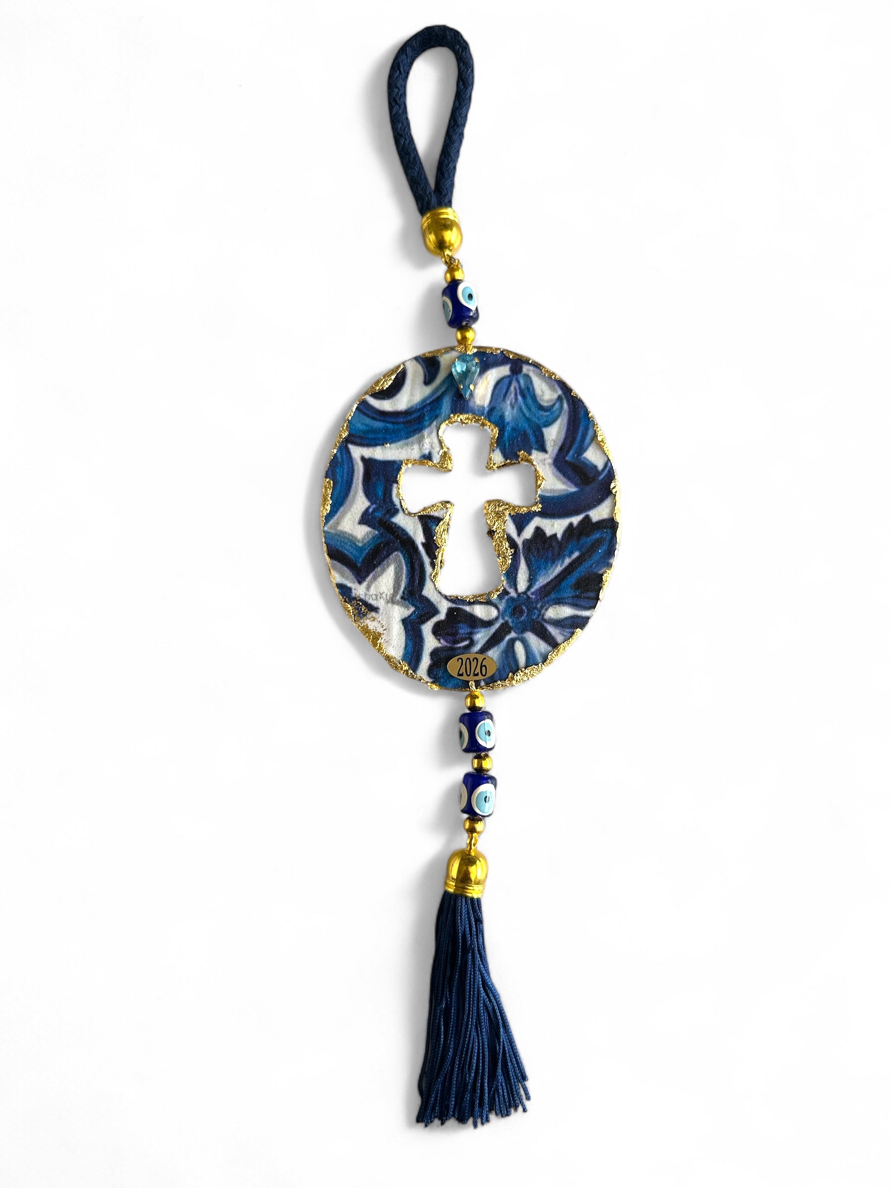 Ένα μοναδικό χειροποίητο γούρι που συνδυάζει την προστασία του ματιού με τη δύναμη του σταυρού. Το ξύλινο οβάλ στοιχείο με cut-out σταυρό και περίγραμμα από χρυσό glitter ντύνεται με καλλιτεχνικό pattern, ενώ οι χάντρες με γυάλινα μάτια και η φούντα ολοκληρώνουν το πολυτελές σύνολο.