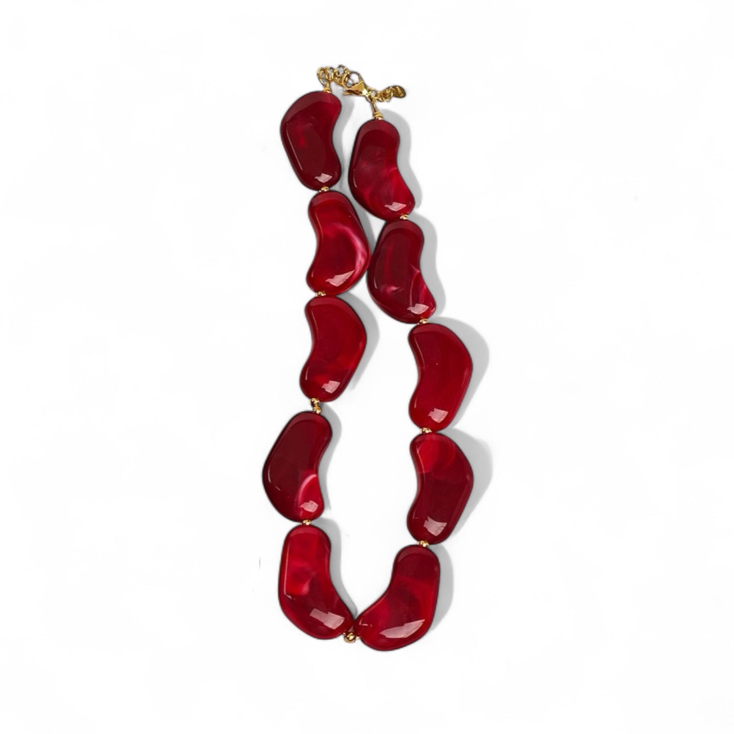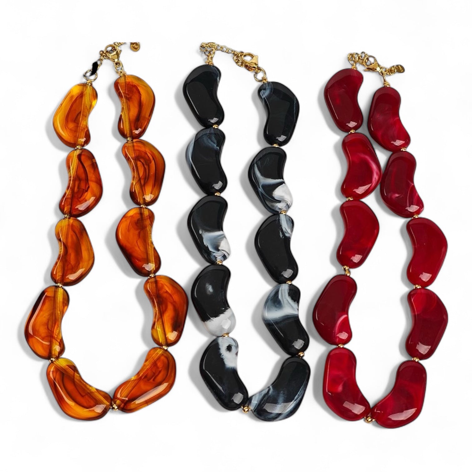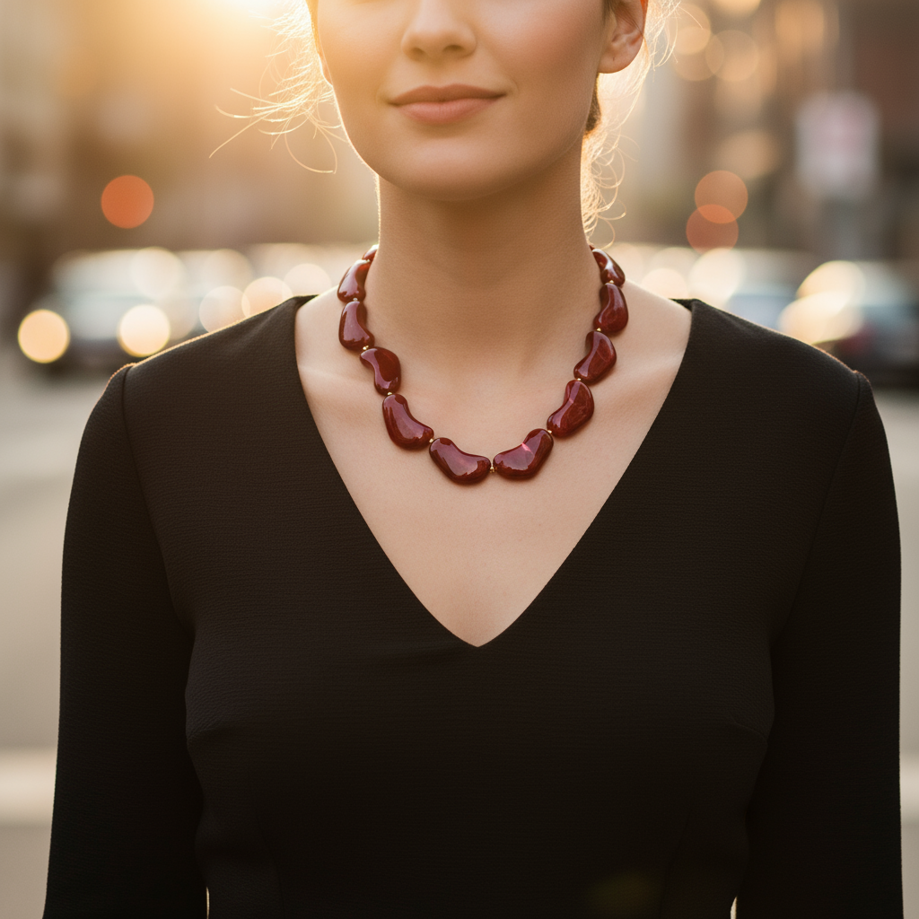 Το Molten Wave Necklace συνδυάζει γλυπτικά στοιχεία από ρητίνη με μεταλλικές λεπτομέρειες ατσάλι, σε σχήματα που μοιάζουν να “ρέουν” σαν λιωμένο μέταλλο — εξ ου και το όνομα Molten Wave.