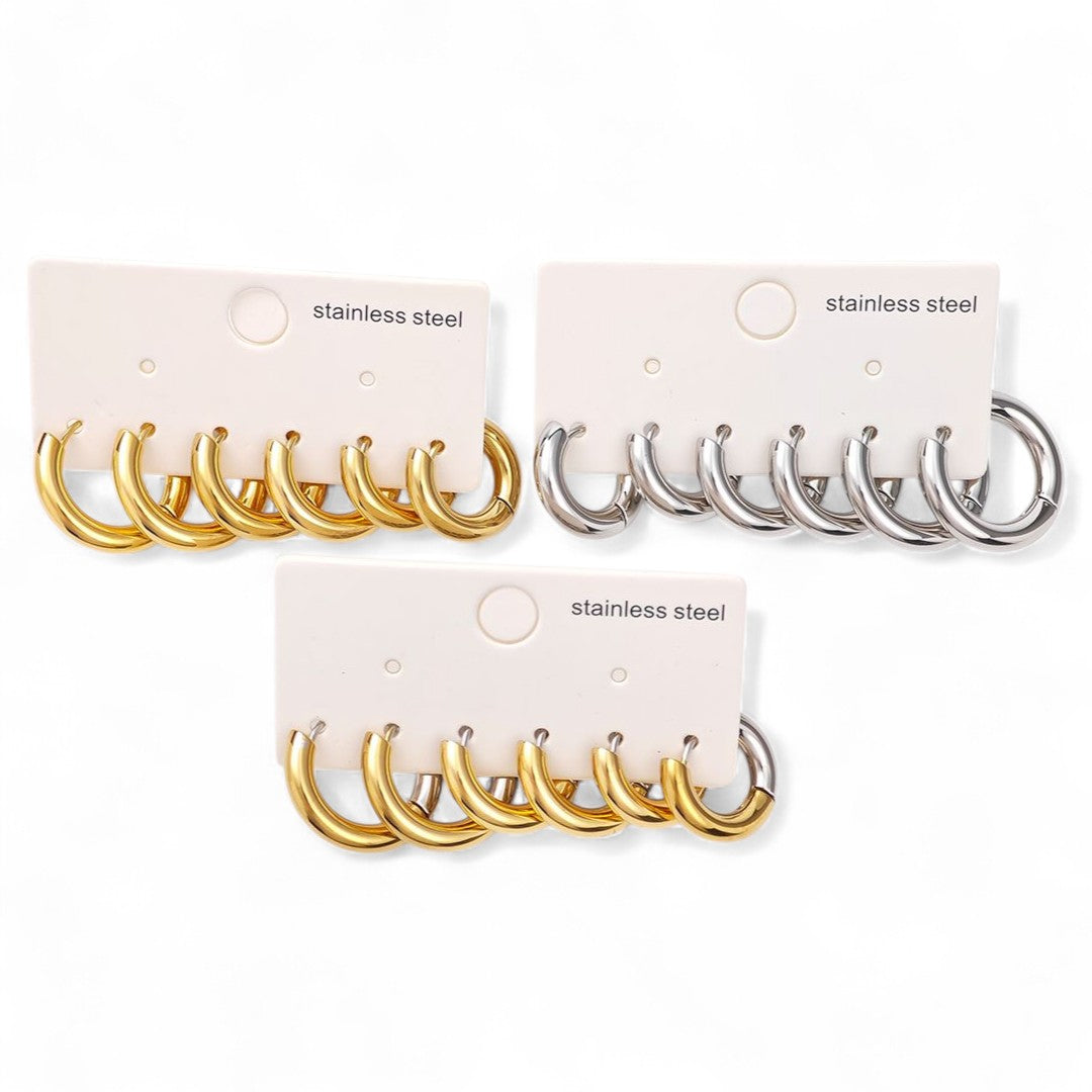 Περιλαμβάνει 3 ζευγάρια κρίκων διαφορετικού μεγέθους, από ατσάλι stainless steel, σε χρυσό ή ασημί φινίρισμα.