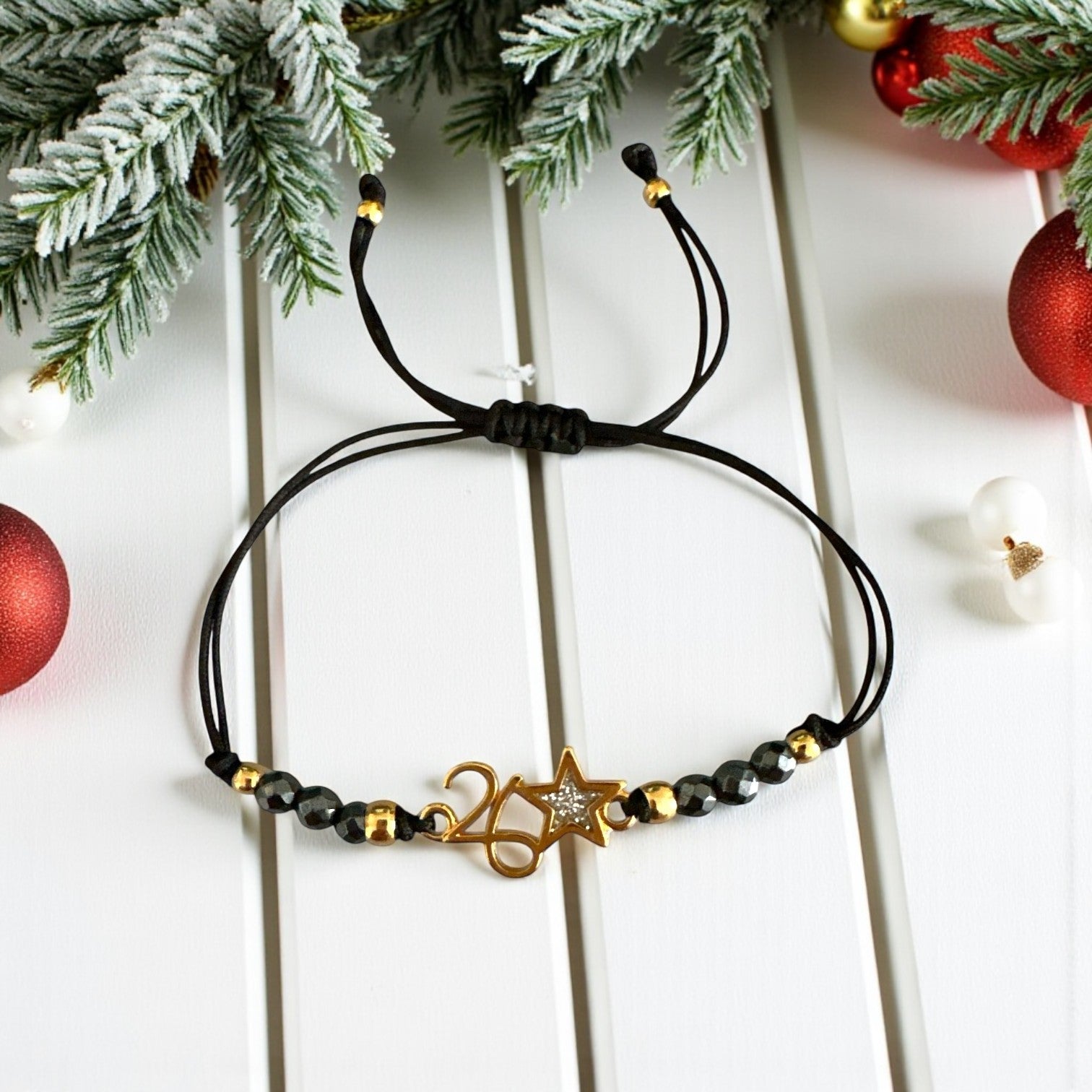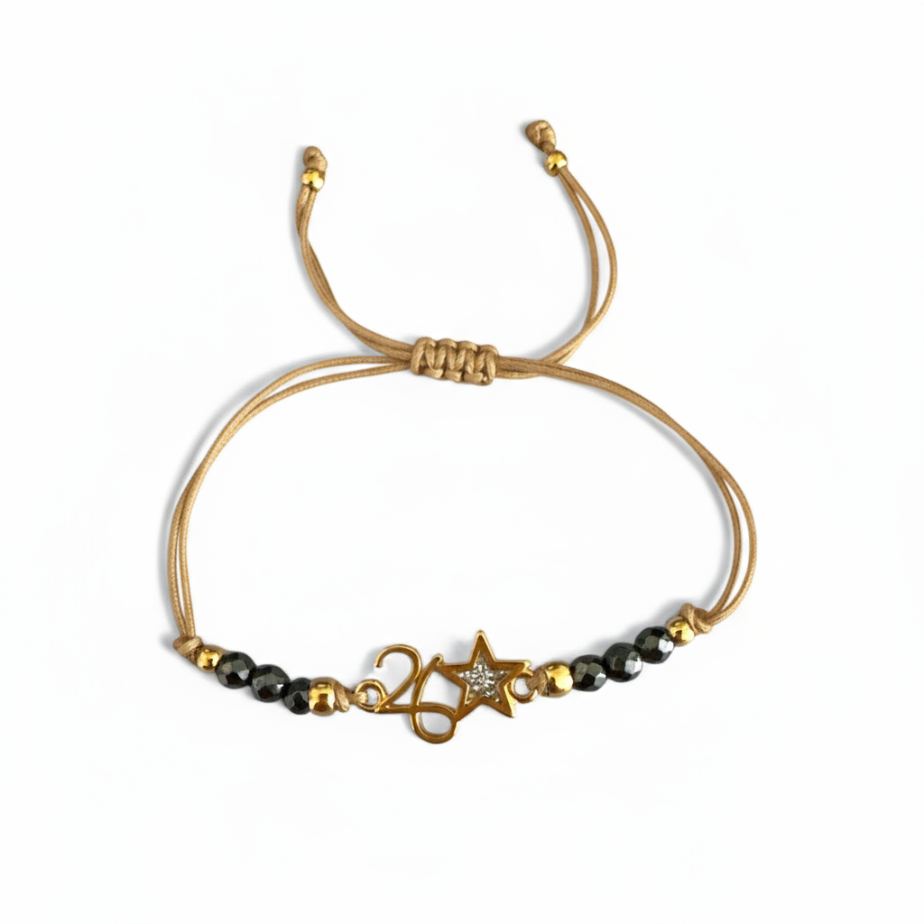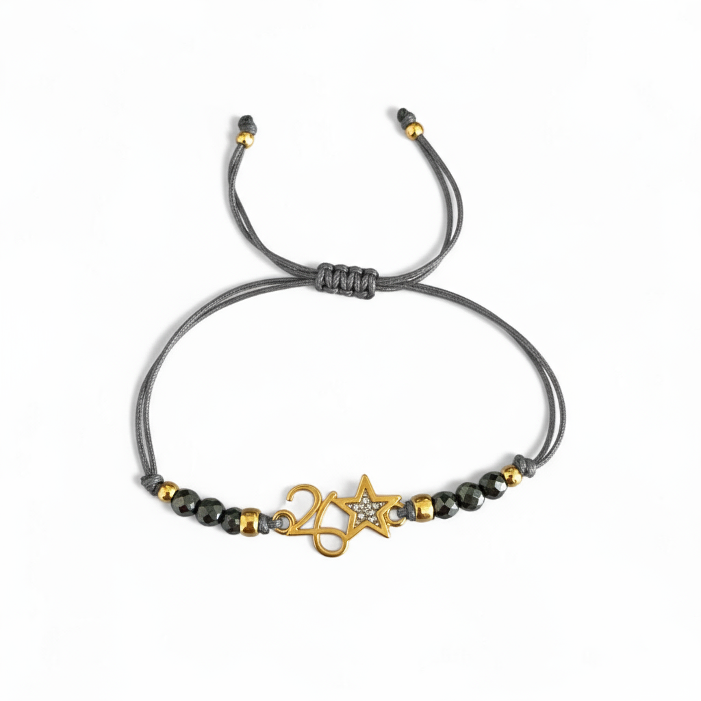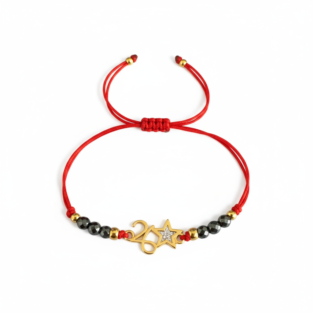 Συνδυάζει χάντρες αιματίτη με ένα επίχρυσο μοτίφ “26” και ένα αστεράκι με glitter, που συμβολίζει την τύχη και το φως σου για το νέο έτος.