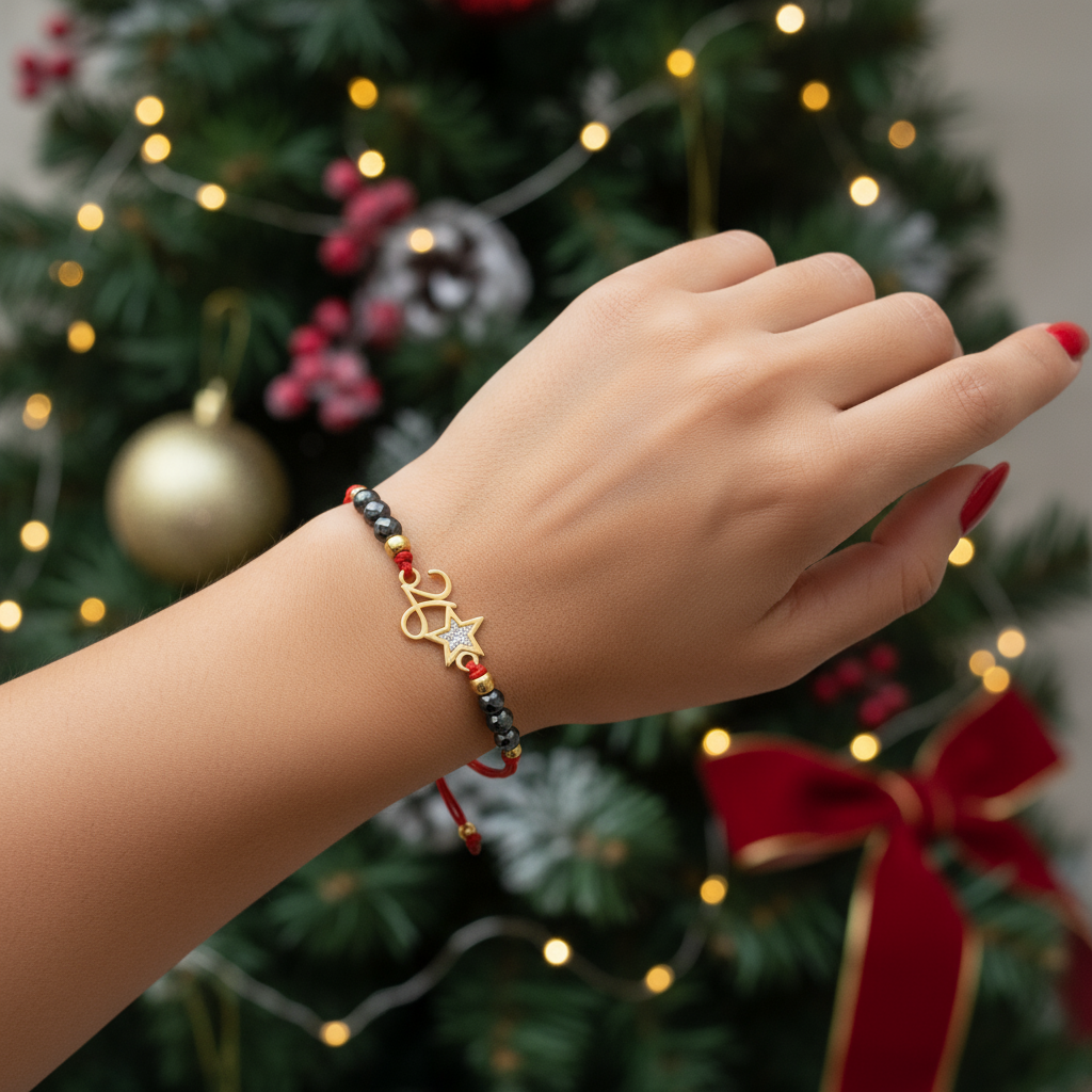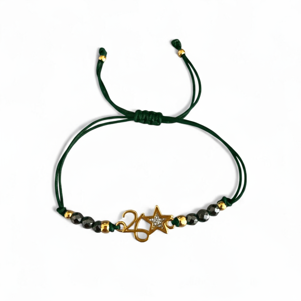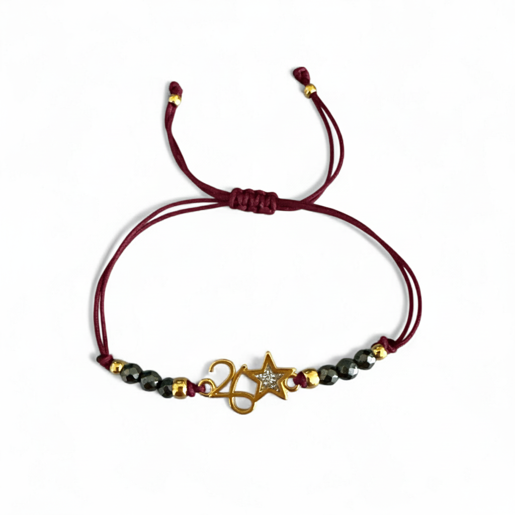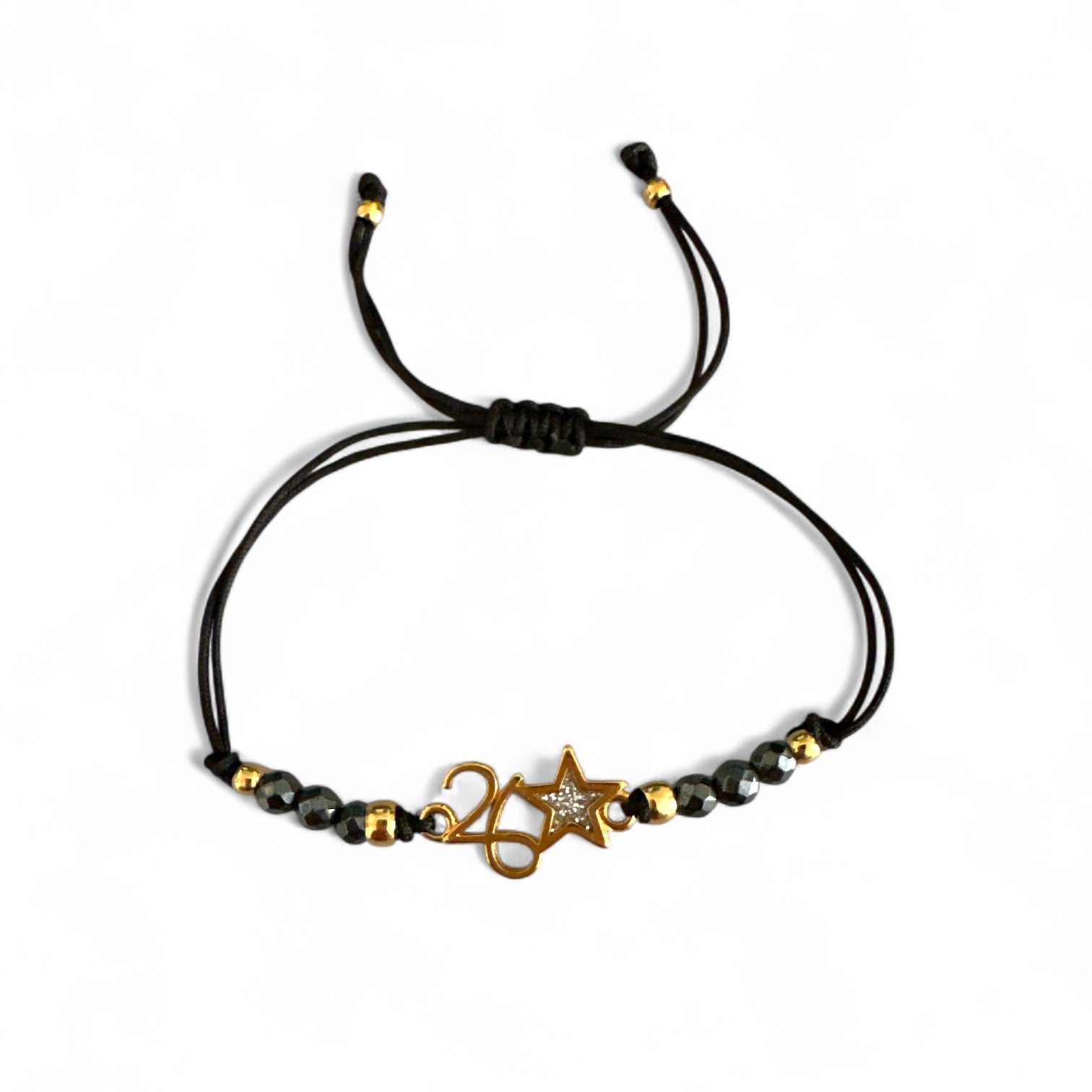 Συνδυάζει χάντρες αιματίτη με ένα επίχρυσο μοτίφ “26” και ένα αστεράκι με glitter, που συμβολίζει την τύχη και το φως σου για το νέο έτος.