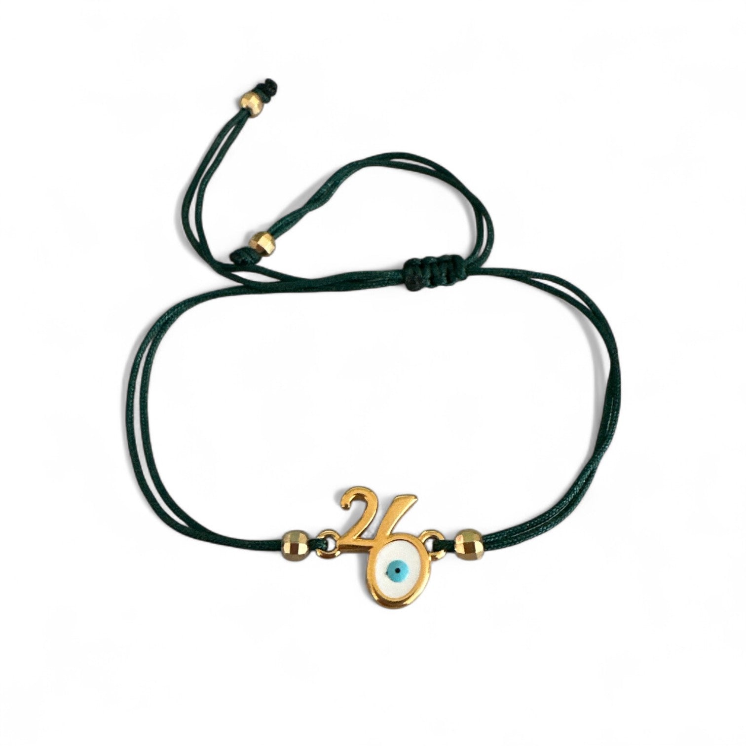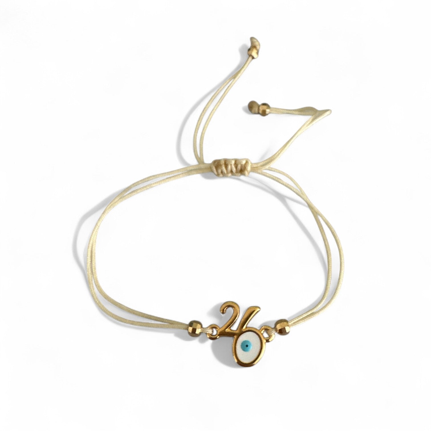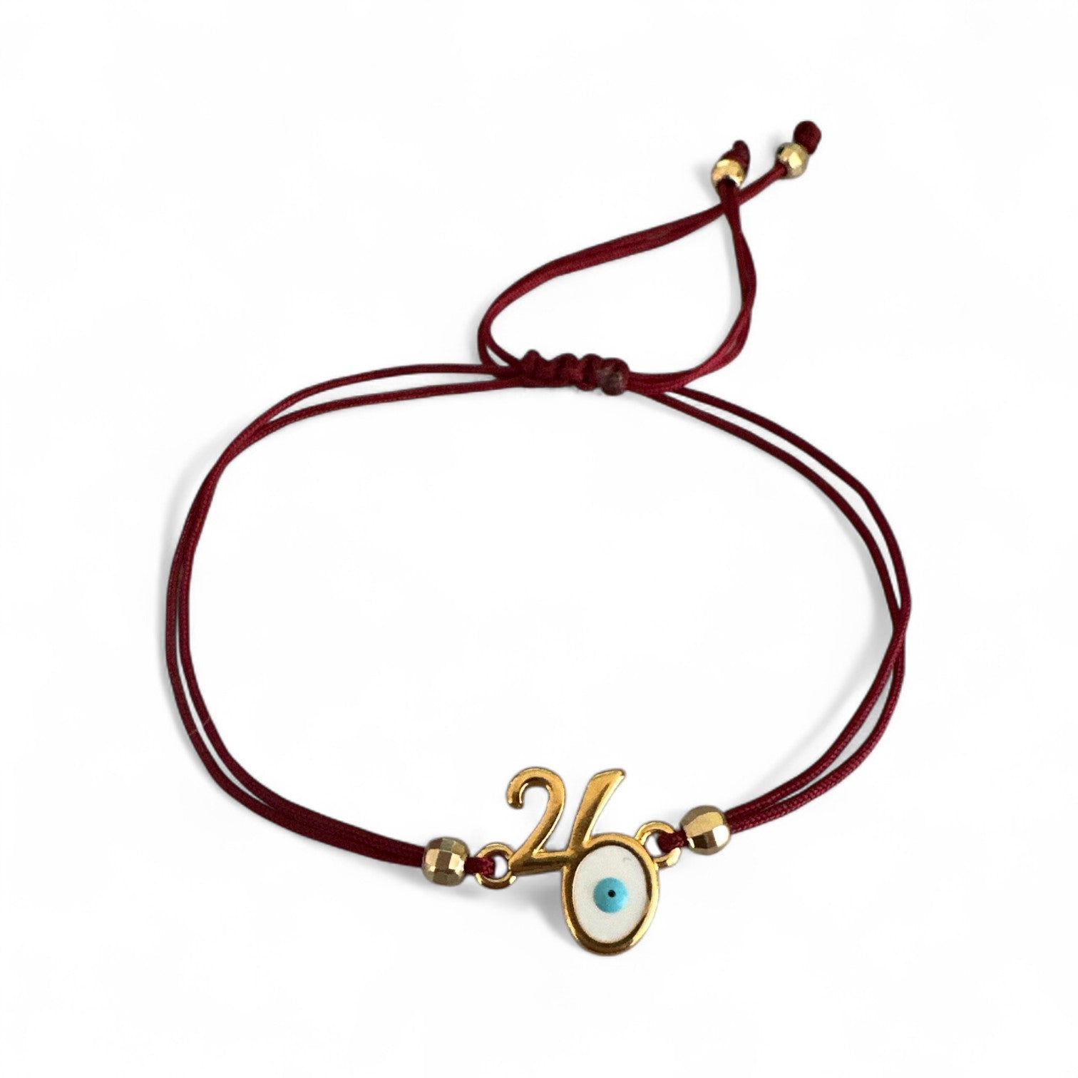 Χειροποίητο βραχιόλι γούρι 2026 με μοτίφ “26” και ματάκι προστασίας, δεμένο σε χρωματιστό κορδόνι ρυθμιζόμενου μεγέθους.