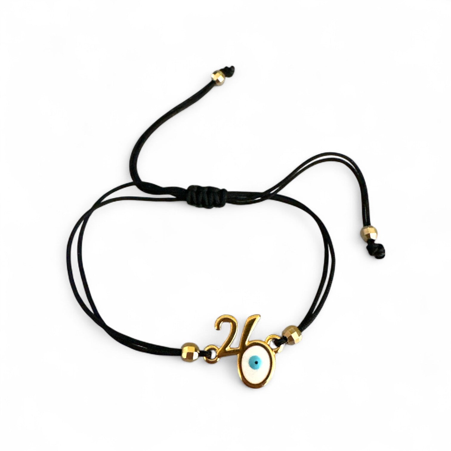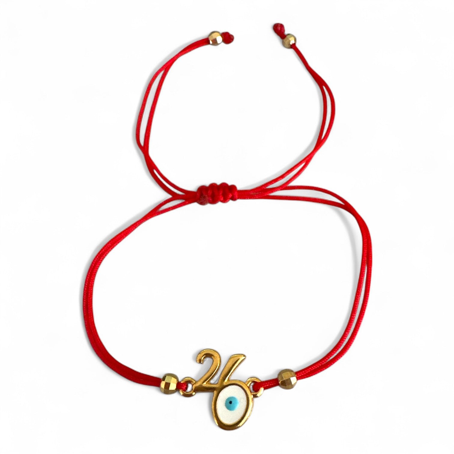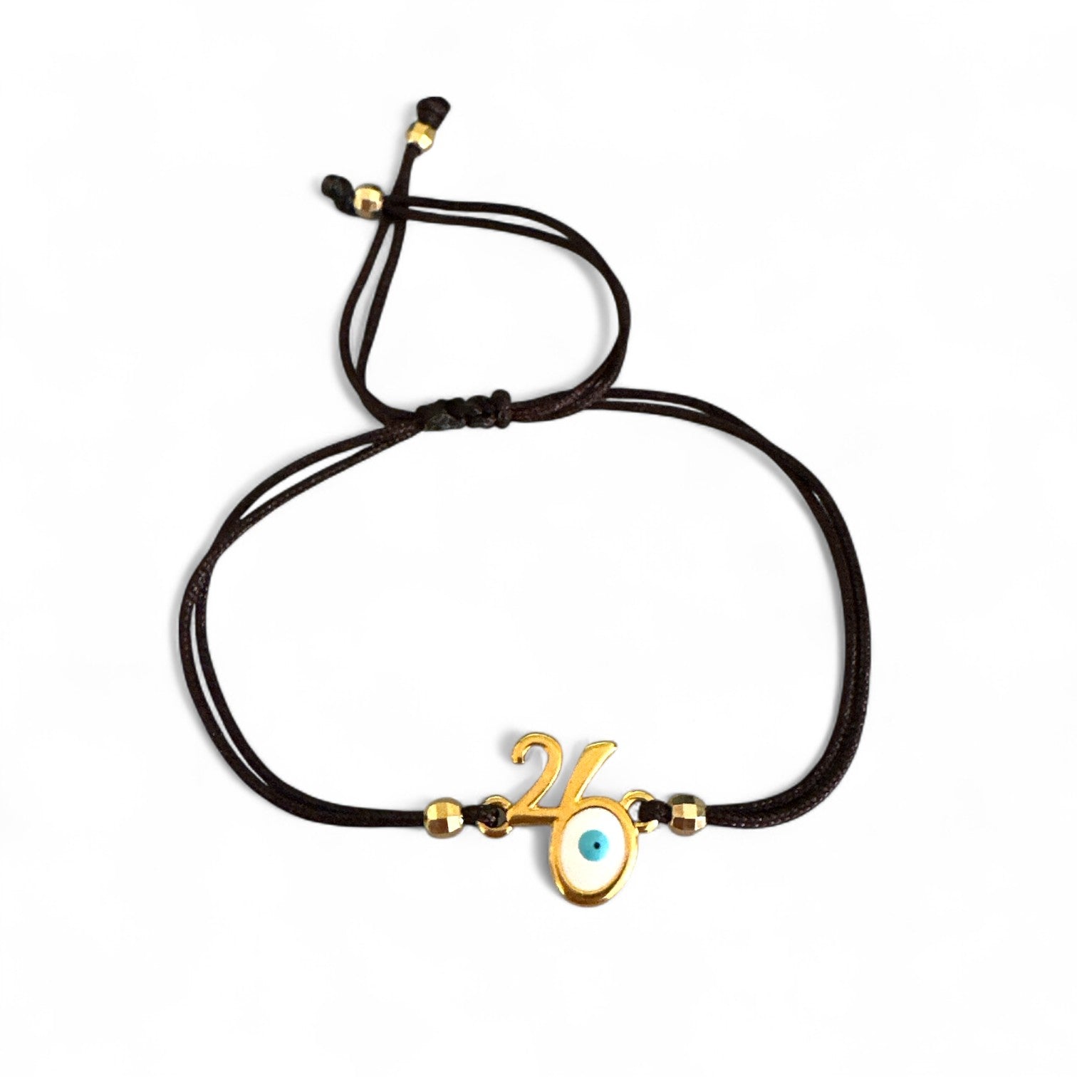Χειροποίητο βραχιόλι γούρι 2026 με μοτίφ “26” και ματάκι προστασίας, δεμένο σε χρωματιστό κορδόνι ρυθμιζόμενου μεγέθους.
