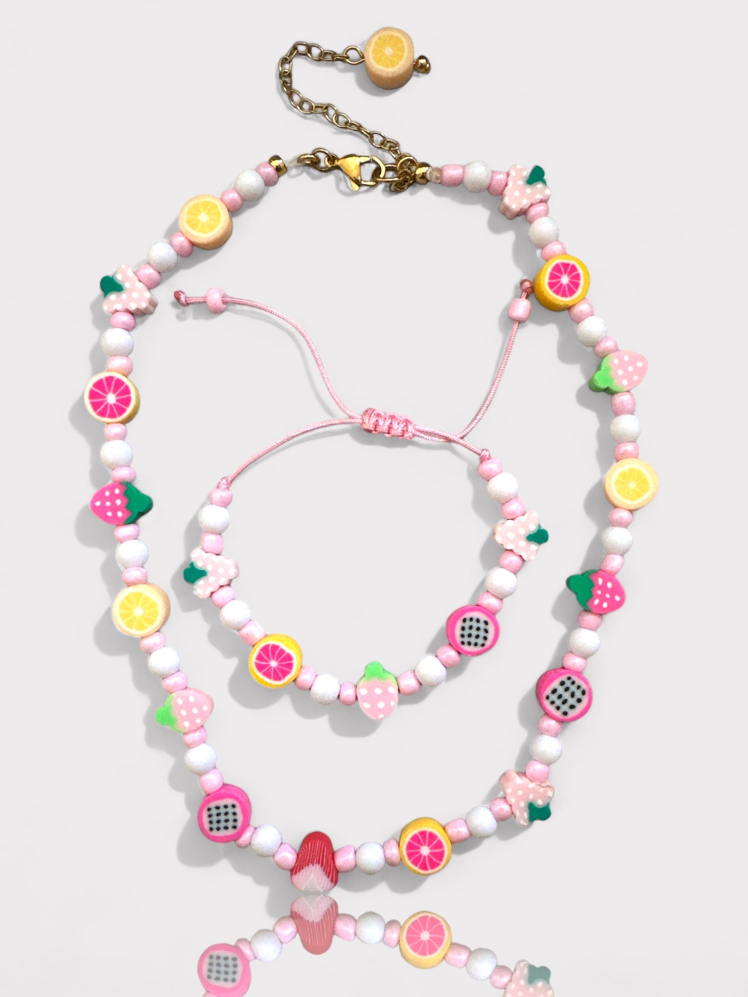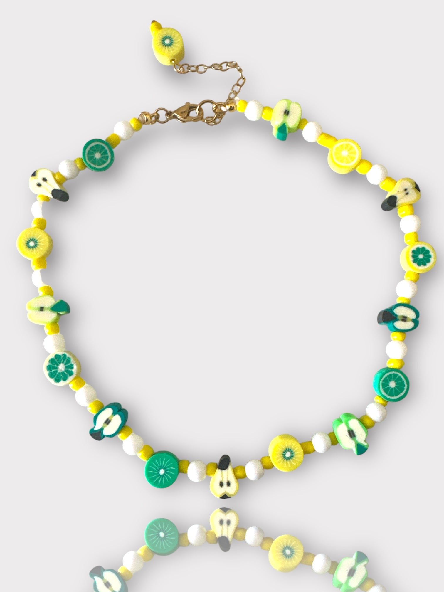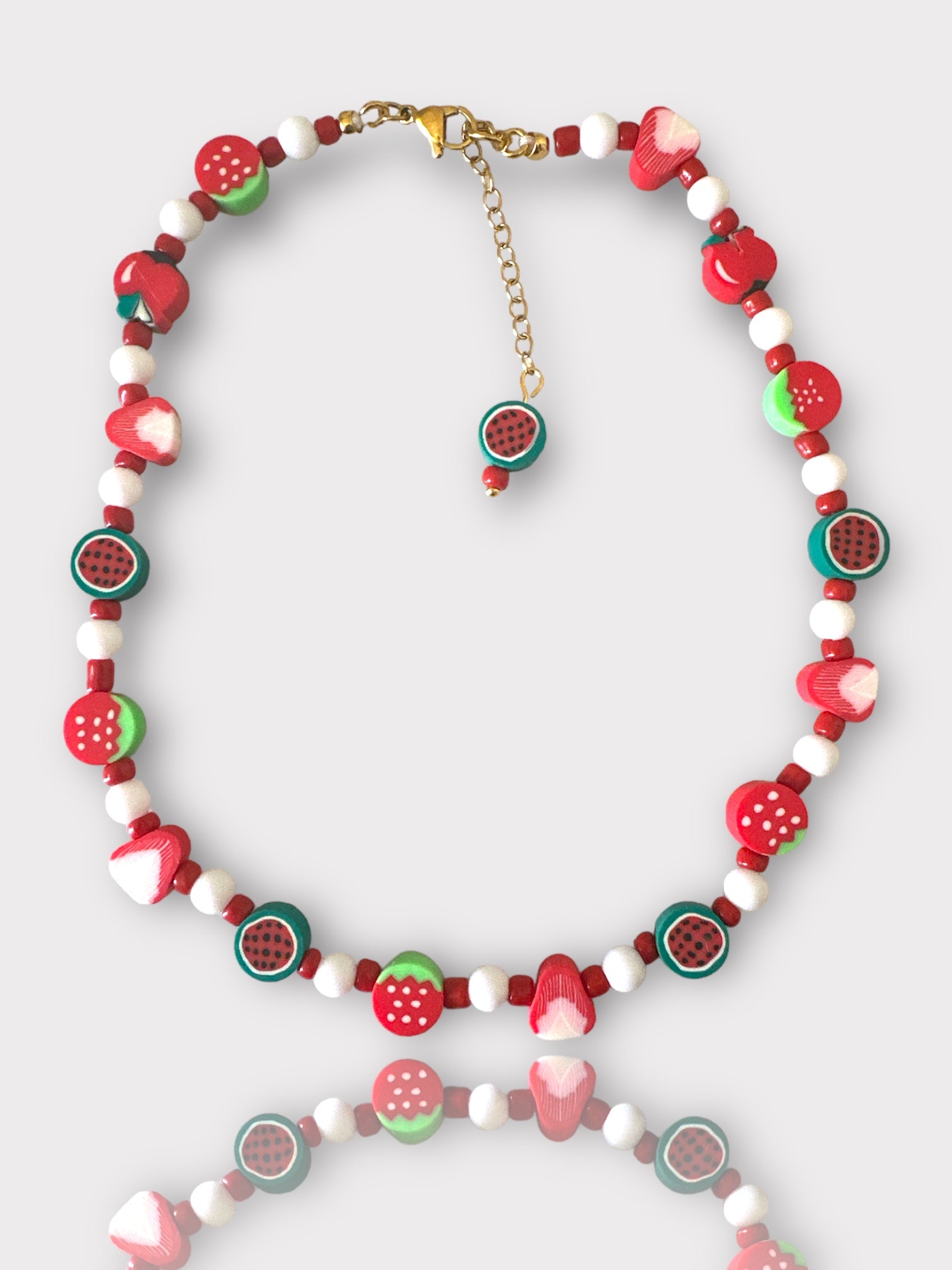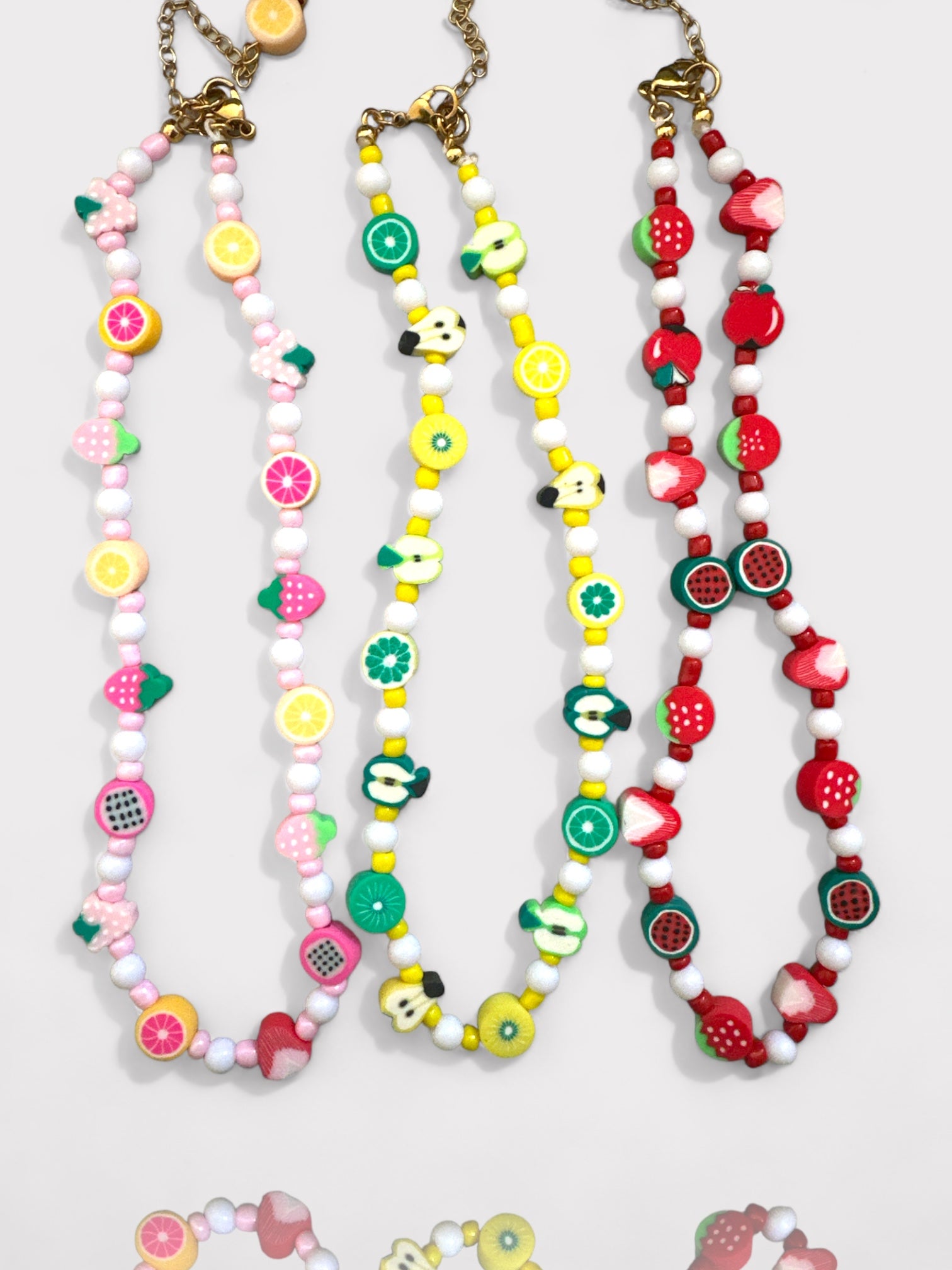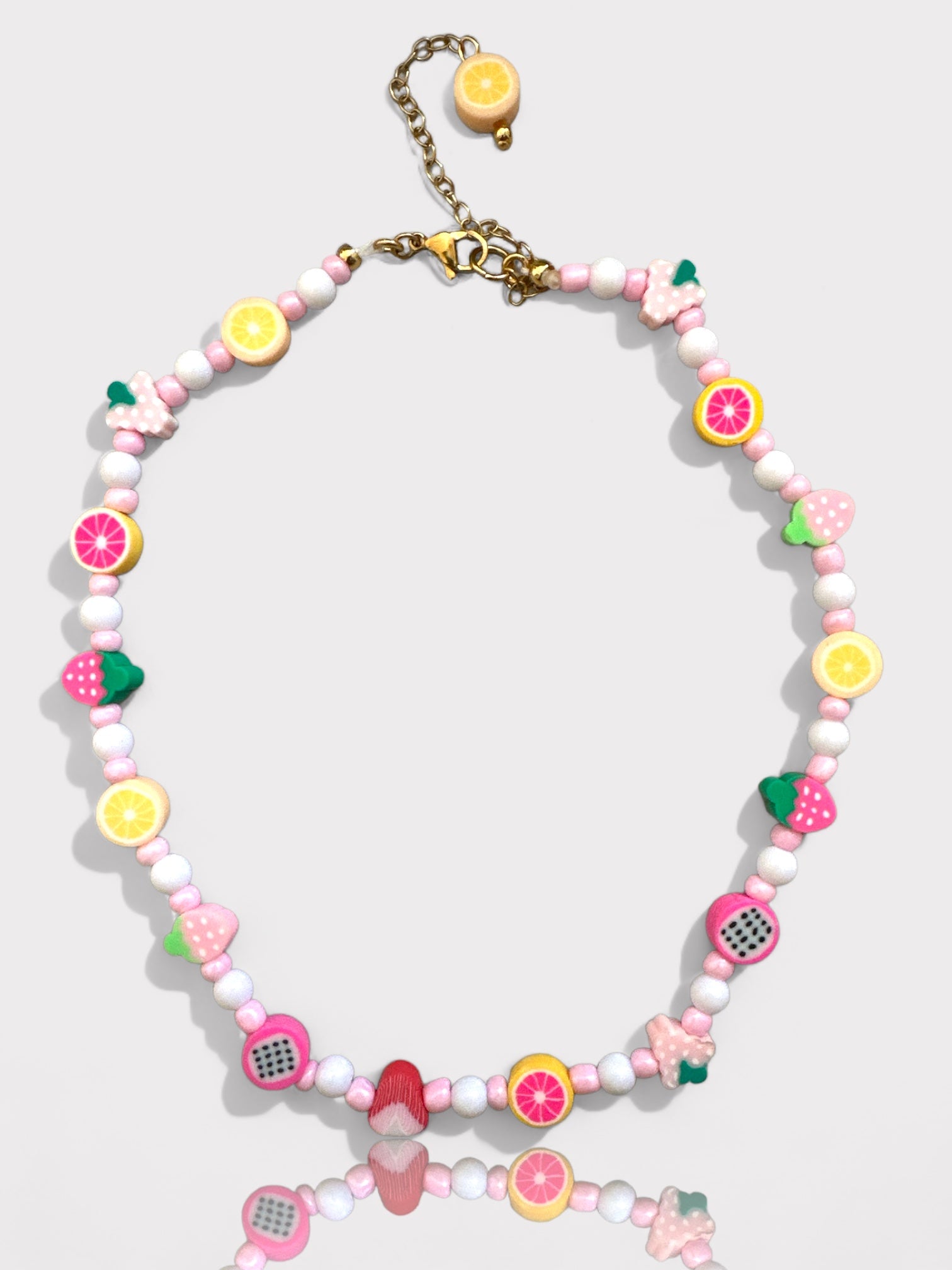 Χειροποίητο κολιέ με γυάλινες χάντρες, ακρυλικές χάντρες φίμο με διάφορα φρουτάκια και ατσάλινο κούμπωμα.
