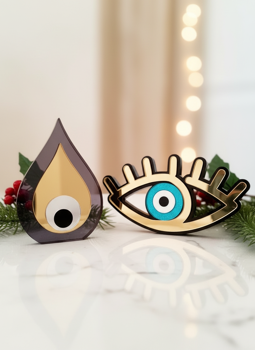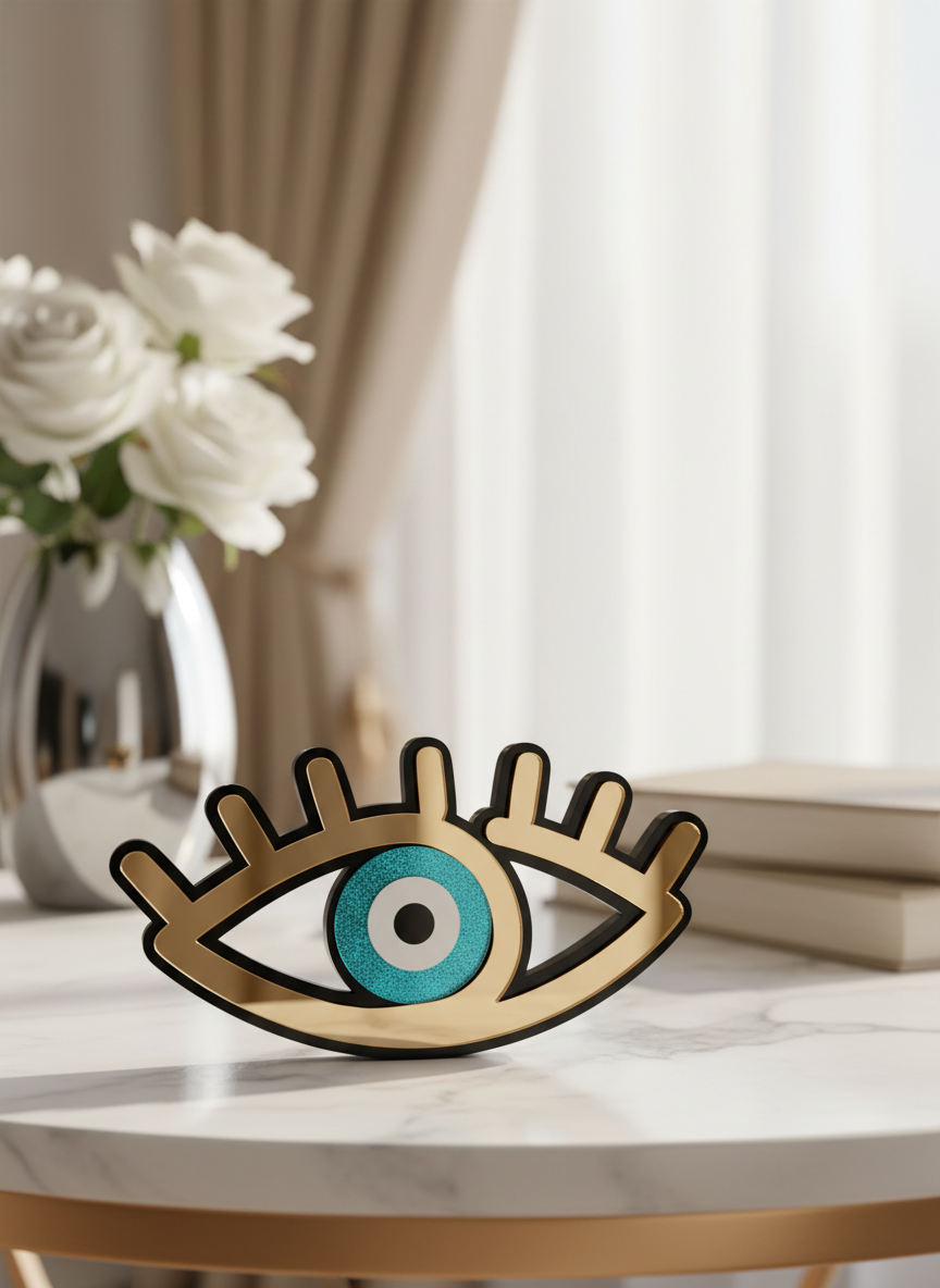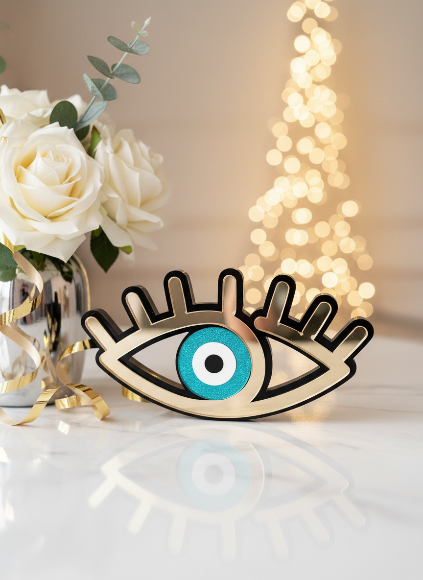 Ένα εντυπωσιακό επιτραπέζιο γούρι–μάτι, με ιδιαίτερο design που συνδυάζει την κομψότητα του χρυσού καθρέφτη με τη ζωντάνια του τυρκουάζ mirror plexiglass.