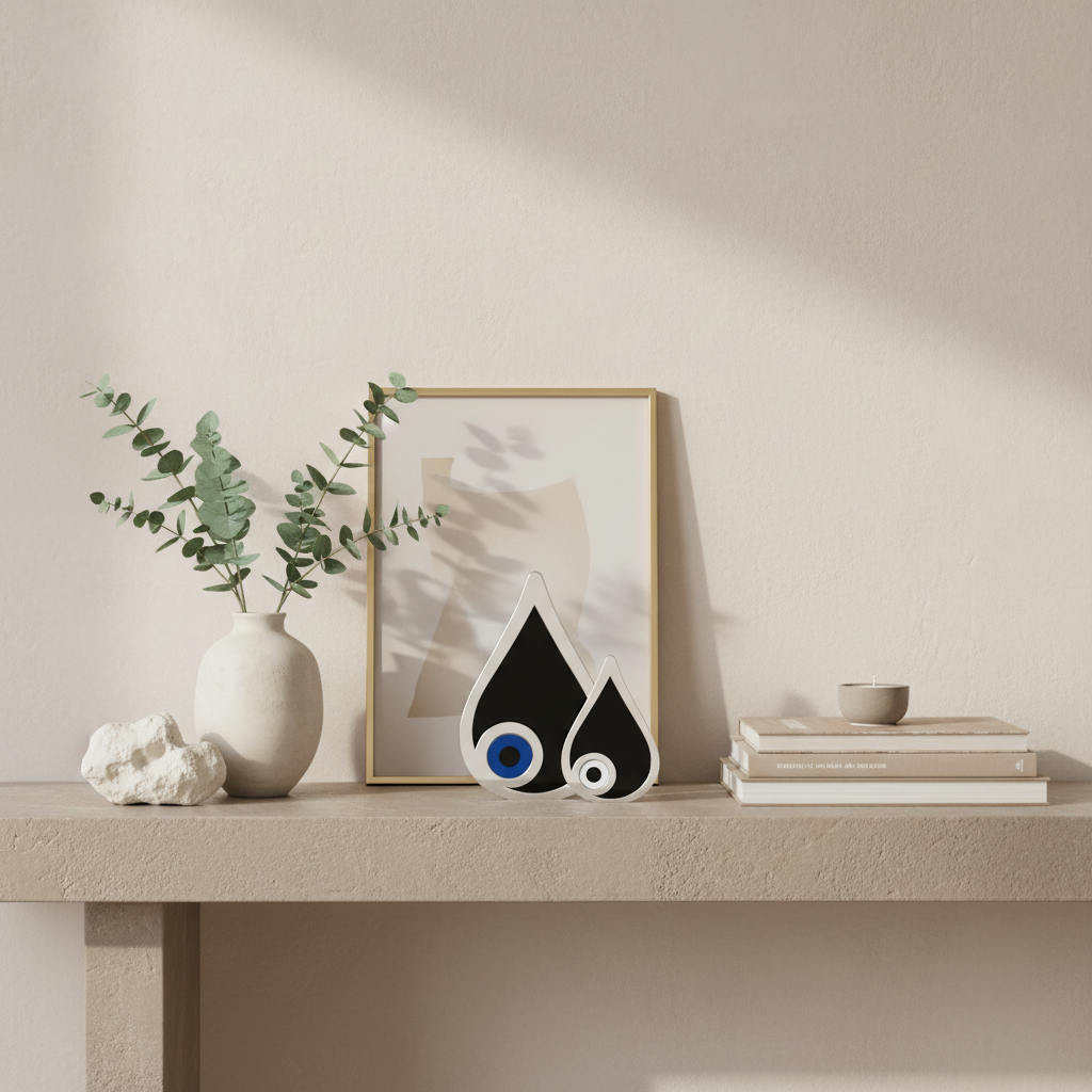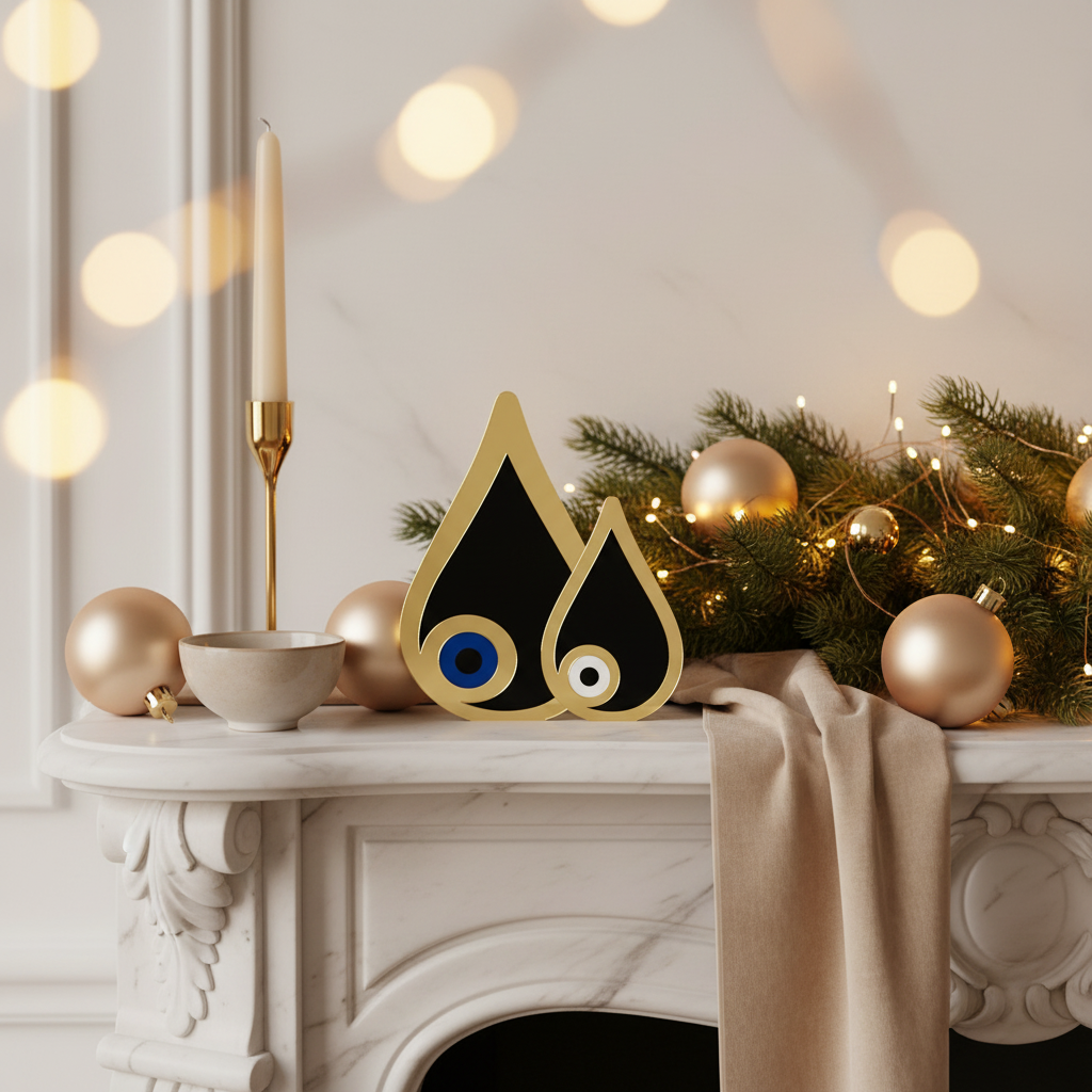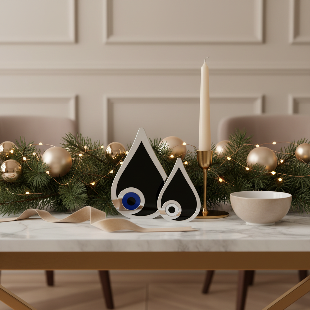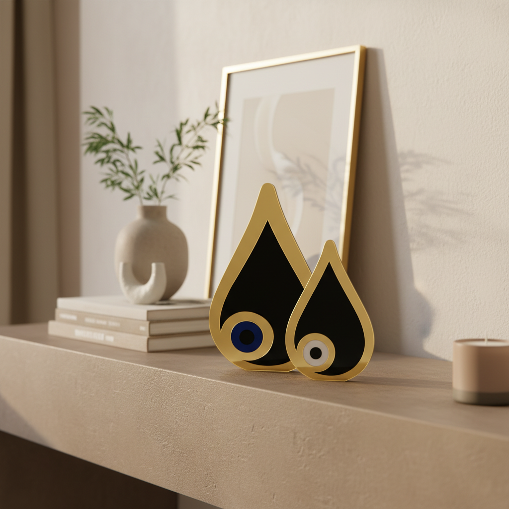 Ένα μοναδικό χειροποίητο γούρι μάτι σε σχήμα δάκρυ, κατασκευασμένο από πλεξιγκλάς καθρέφτη σε χρυσό ή ασημί φινίρισμα. Η μοντέρνα γραμμή του συνδυάζει την προστατευτική δύναμη του ματιού με την κομψότητα του minimal design, καθιστώντας το ιδανικό για δώρο καλοτυχίας ή σύγχρονη διακόσμηση σπιτιού.