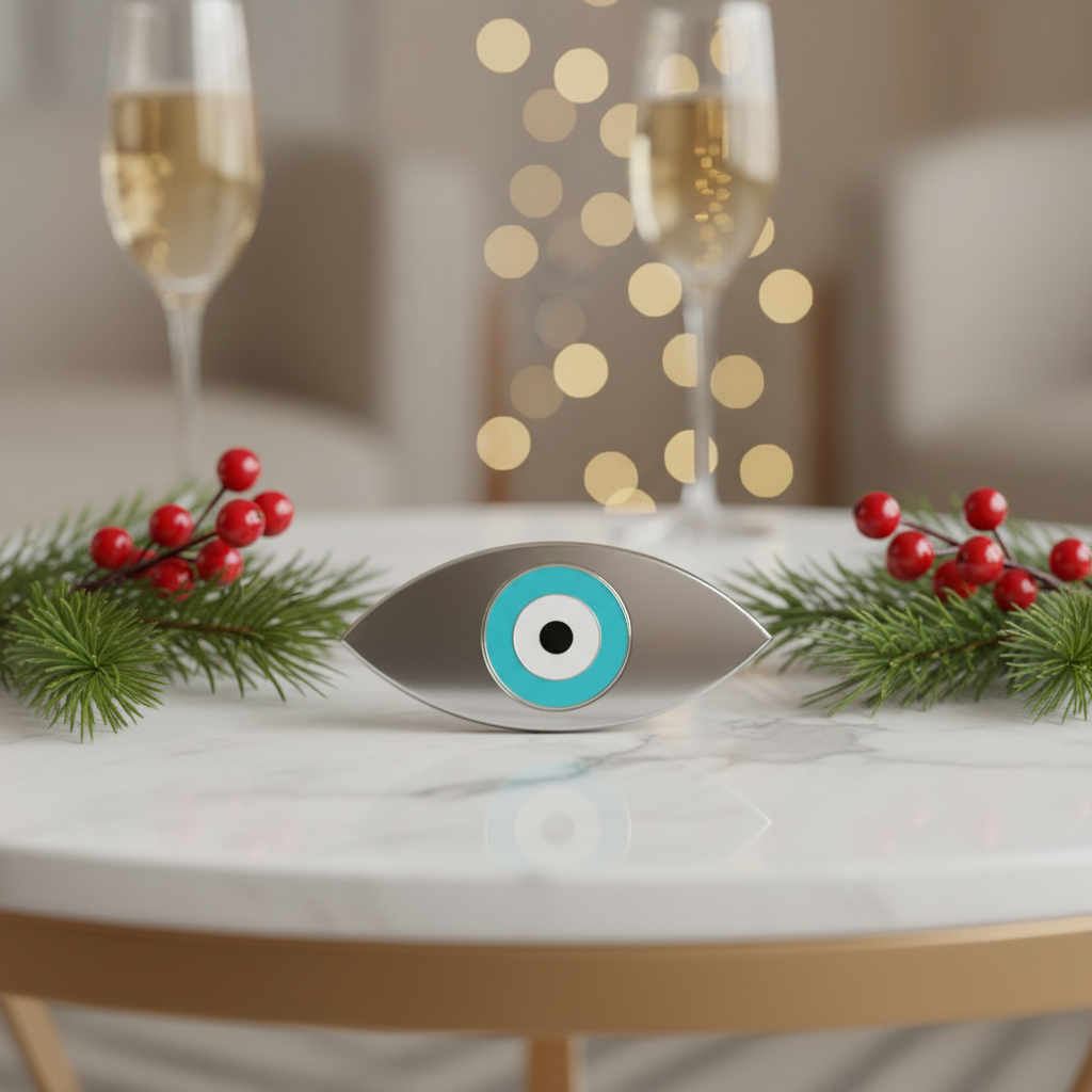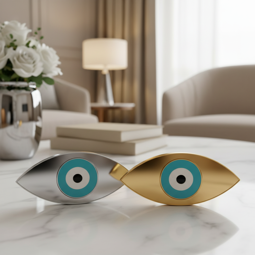 Το κεντρικό μάτι από τυρκουάζ καθρέφτη προσθέτει έντονο συμβολισμό προστασίας και θετικής ενέργειας, ενώ η minimal–luxury αισθητική το καθιστά ιδανικό για κάθε μοντέρνο χώρο.