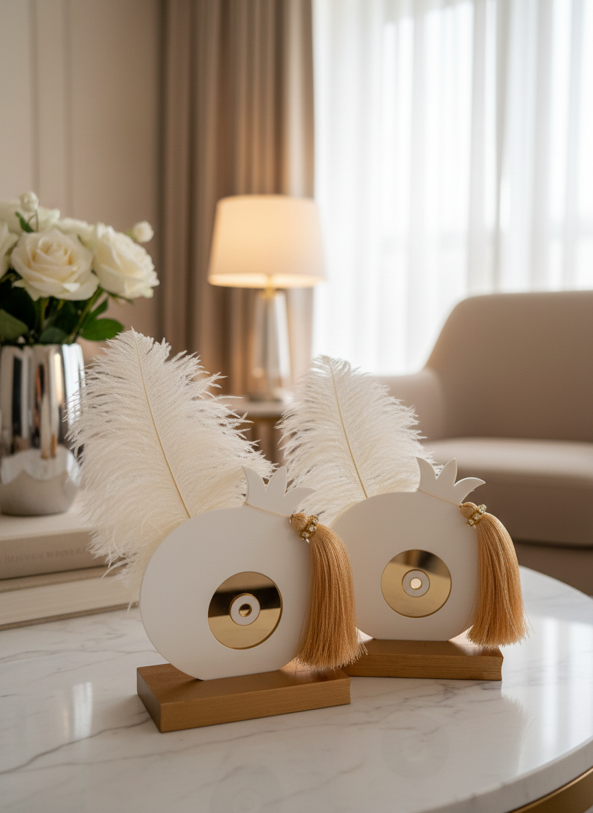 Κατασκευασμένο στο εργαστήριό μας από λευκό plexiglass και μάτι από χρυσό plexiglass καθρέφτη, τοποθετημένο πάνω σε ξύλινη βάση.