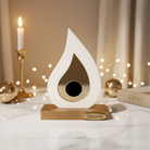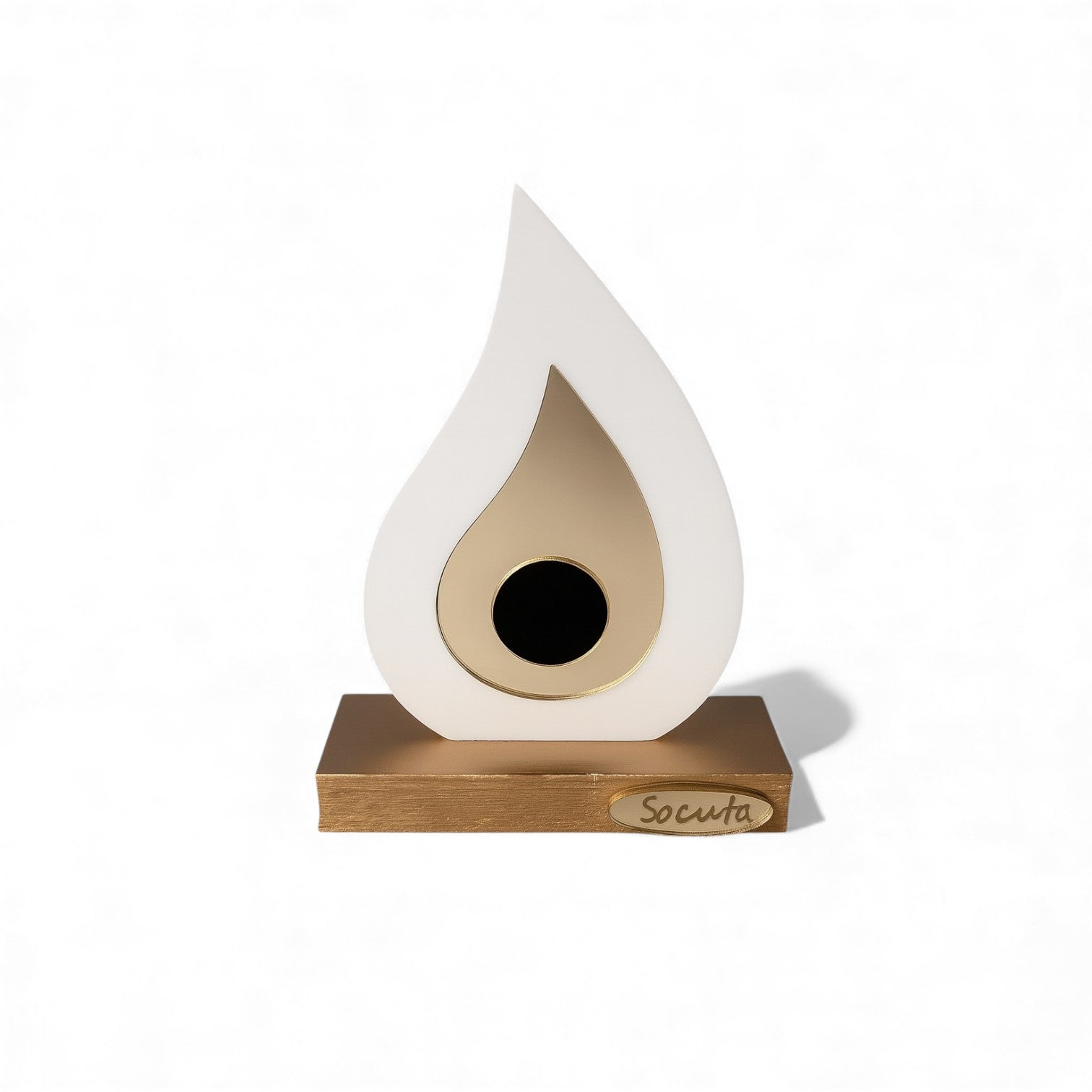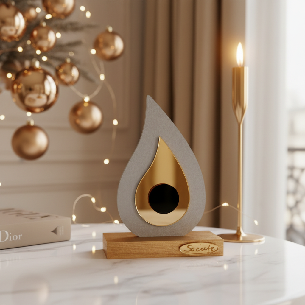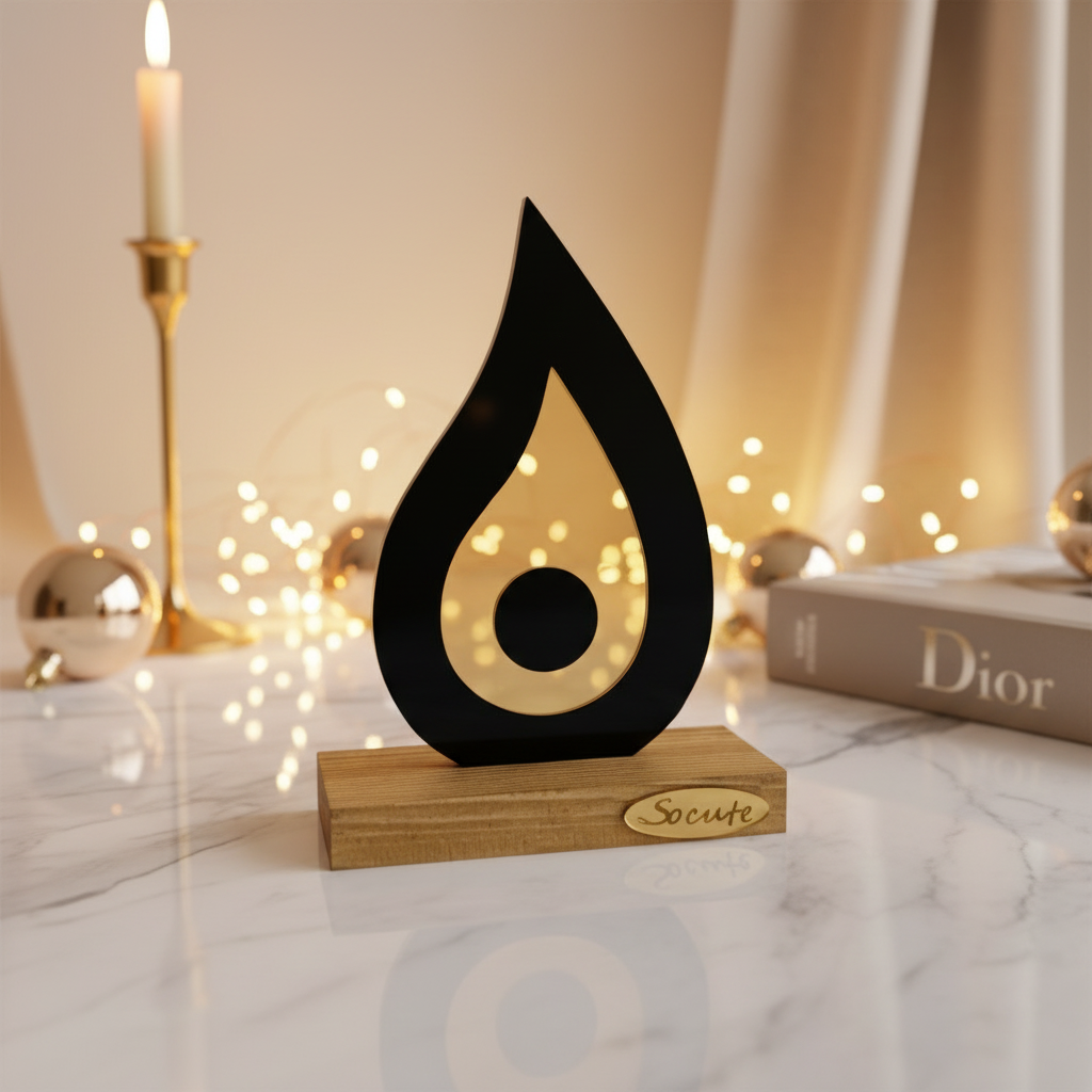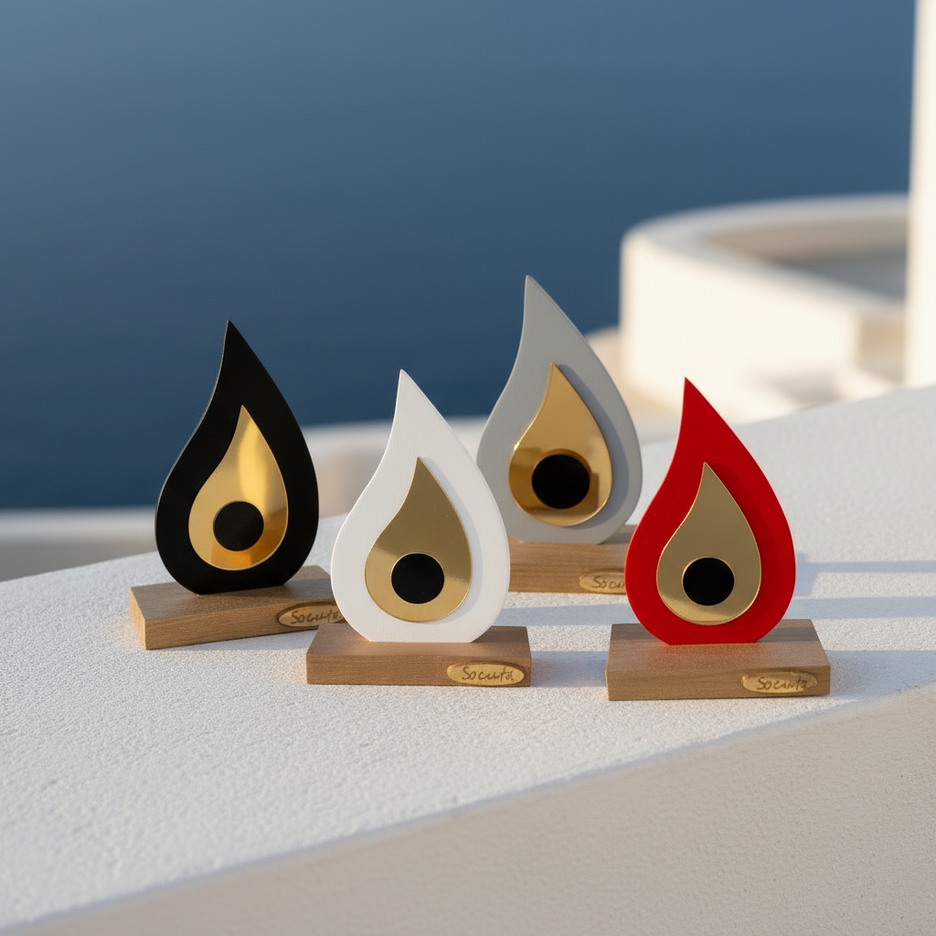 Τοποθετημένο σε ξύλινη βάση, αποτελεί ένα minimal–luxury διακοσμητικό με έντονο συμβολισμό προστασίας και κομψότητας.