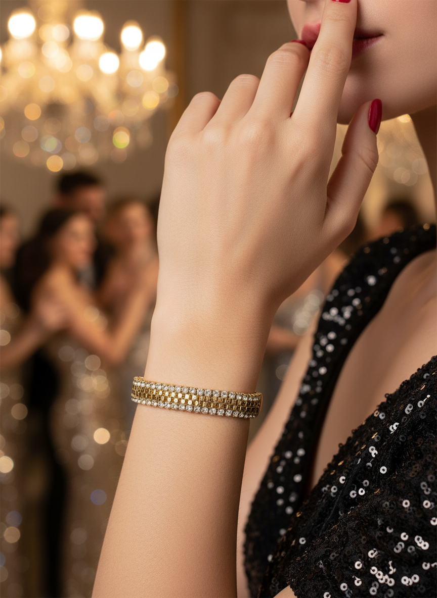 Ένα statement κομμάτι που συνδυάζει τη λάμψη των κρυστάλλων με την πολυτέλεια του χρυσού. Το Louvre βραχιόλι διαθέτει διπλή σειρά από λαμπερά στρας πάνω σε χρυσή βάση ατσάλι, ιδανικό για βραδινές εμφανίσεις αλλά και glam all-day σύνολα.