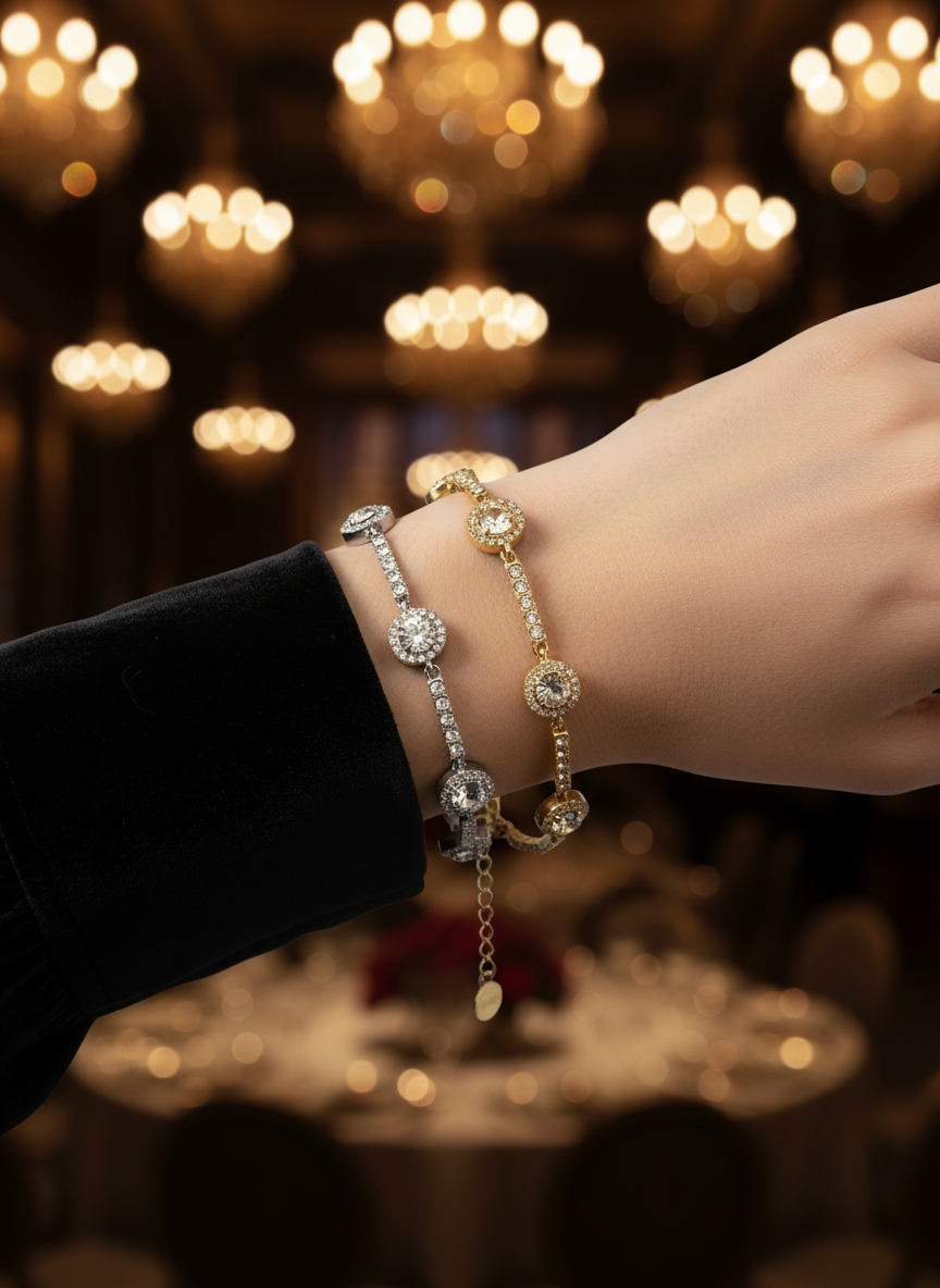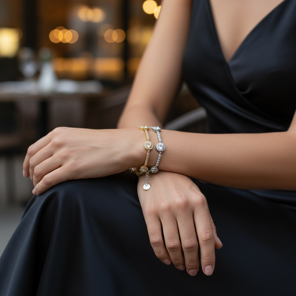 Το Starlight είναι το απόλυτο glam βραχιόλι για τις βραδινές σου εξόδους – και όχι μόνο. Φτιαγμένο από ανοξείδωτο ατσάλι, διακοσμημένο με στρας και λαμπερά ζιργκόν σε κυκλικά μοτίφ και γραμμικές λεπτομέρειες, συνδυάζει πολυτέλεια και διαχρονικό στυλ.