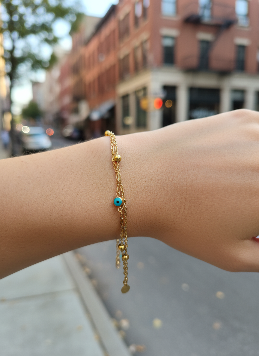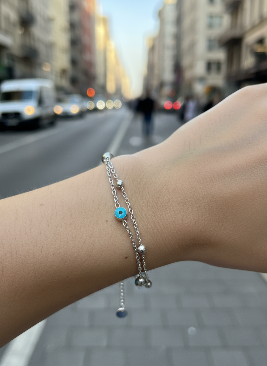 Δώσε στυλ και προστασία σε κάθε σου εμφάνιση με το ατσάλινο διπλό βραχιόλι με ματάκια. Η διπλή λεπτή αλυσίδα του διακοσμείται με στρογγυλές μπίλιες και μικρά γαλάζια ματάκια, δημιουργώντας έναν τέλειο συνδυασμό girly και boho αισθητικής. Διατίθεται σε ασημί και χρυσή απόχρωση για να ταιριάζει με κάθε look.