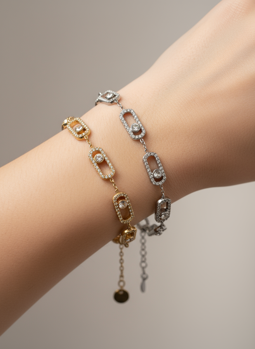 Η λάμψη συναντά τη μοντέρνα κομψότητα στο “Sparkle Links”. Κατασκευασμένο από υποαλλεργικό ανοξείδωτο ατσάλι, διαθέτει πρωτότυπους κρίκους ορθογώνιου σχήματος με pavé ζιργκόν και κεντρικό μονό ζιργκόν σε κάθε κρίκο. Διατίθεται σε χρυσή και ασημί απόχρωση για να ταιριάζει απόλυτα με το προσωπικό σου στυλ.