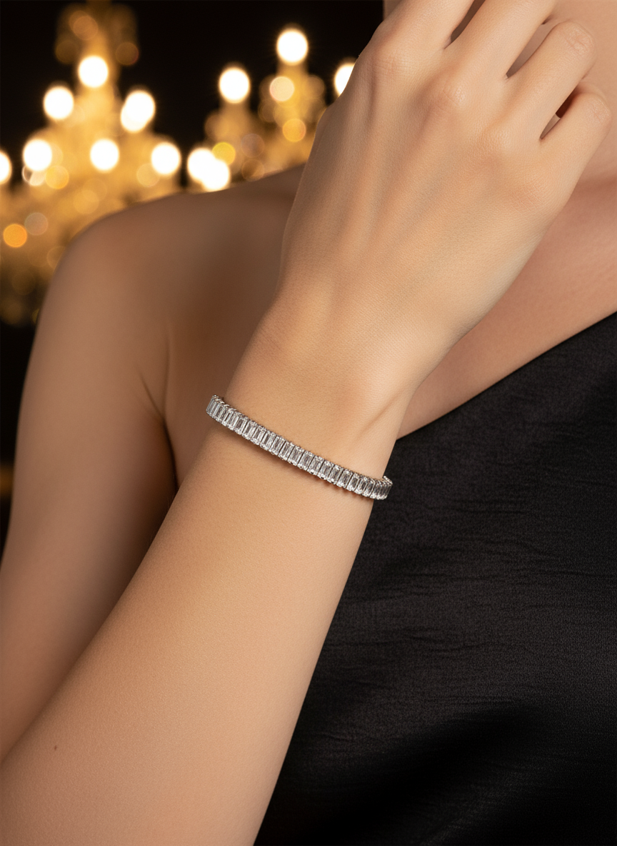 Λαμπερό και elegant, το Gina Bracelet είναι η επιτομή της βραδινής κομψότητας. Με πολυγωνικά ζιργκόν σε γραμμική διάταξη και μεταλλικό σώμα από ανοξείδωτο ατσάλι, αυτό το βραχιόλι προσφέρει διακριτική πολυτέλεια που δεν περνά απαρατήρητη. Συνδυάζεται ιδανικά με το ομώνυμο κολιέ για ένα ολοκληρωμένο glam look.