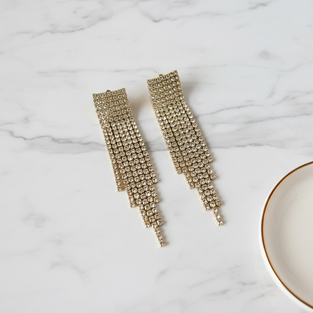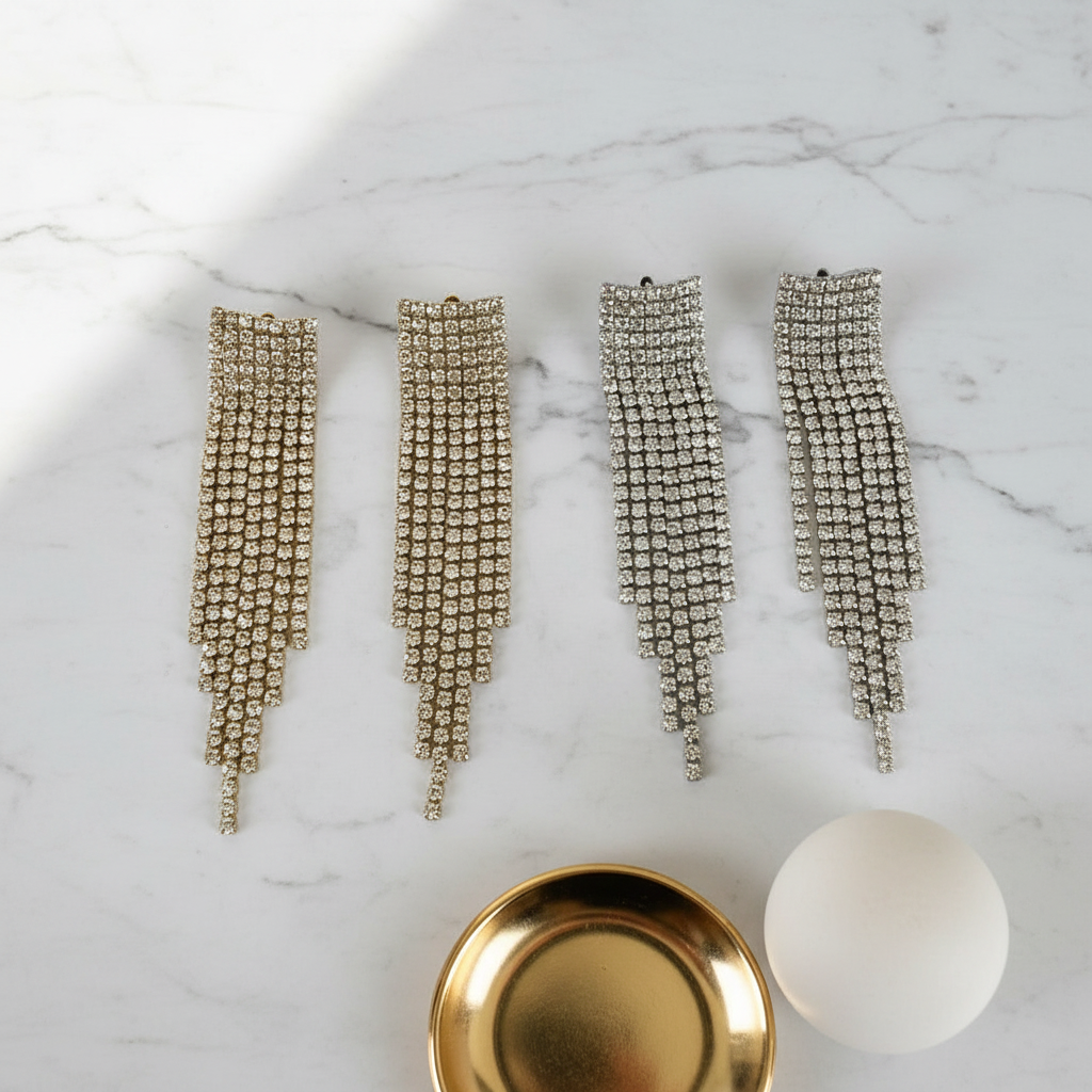 Τα Glam Cascade είναι κρεμαστά σκουλαρίκια από ανοξείδωτο ατσάλι, διακοσμημένα με σειρές λαμπερών strass που δημιουργούν εφέ καταρράκτη. Ζωντανή κίνηση, statement λάμψη και απόλυτα θηλυκό glam-look που αναβαθμίζει κάθε νυχτερινή εμφάνιση.