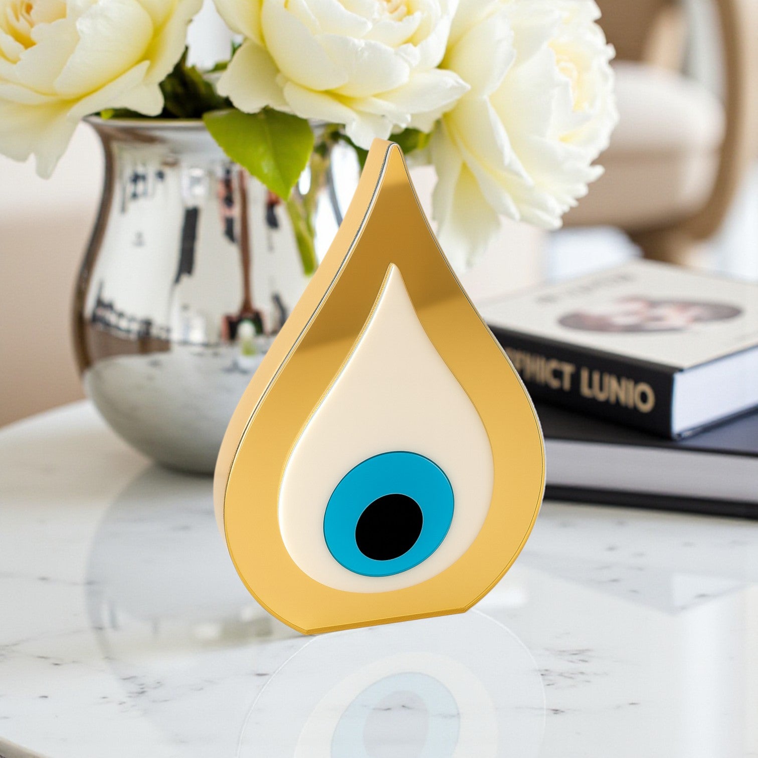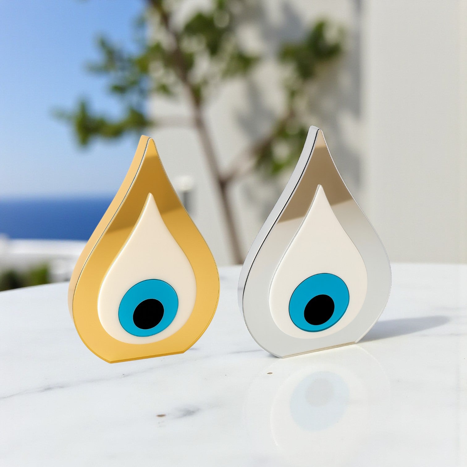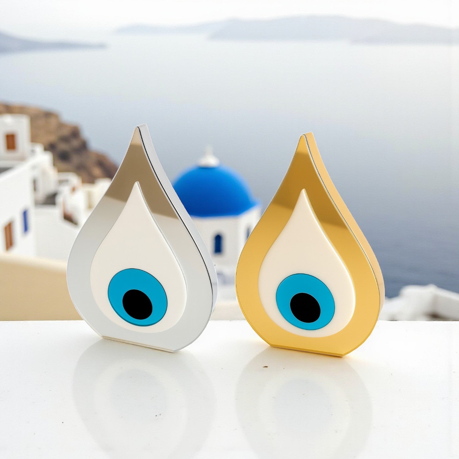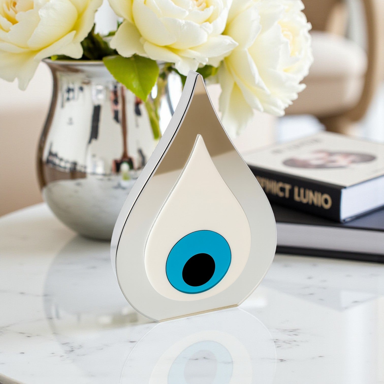 Επιτραπέζιο γούρι σε σχήμα σταγόνας με μάτι από πλεξιγκλάς καθρέφτη, συνδυάζοντας μοντέρνα αισθητική και παραδοσιακούς συμβολισμούς προστασίας.