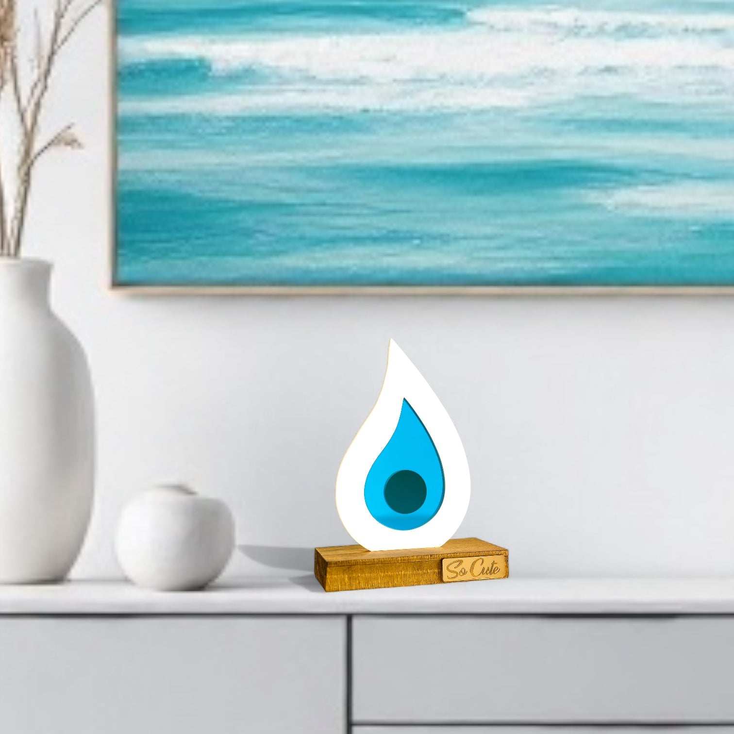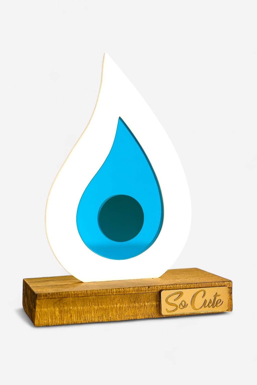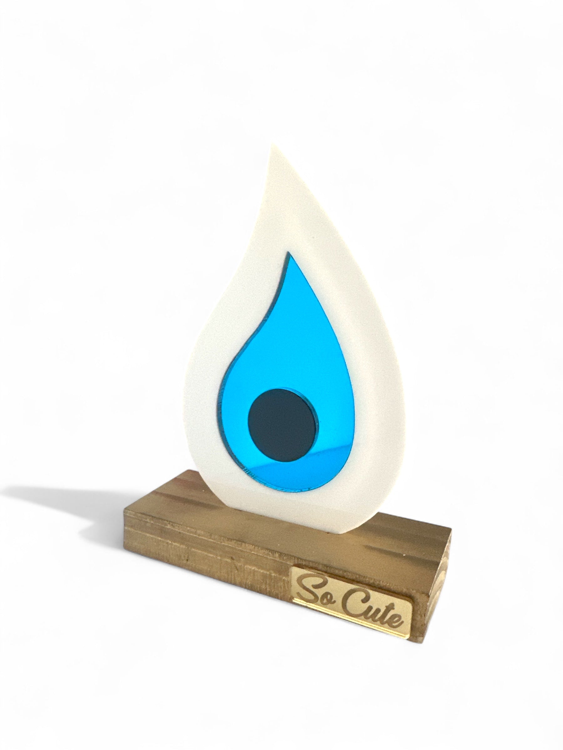 Ένα μοναδικό χειροποίητο γούρι σε σχήμα σταγόνας με μάτι από plexiglass και τυρκουάζ mirror λεπτομέρεια, τοποθετημένο σε ξύλινη επιτραπέζια βάση.