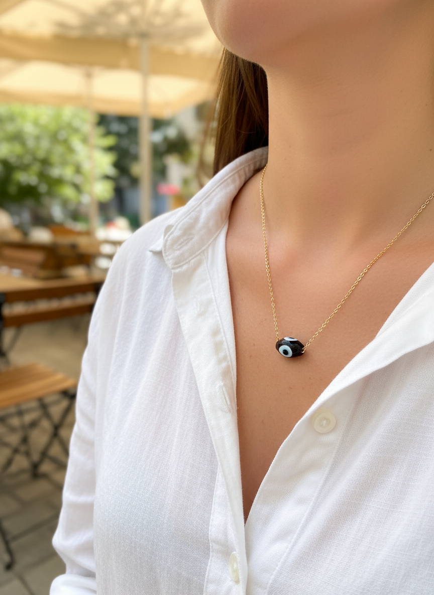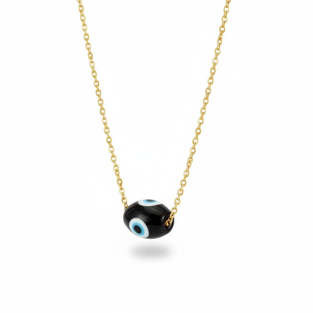 Το χειροποίητο κολιέ με λεπτή ατσάλινη αλυσίδα και γυάλινη χάντρα-μάτι σε σχήμα βαρελάκι είναι το everyday piece που δεν θα αποχωριστείς.