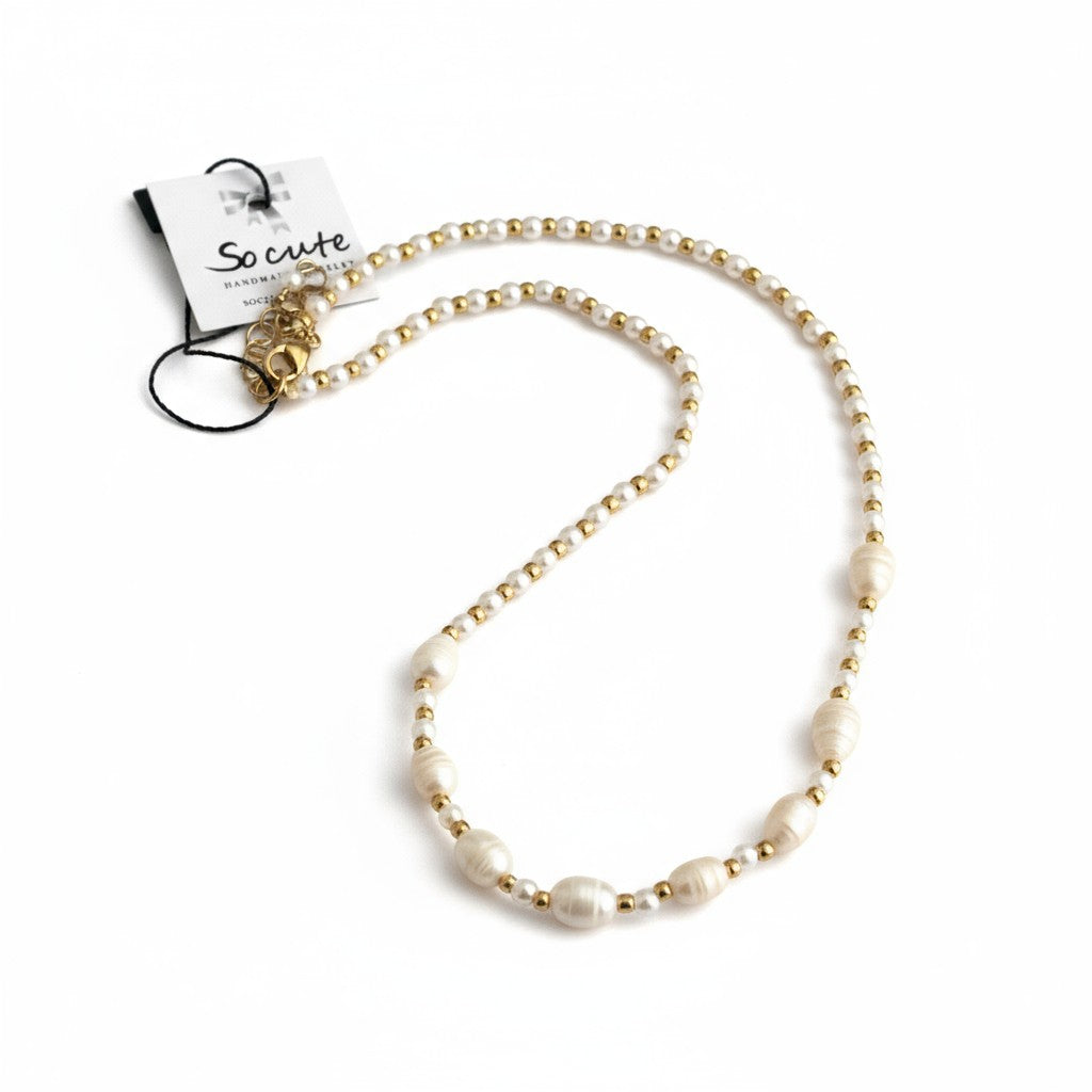 Το χειροποίητο κοντό κολιέ συνδυάζει γυάλινες πέρλες με ακανόνιστες ακρυλικές πέρλες στο κέντρο, δημιουργώντας ένα natural-lux αποτέλεσμα που αποπνέει κομψότητα χωρίς προσπάθεια.