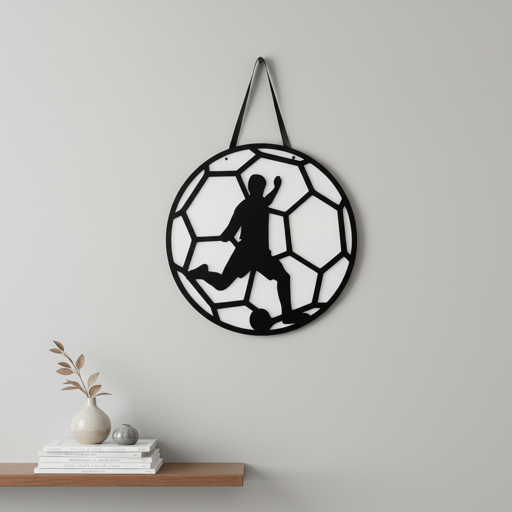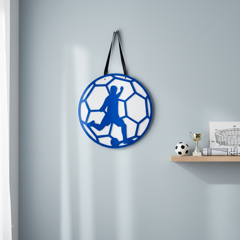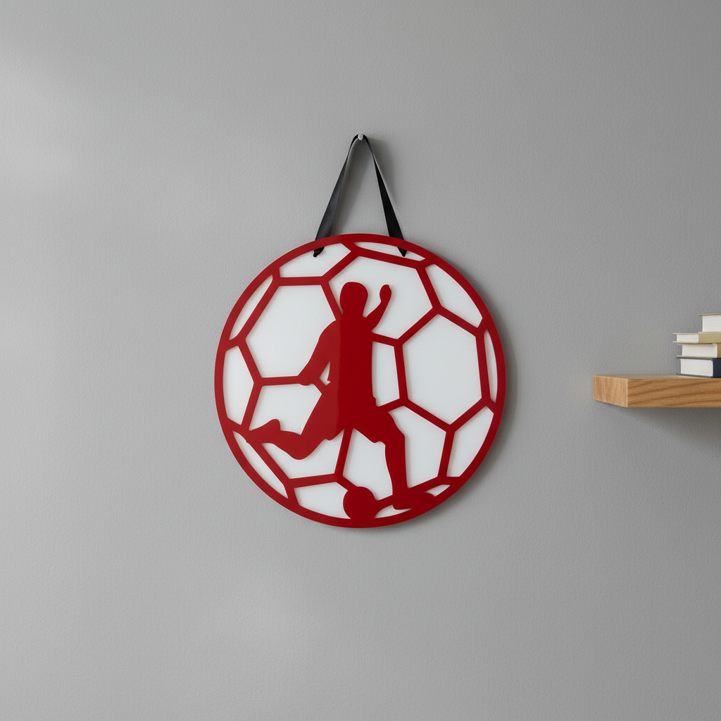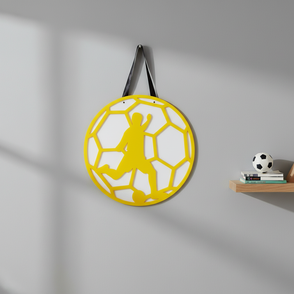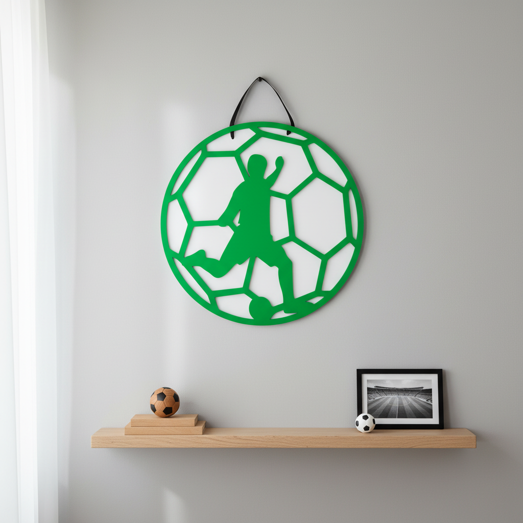 Χειροποίητο καδράκι ποδοσφαίρου από υψηλής ποιότητας πλεξιγκλάς, με εντυπωσιακή λεπτομέρεια στη φιγούρα του ποδοσφαιριστή και το μοτίβο της μπάλας.